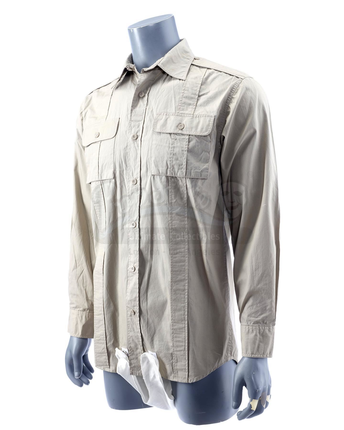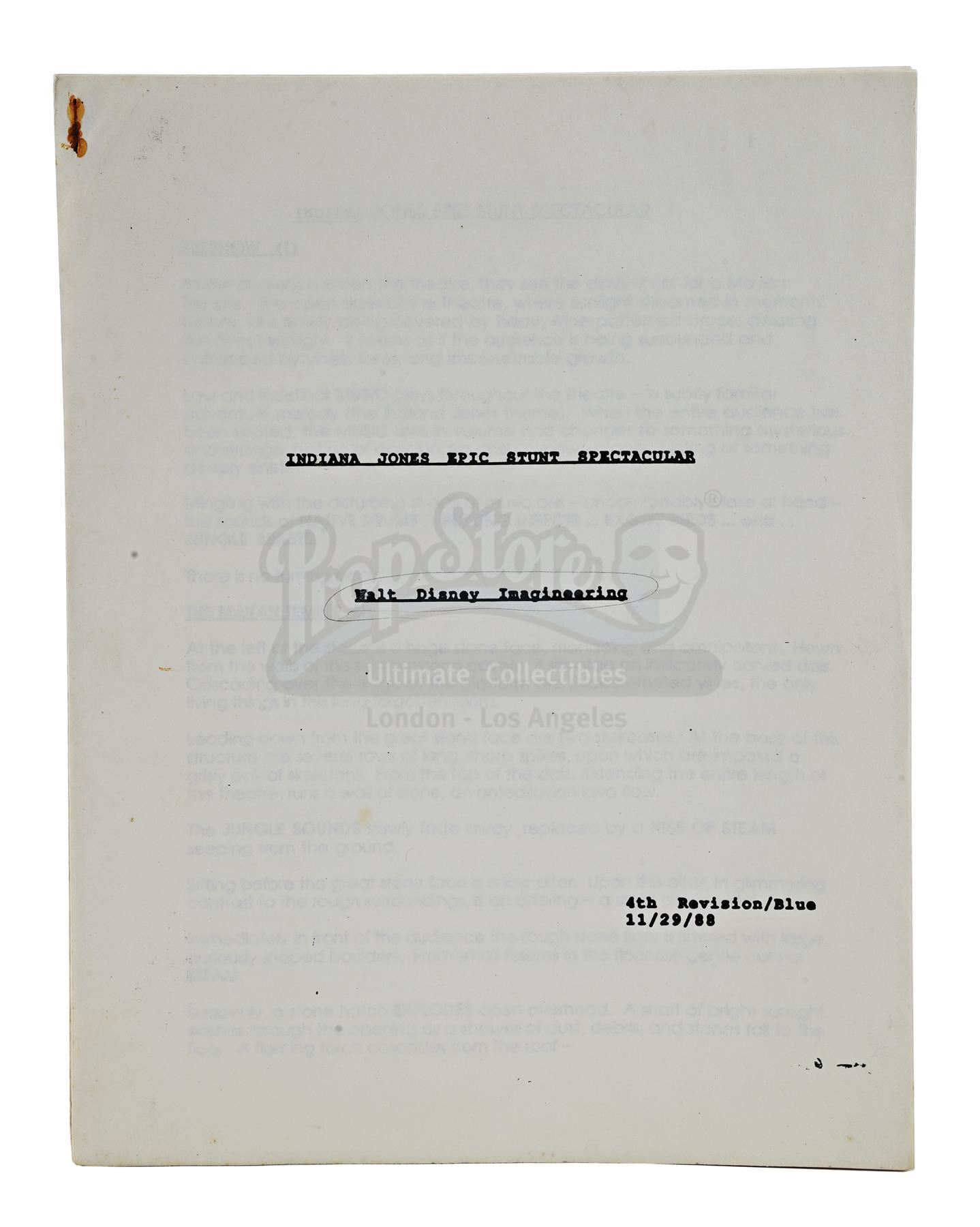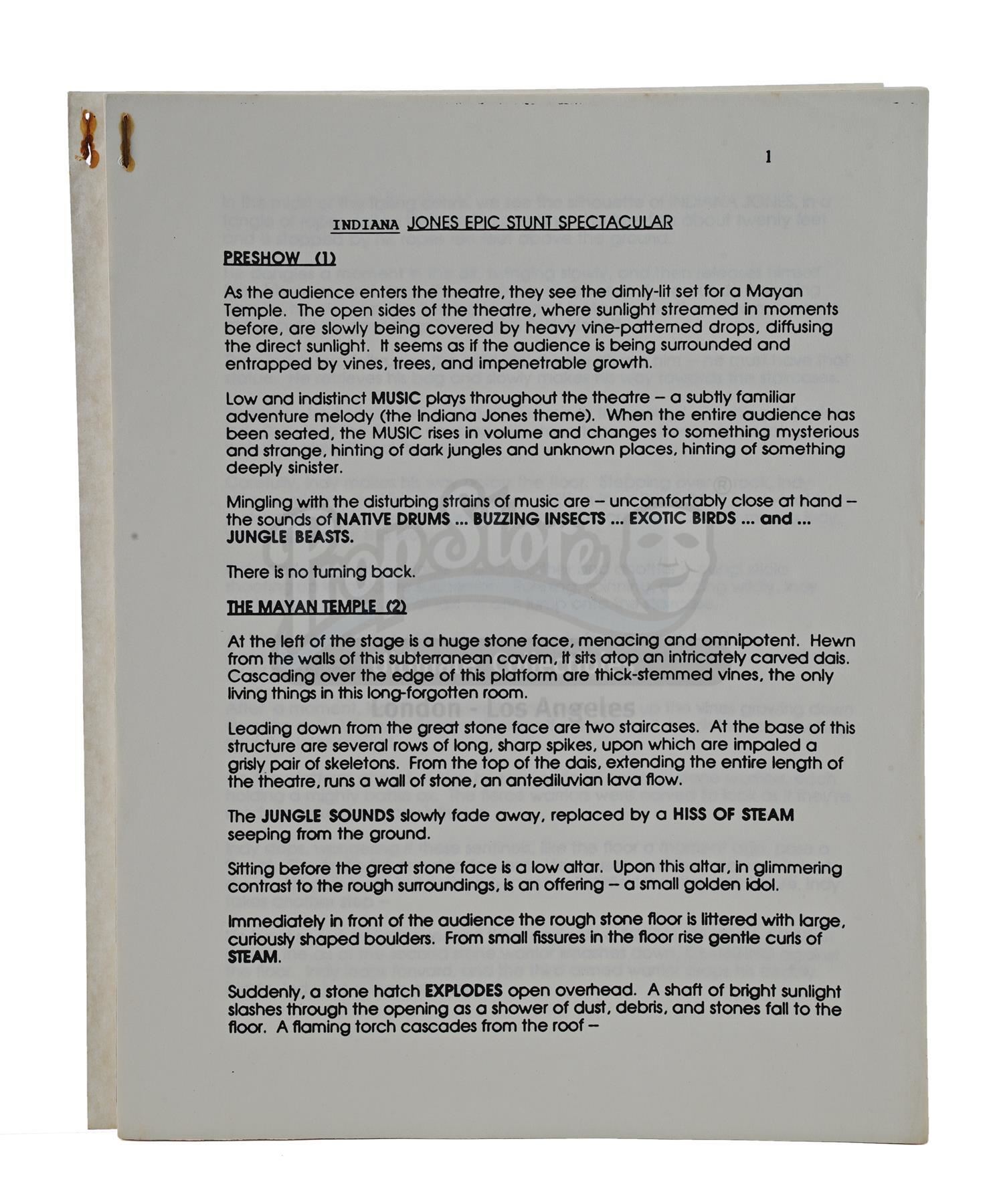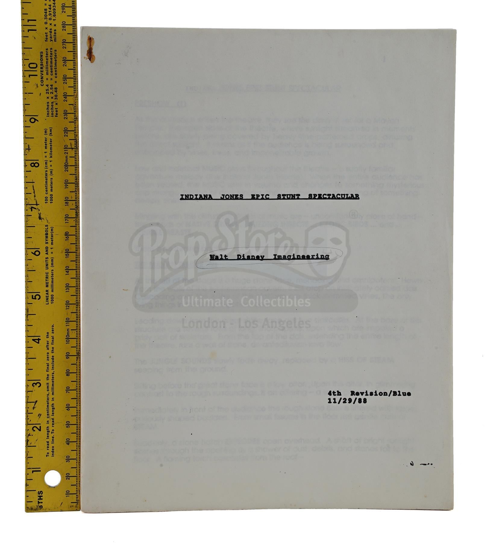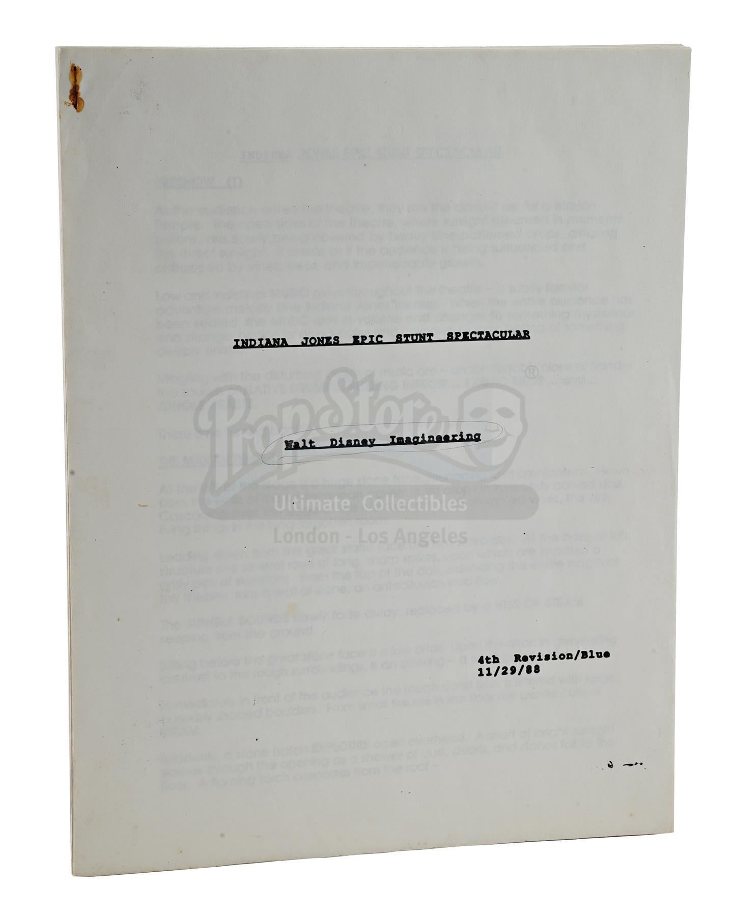 This lot will be auctioned on Wednesday, June 30th. The auction will begin at 9:00am PDT and lots are sold sequentially via live auctioneer; tune in to the live streaming broadcast on auction day to follow the pace. Note other lots in the auction may close on June 29th or July 1st. An Indiana Jones shirt and script from the Indiana Jones Epic Stunt Spectacular! at Disney's Hollywood Studios. In this live-action stunt show, performers recreated classic moments from the film series. This lot consists of a striped tan cotton button-up long-sleeve shirt with metal snaps and a white bottom-flap based on Jones' (Harrison Ford) costumes, as well as a 35-page stapled fourth revision script dated "11/29/88" and credited to Walt Disney Imagineering. It is in good overall condition with loose snaps on the shirt and the title page separating from the script. Dimensions (script): 10" x 8.75" x 1.75" (25.5 cm x 22.25 cm x 4.5 cm) Estimate: $600 - 800