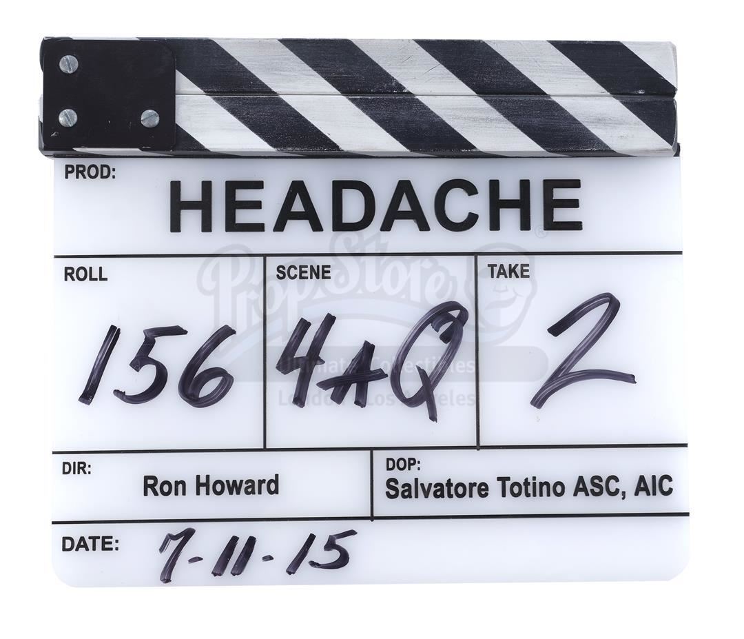 This lot will be auctioned on Wednesday, June 30th. The auction will begin at 9:00am PDT and lots are sold sequentially via live auctioneer; tune in to the live streaming broadcast on auction day to follow the pace. Note other lots in the auction may close on June 29th or July 1st. A "Headache" clapperboard from the production of Ron Howard's 2016 action-adventure sequel Inferno. "Headache" was the production codename for this adaptation of the Dan Brown novel. This black-and-white acrylic clapperboard with a wood slate is labeled for director Howard, director of photography Salvatore Totino, and the shoot date "7-11-15." Roll number "136," scene number "4AQ," and take number "2" are also marked in ink. This lot is in excellent overall condition with some erased ink residue on the acrylic. Dimensions: 11.25" x 9.75" x 1.5" (28.75 cm x 25 cm x 4 cm) Estimate: $600 - 800
