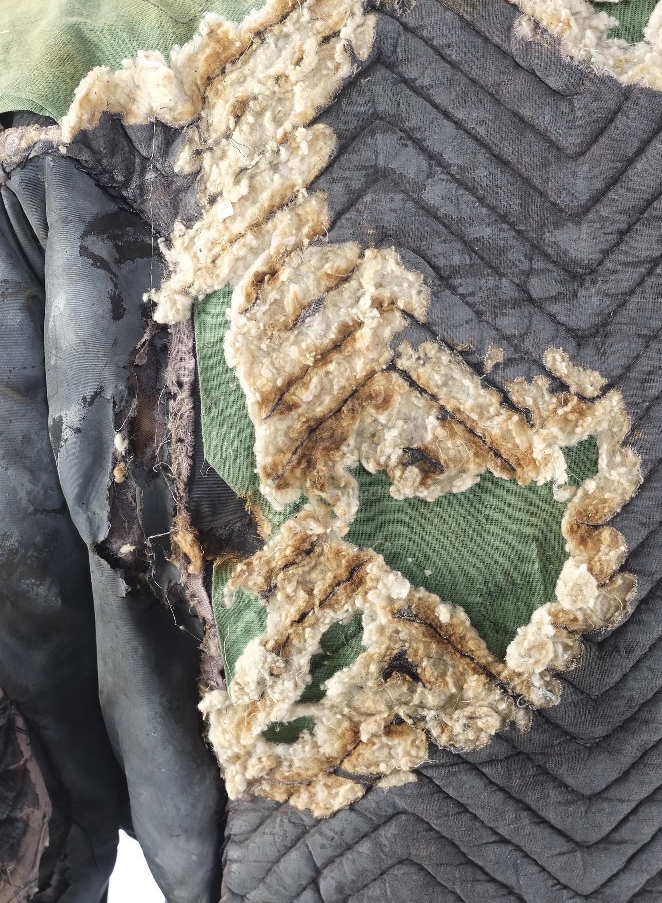 The gray nylon zip-front jacket features quilted panels wrapped over the right shoulder and down the back, zippered pockets on the front and sleeves, a black leather collar, a white nylon nametag on the left chest with black writing reading "K RE DN38416", and black elastic wrist and waistbands. The jacket was intentionally weathered by production to simulate extensive damage, including stains, burns, and large tears revealing white woolen insulation and an underlayer of green fabric. The jacket is in excellent overall condition with minimal wear from production and age.