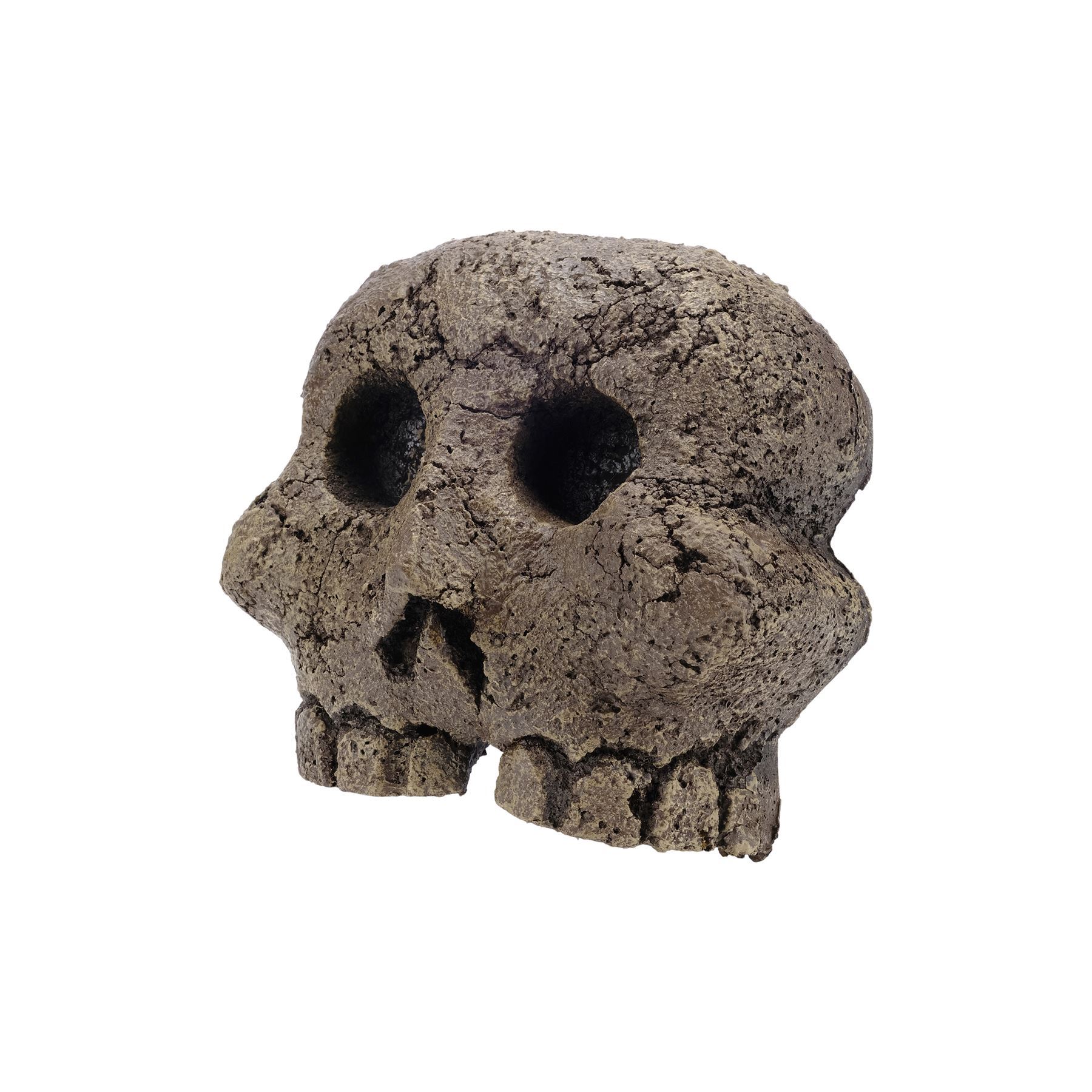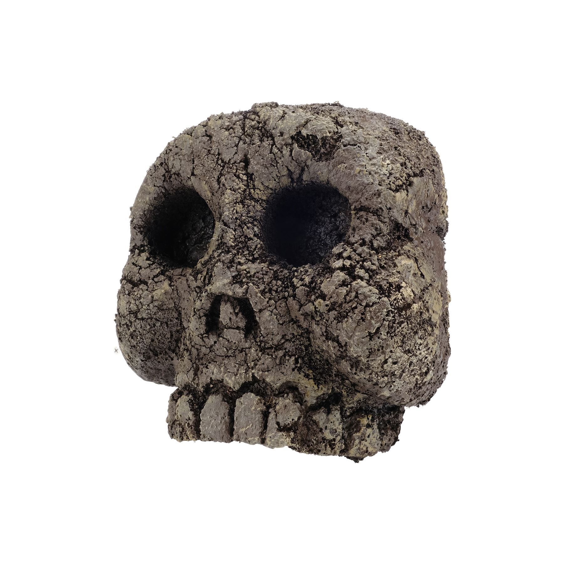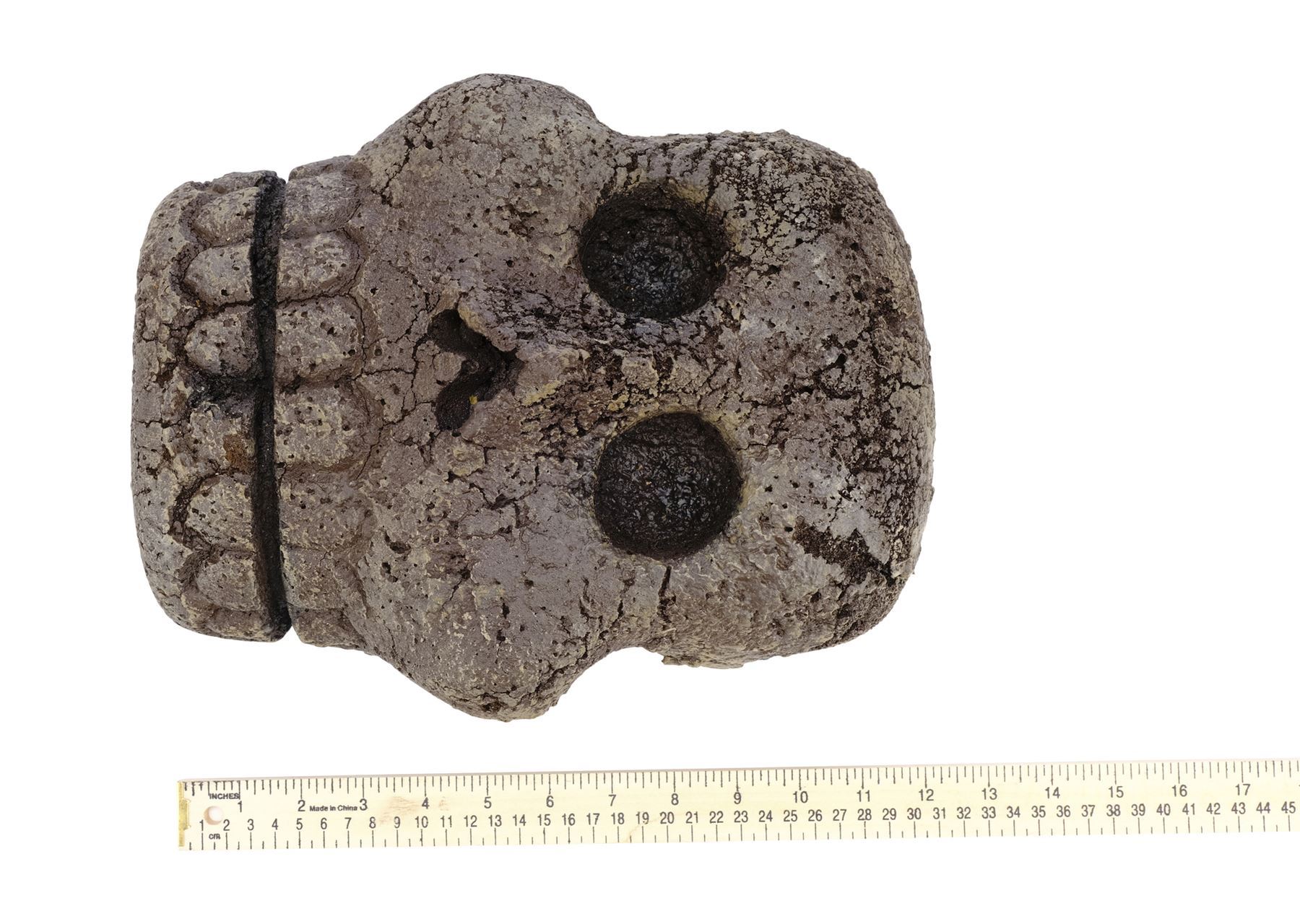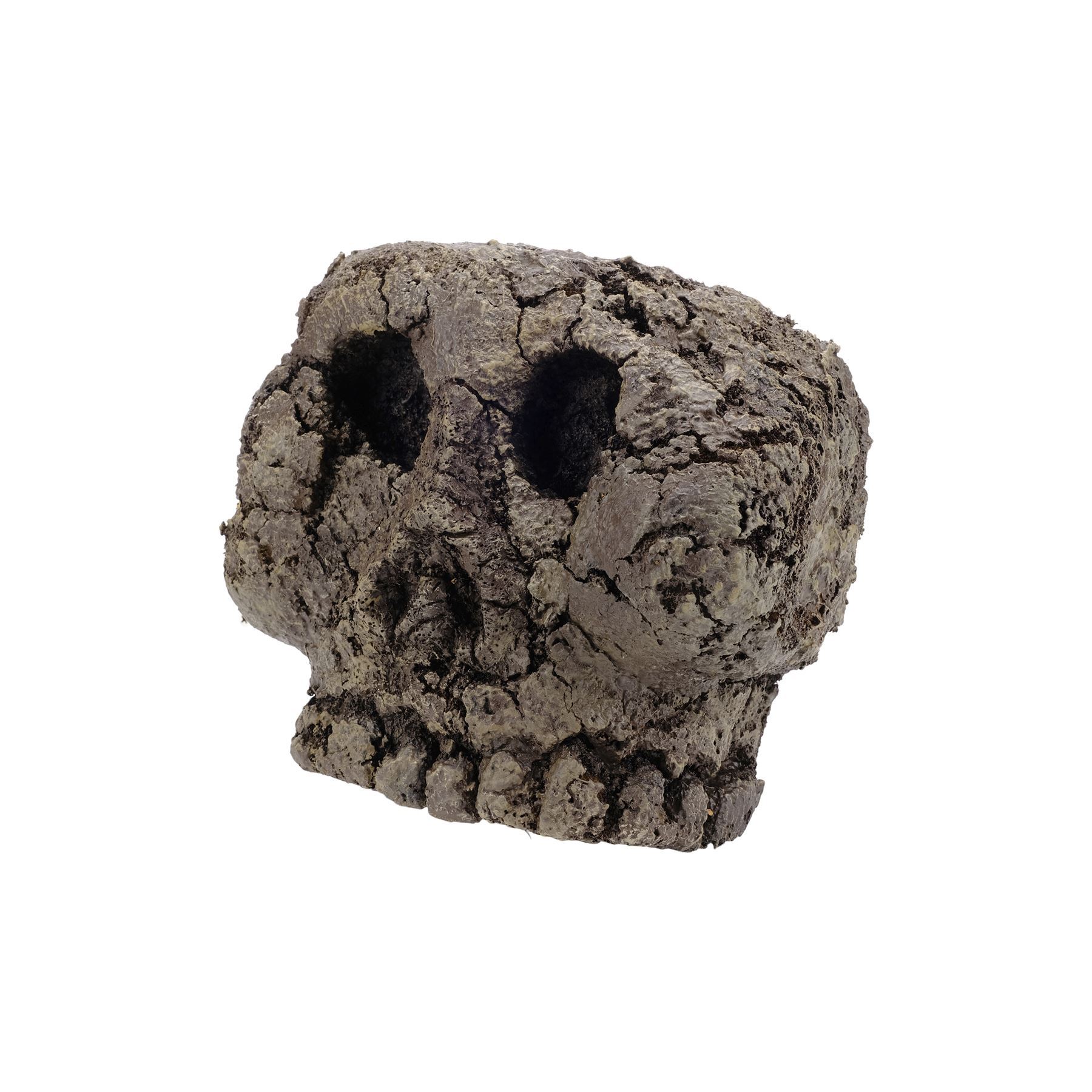 These four skulls and one metal wall sconce come from the collection of on-set dresser McPherson O. Downs. Made of foam, the skulls feature stone-textured fronts painted in various shades of brown and gray to resemble rock. Production distressed these skulls and sconce to give the appearance of age and wear. This lot exhibits discoloration, rust, minor chipping, and cracks in the foam. Dimensions: (each) 12" x 10" x 4" (30.5 cm x 25.5 cm x 10.24 cm)