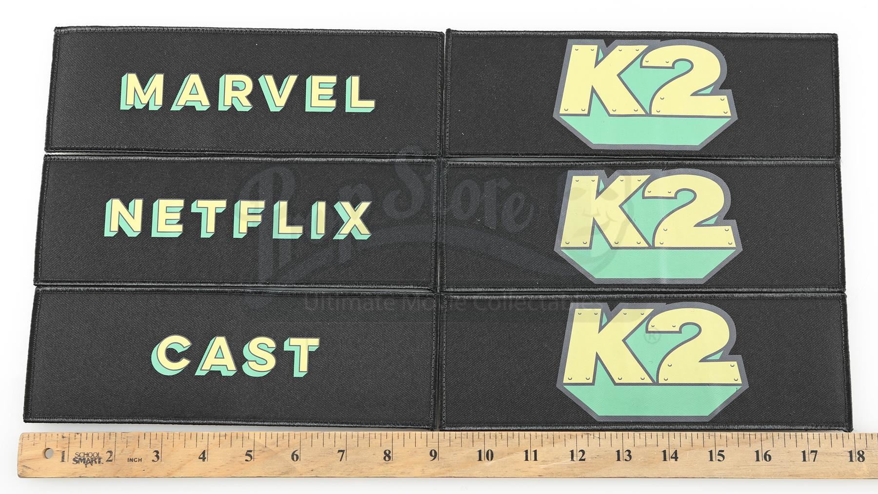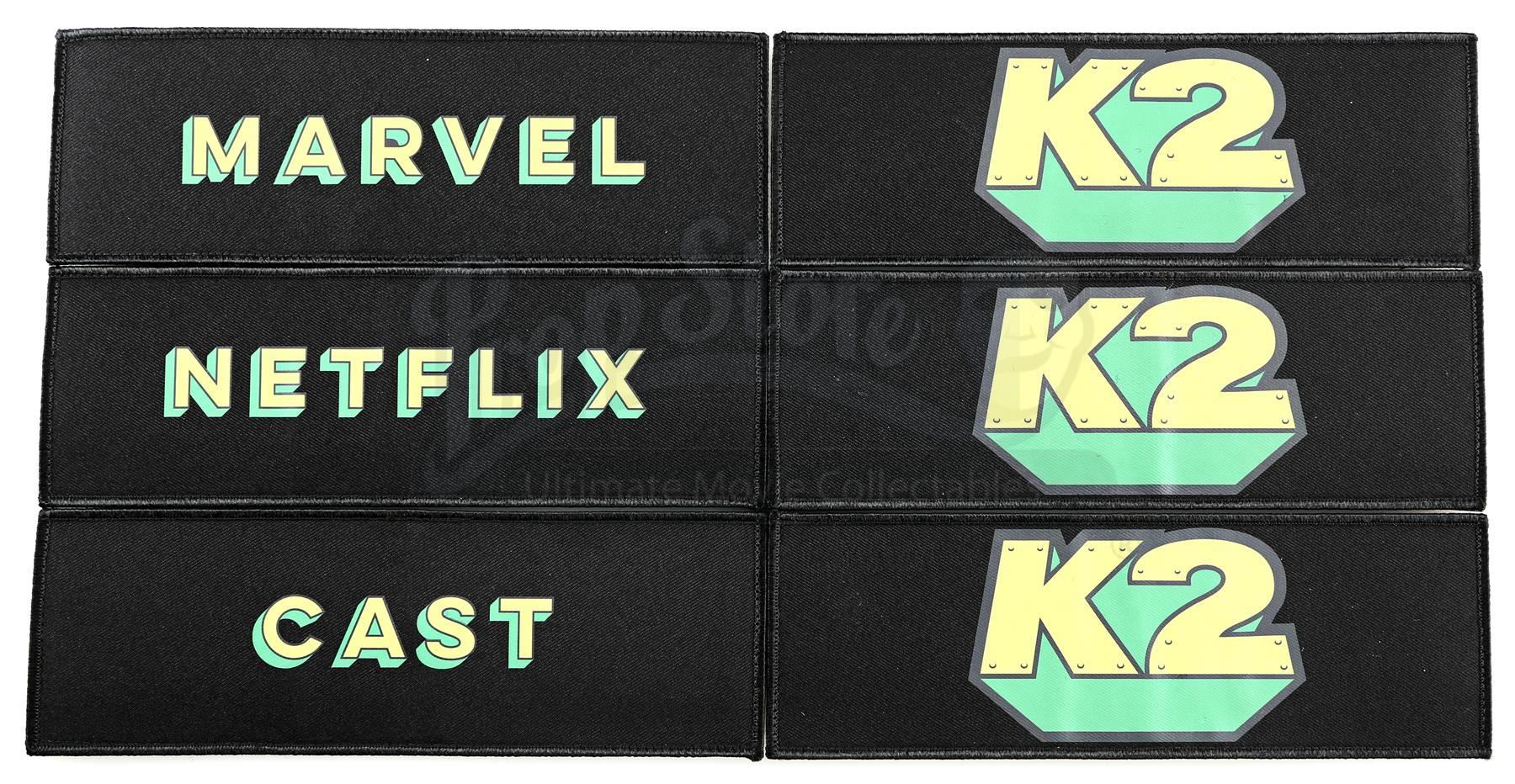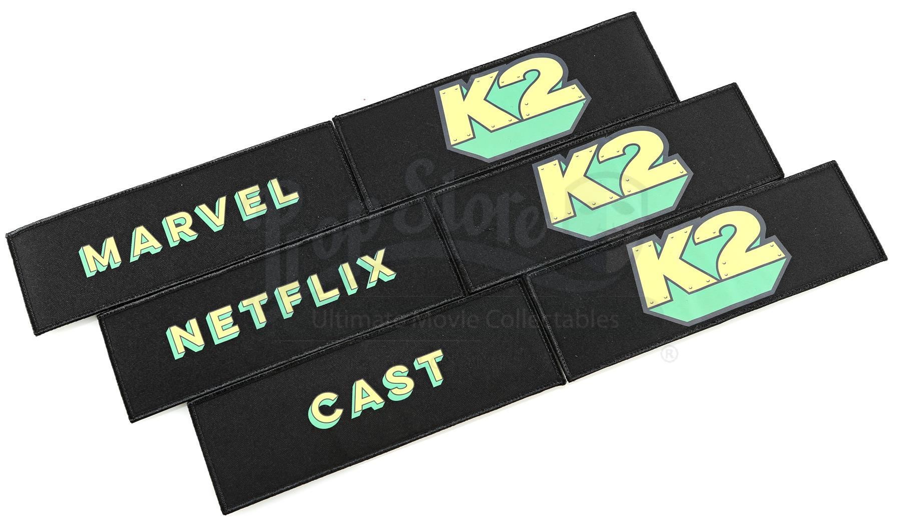 Production crew chair backs from Season 2 of Marvel’s Iron Fist. This lot consists of six black canvas chair backs with fastening strip closures used during the production of the series by various members of the crew. Three feature a yellow and green ‘K2’ graphic, referring to the series production codename ‘Kick’, while the others are emblazoned ‘NETFLIX’, ‘MARVEL’, and ‘CAST’ in matching colors and font. The lot is in good overall condition with minor wear from production and the fastening strip safety backing still attached.