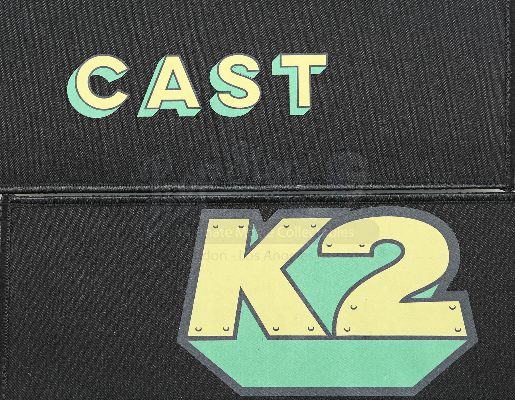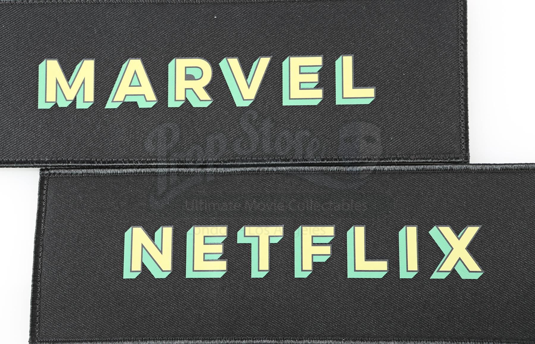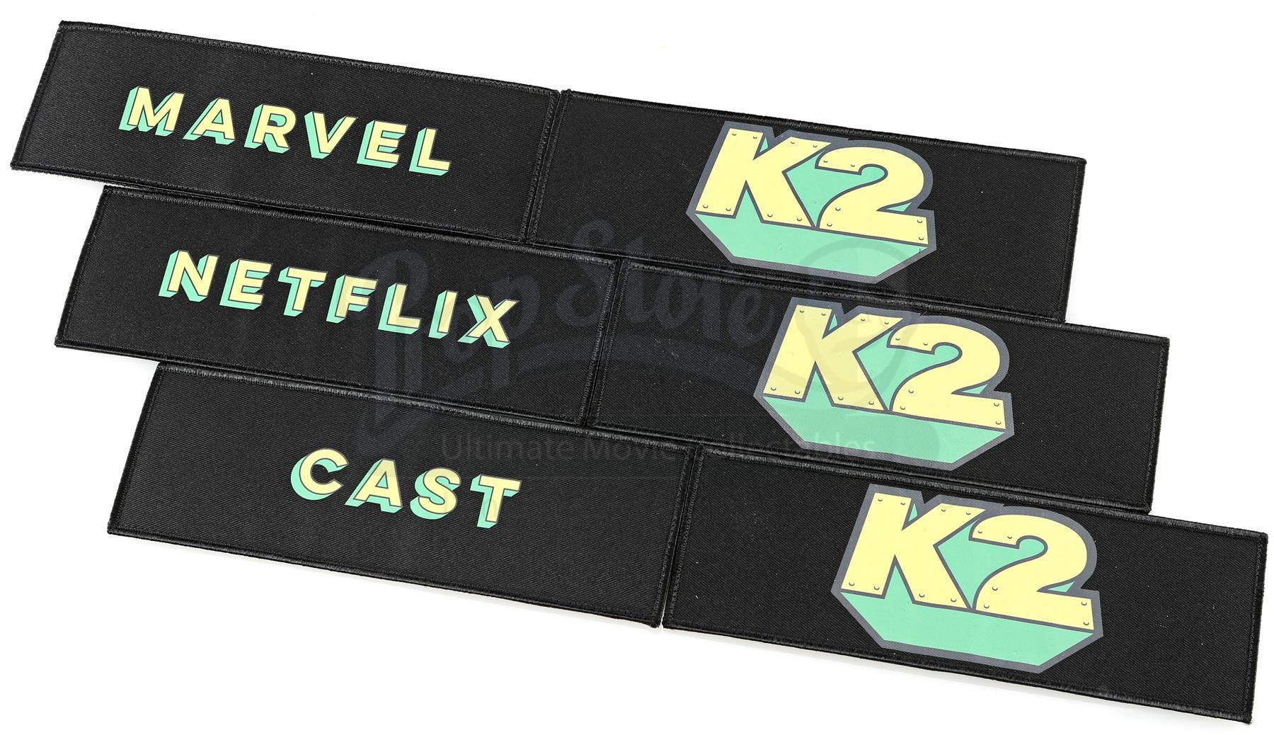 Production crew chair backs from Season 2 of Marvel’s Iron Fist. This lot consists of six black canvas chair backs with fastening strip closures used during the production of the series by various members of the crew. Three feature a yellow and green ‘K2’ graphic, referring to the series production codename ‘Kick’, while the others are emblazoned ‘NETFLIX’, ‘MARVEL’, and ‘CAST’ in matching colors and font. The lot is in good overall condition with minor wear from production and the fastening strip safety backing still attached.
