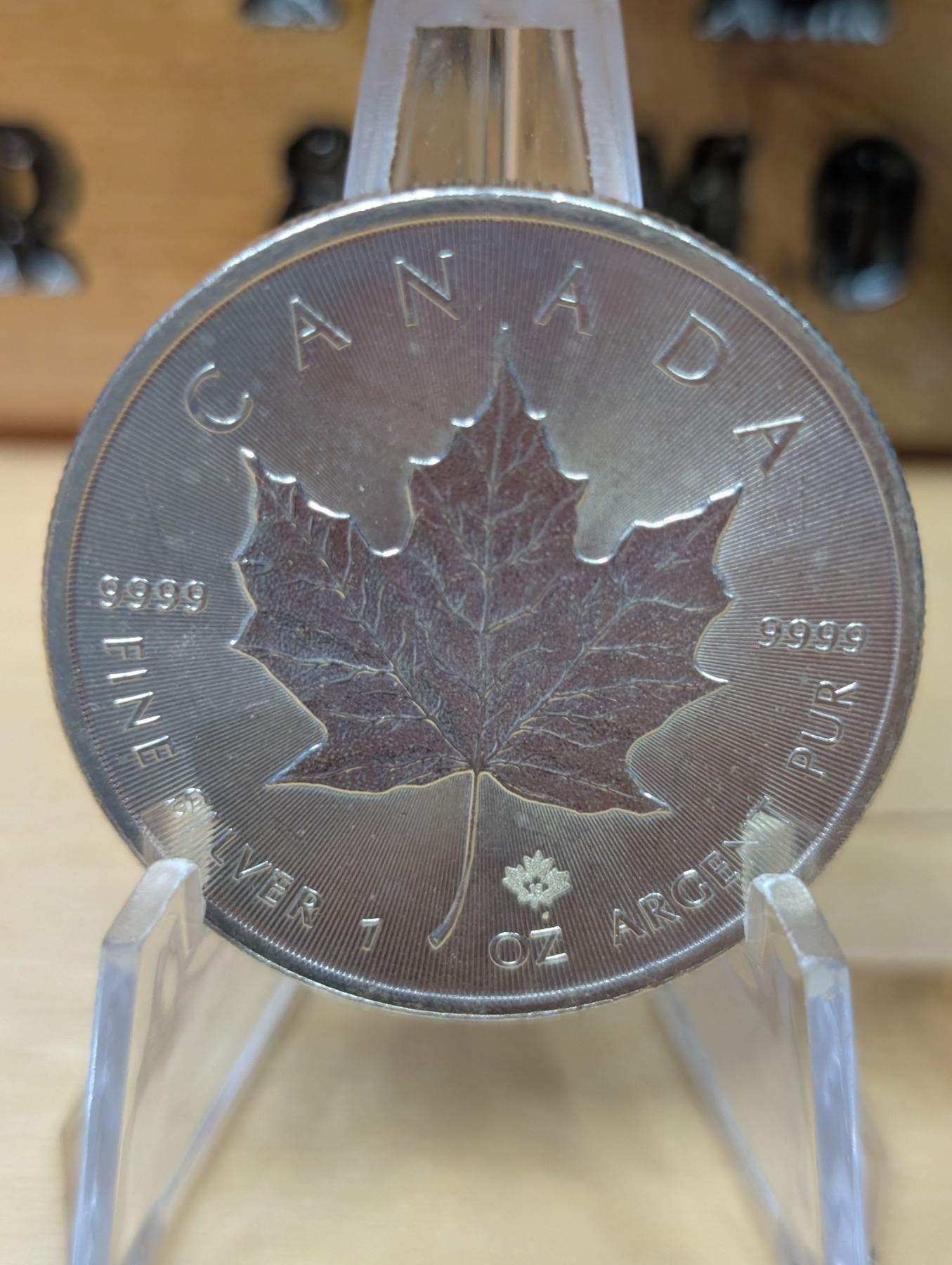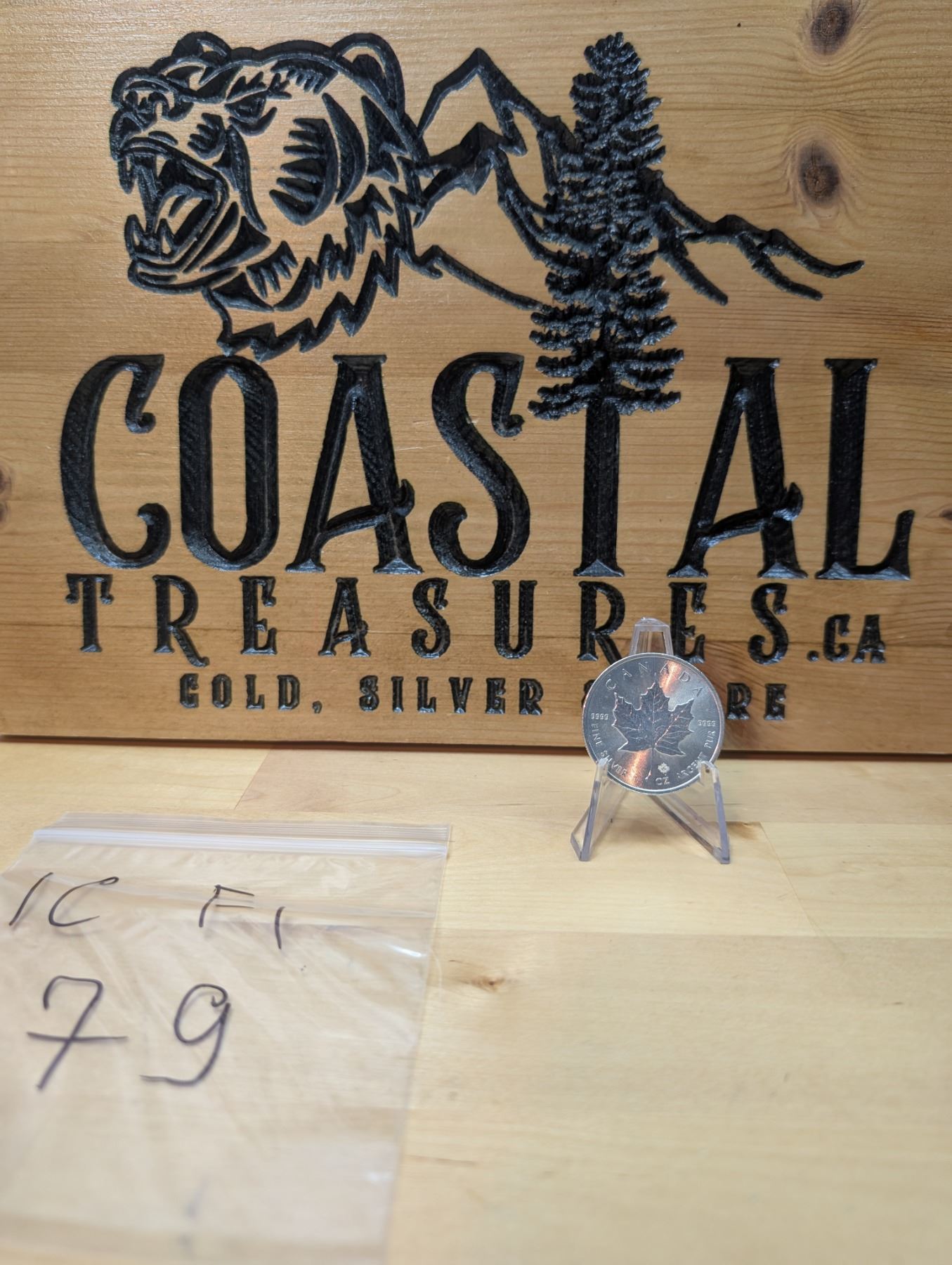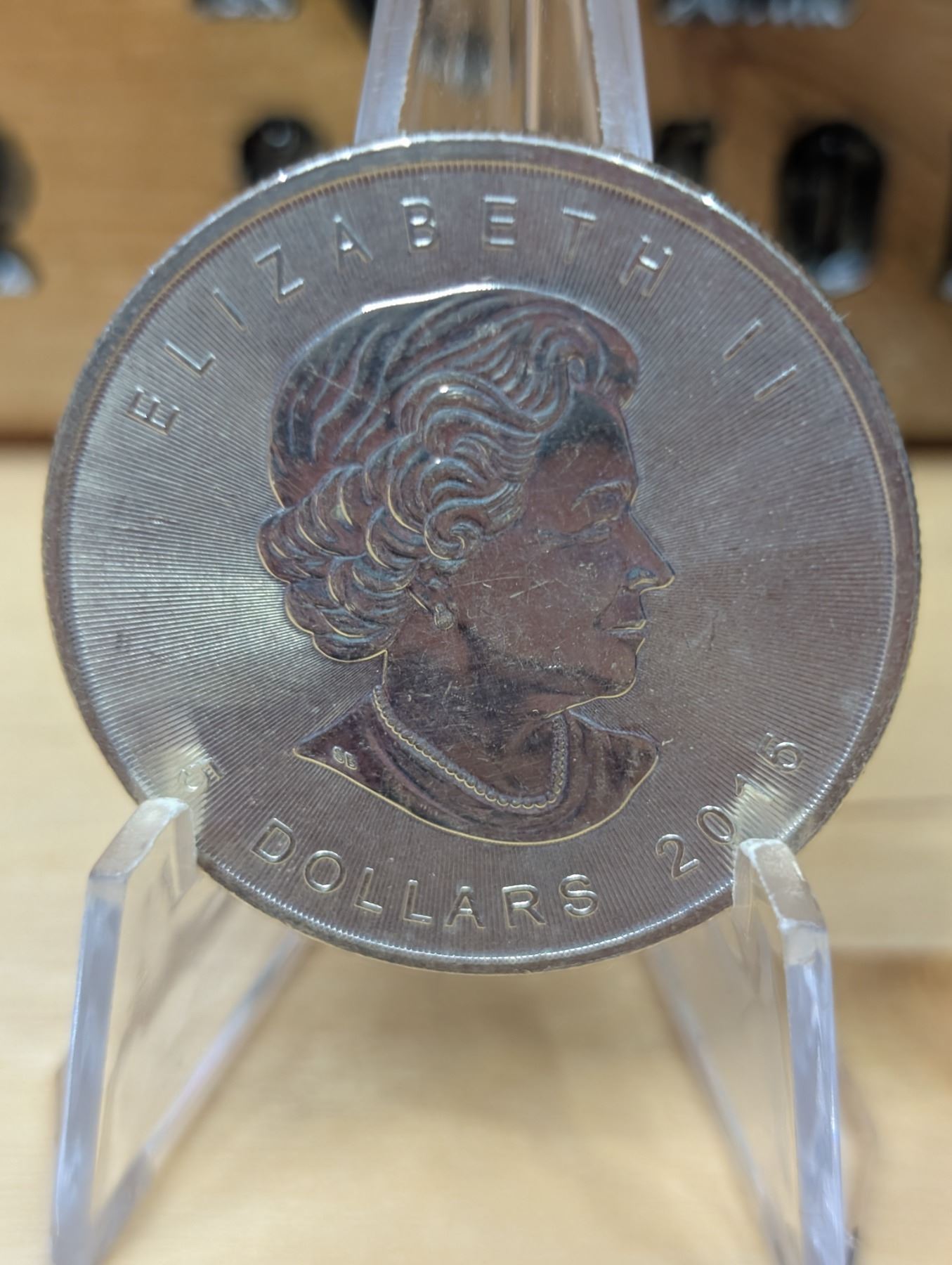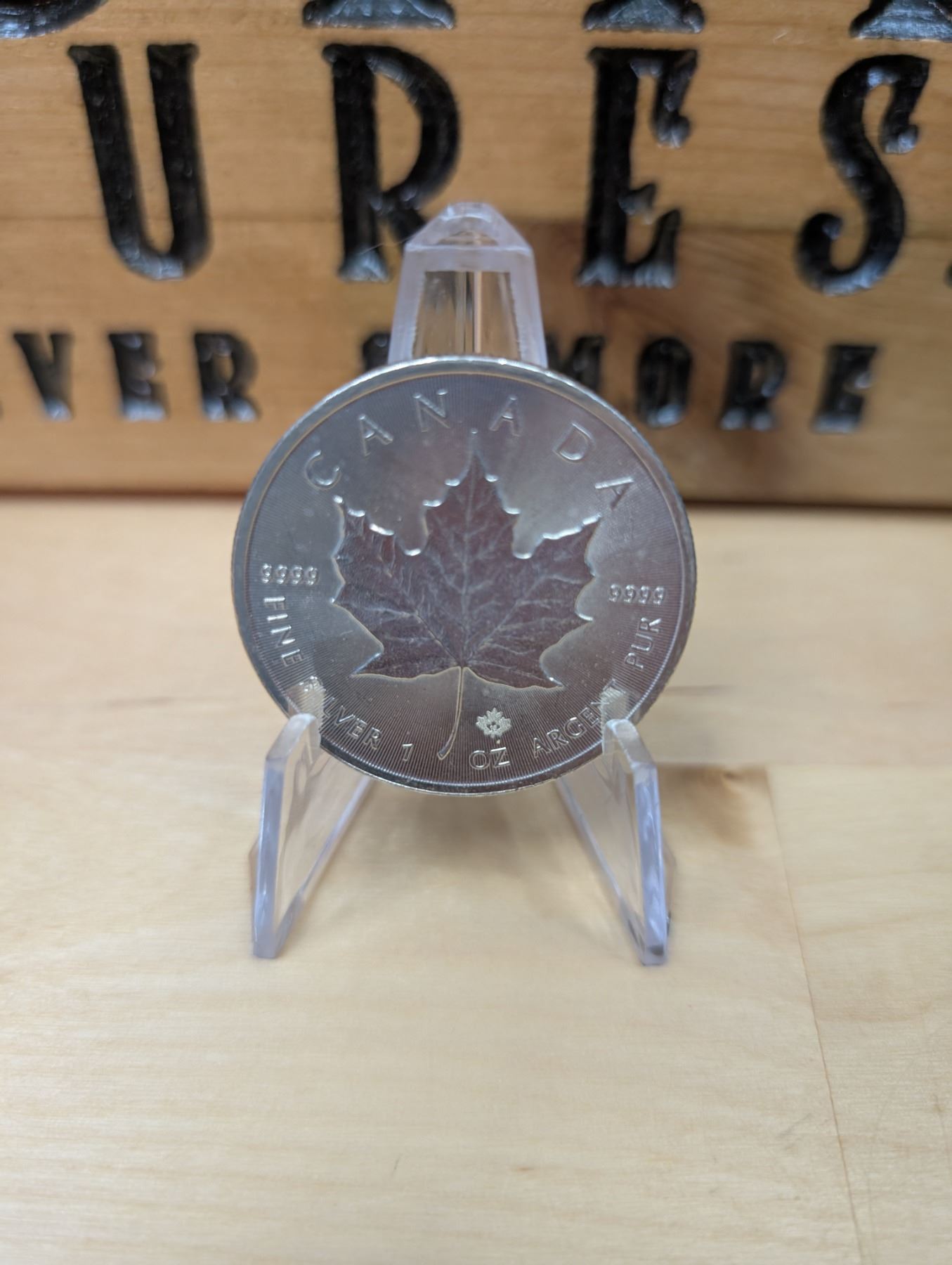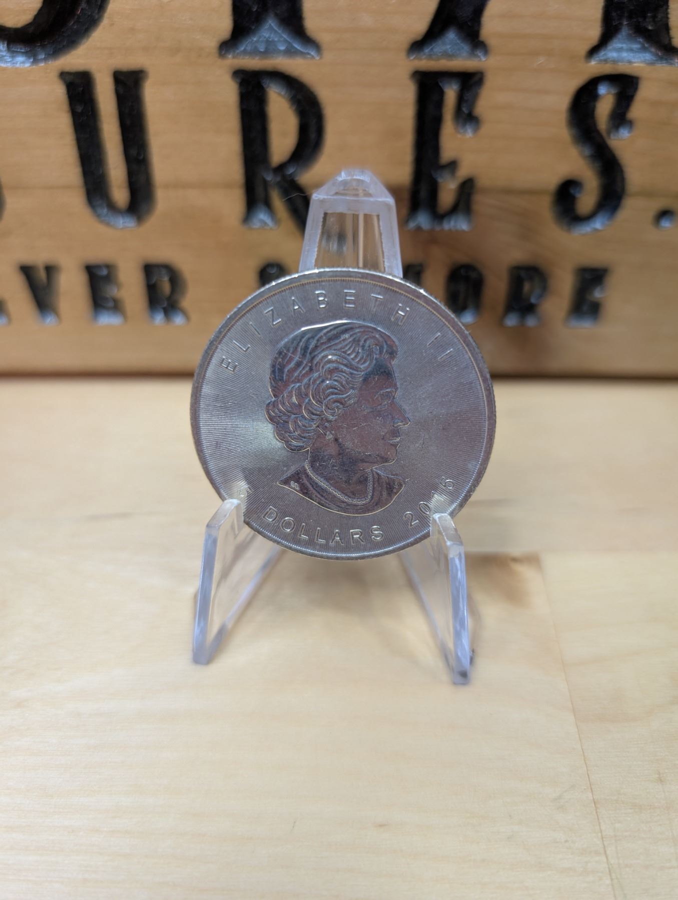 The 1 oz 2015 Canadian Maple Leaf Silver Coin is made of 99.99% pure silver and features a maple leaf design on the reverse and Queen Elizabeth II on the obverse. It includes a security feature in the form of a micro-engraved maple leaf. The coin is popular with both collectors and investors