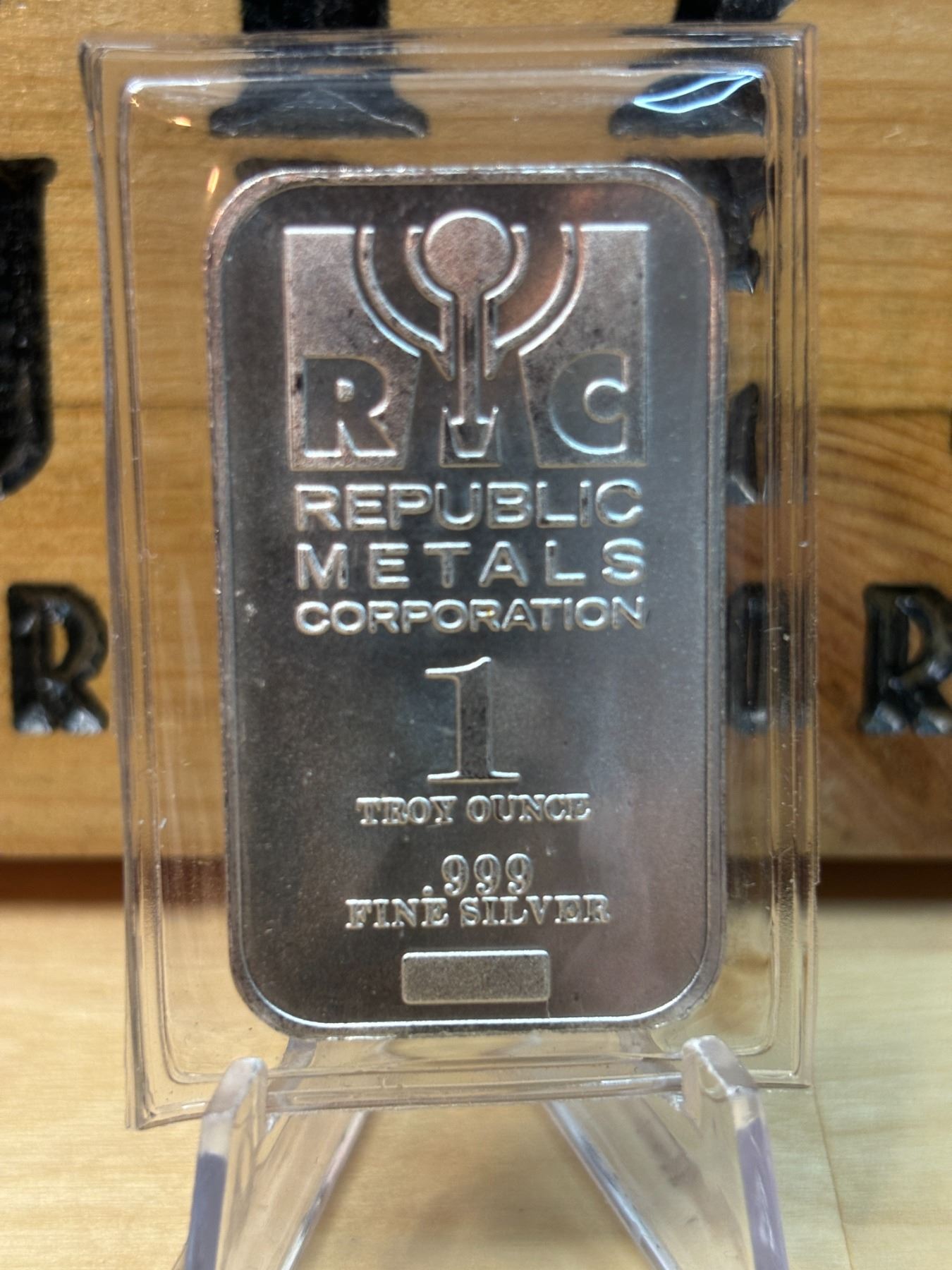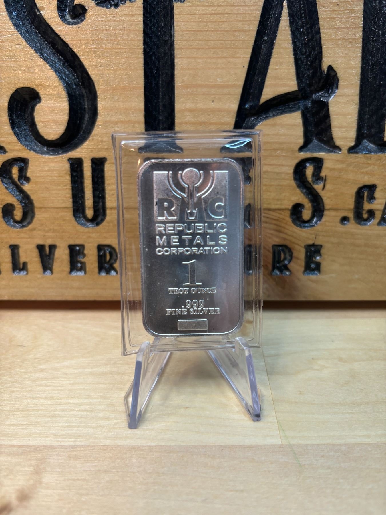 The 1 oz RMC Silver Bar is a 1-ounce silver bar made from 99.9% pure silver. RMC stands for Republic Metals Corporation, a well-known and respected refiner of precious metals. These bars typically feature the RMC logo, along with information such as weight, purity, and sometimes a unique serial number. They are highly sought after by investors and collectors due to their recognizable branding, high-quality silver content, and compact size. The 1 oz RMC silver bar is often valued both for its silver purity and the trust associated with the Republic Metals brand.