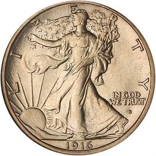 1916-S Liberty Walking Half Dollar. From center to periphery the intense radiant silvery luster glows with soft, velvety texture of the high-end 1916 issue. What's more, substantial detail to the highpoints on this fine example means that it is very sharp and detailed, which adds another gold star to the excitement of owning such a coin. (#6568)