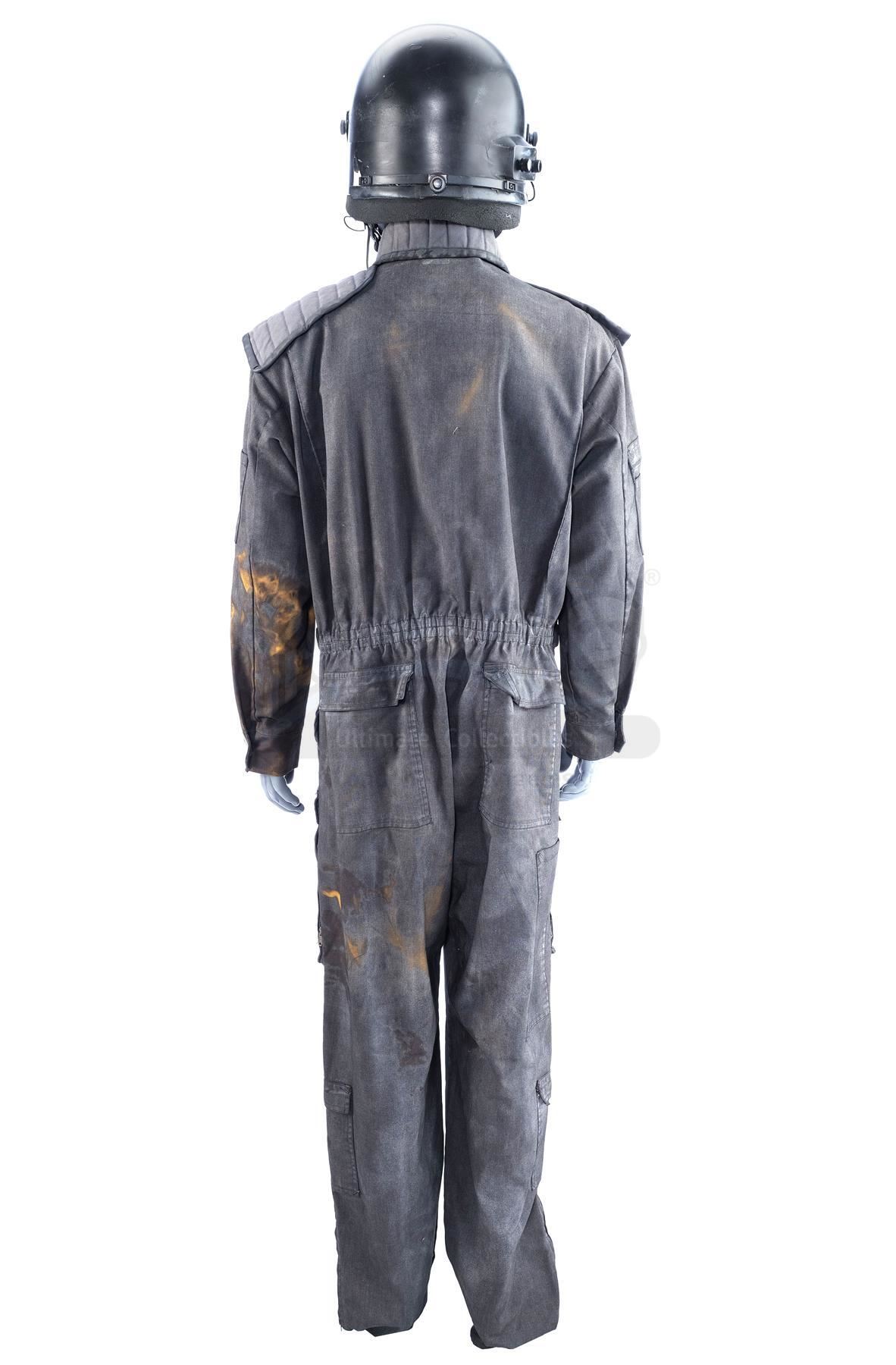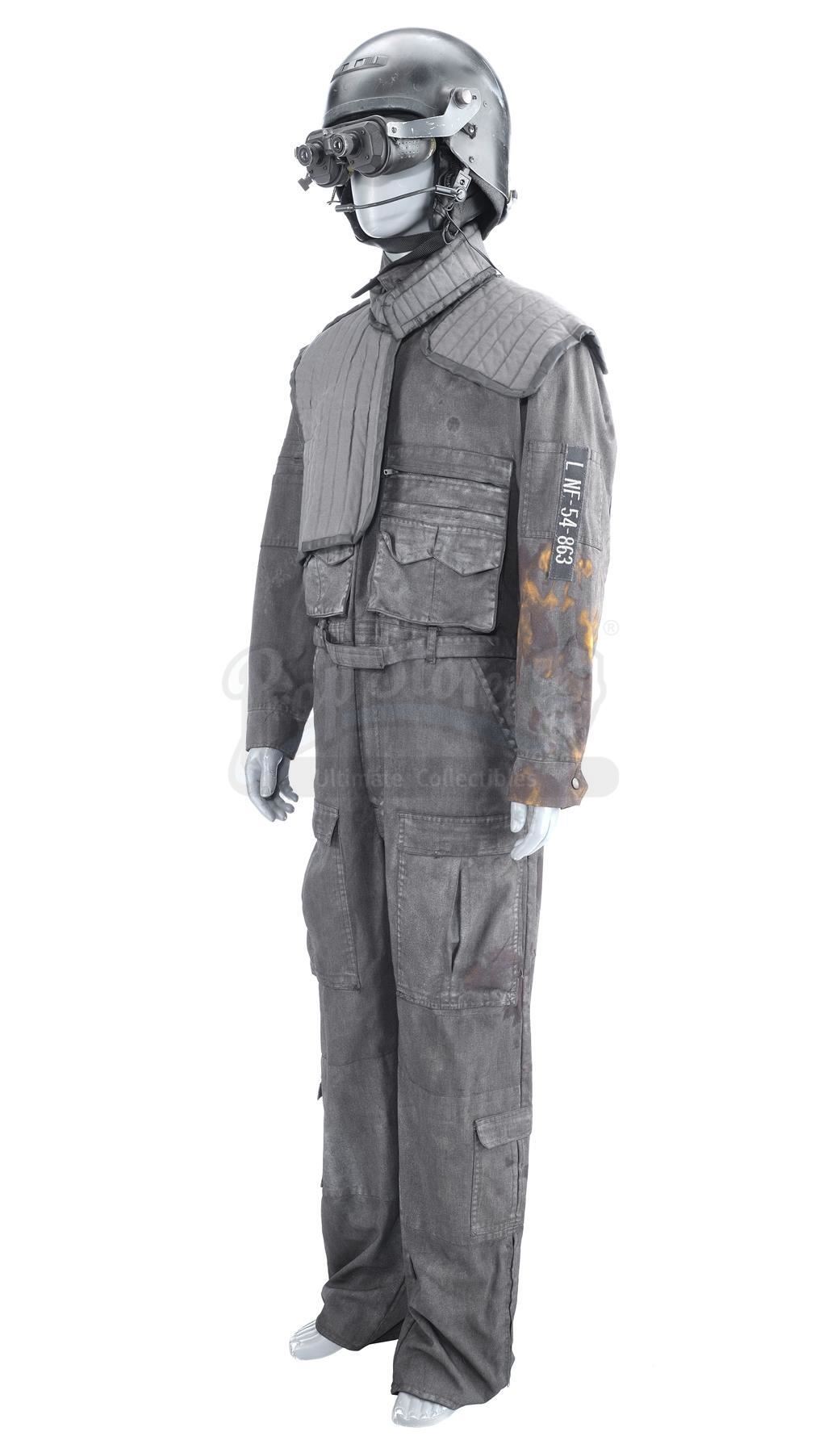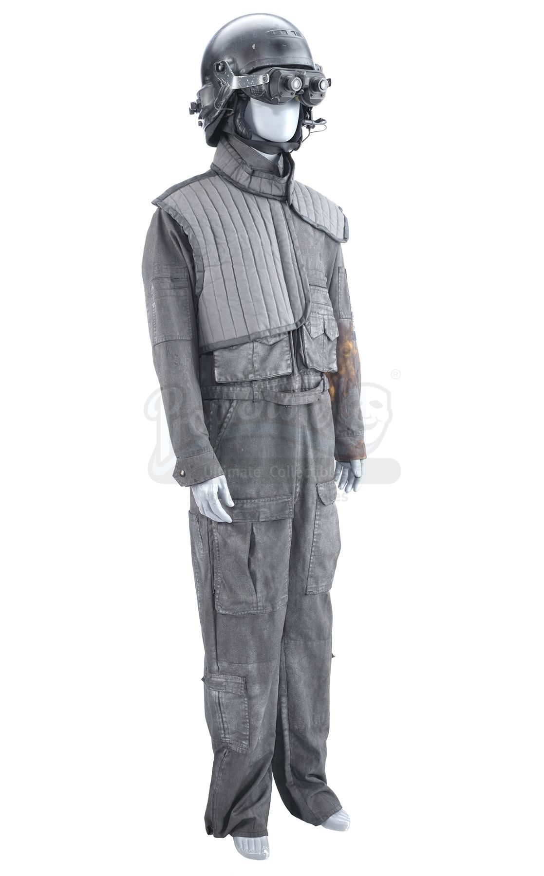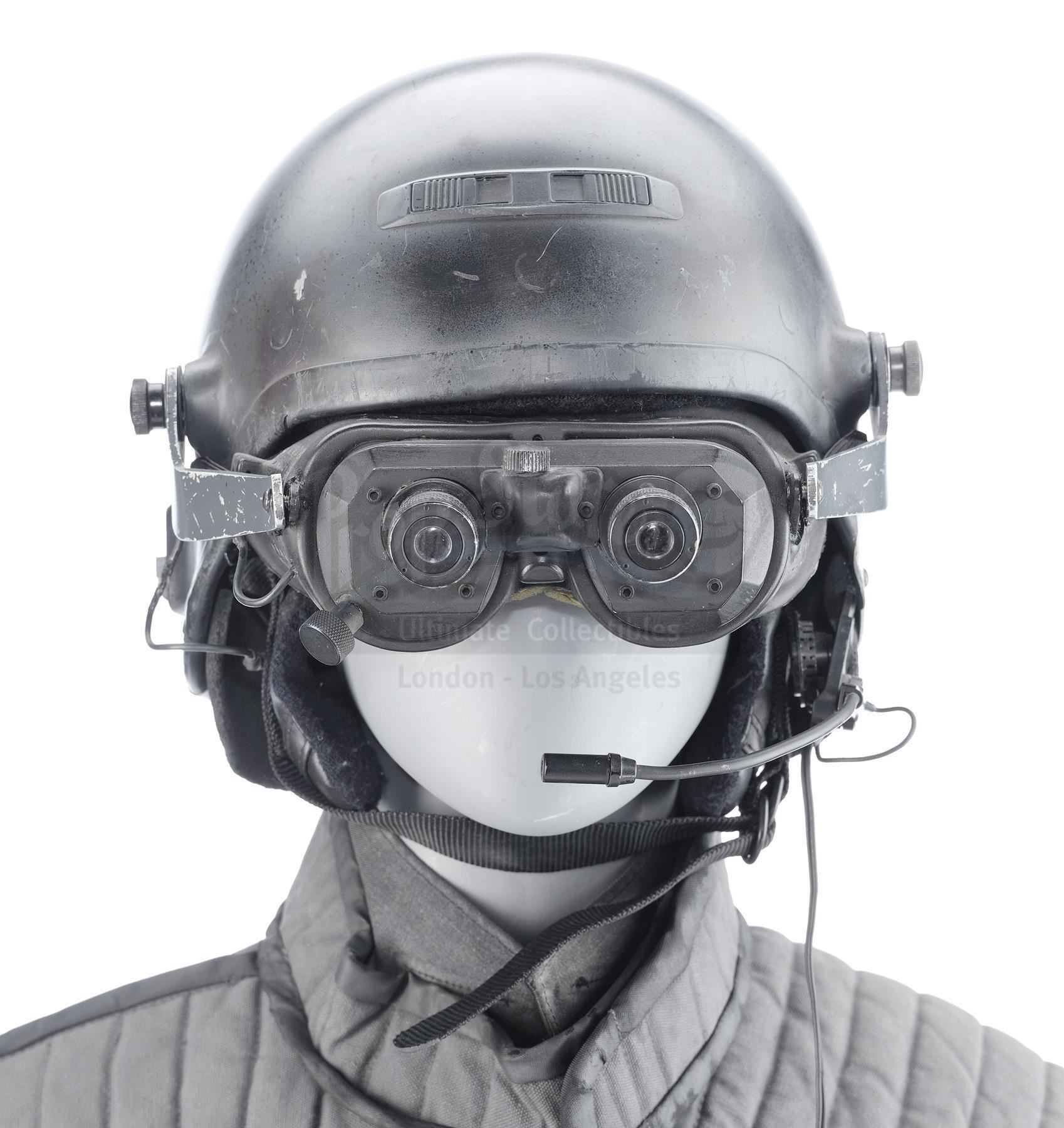 The uniform consists of a dark gray, cotton-blend jumpsuit with an elastic waist, zip-front, collar snap, various pockets throughout, and a sewn-on patch reading "L NF-54-863." Attached to the jumpsuit is a section of ribbed nylon-blend padding that covers the right chest, left shoulder, and wraps around the collar with a Velcro fastening. The metal helmet is painted dark gray to match the uniform, and features added details such as knobs and switches, a padded interior, a microphone with a long audio plug, and a pair of prop night-vision goggles on adjustable arms that allow them to be raised and lowered. Inside the helmet is a piece of tape with the number "8" handwritten on it and labels including one listing the month and year as "NOV 1990." The prop gun is a plastic Muzzelite bullpup stock with an attachable scope. The lot is in good overall condition with some wear from production and age, including scuffs and cracks to the plastic elements of the helmet and gun, loose wires in the helmet, Ruger parts and ammunition clip missing from the gun, and extensive staining to the jumpsuit both from intentional distressing and general wear.