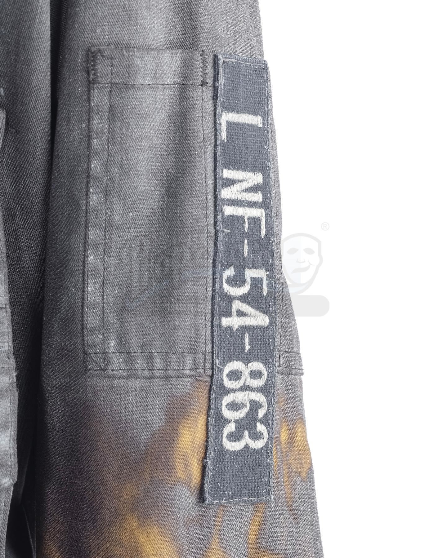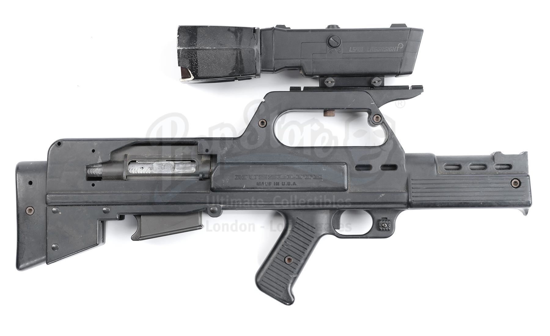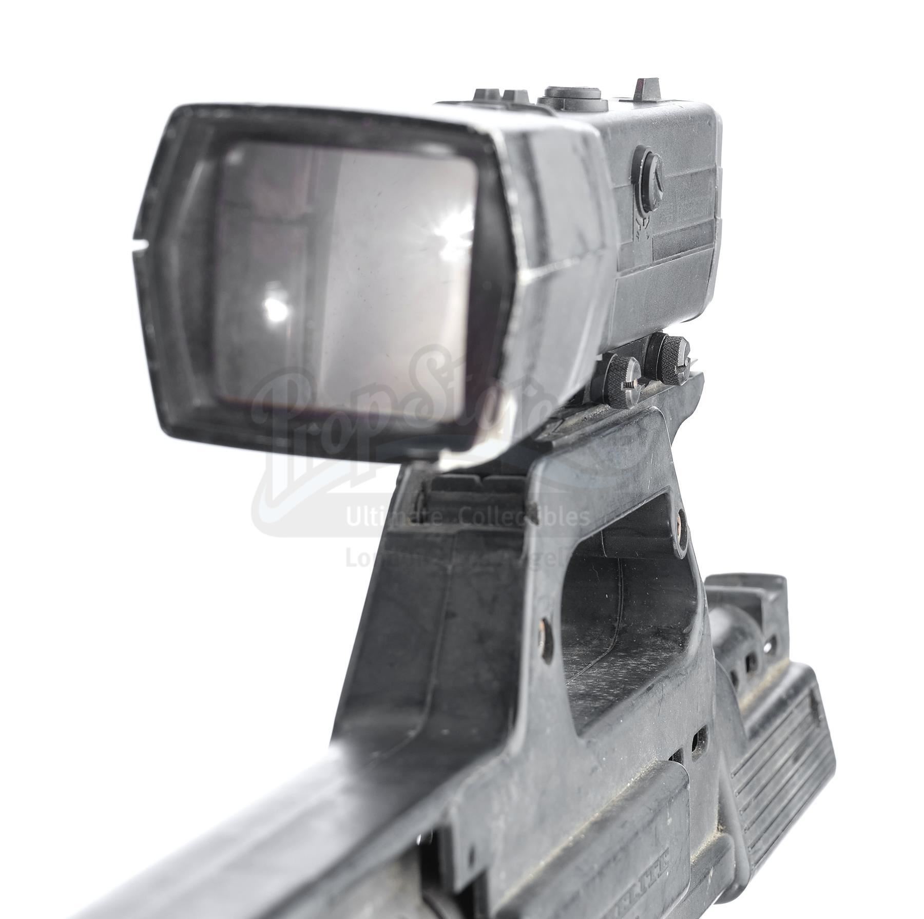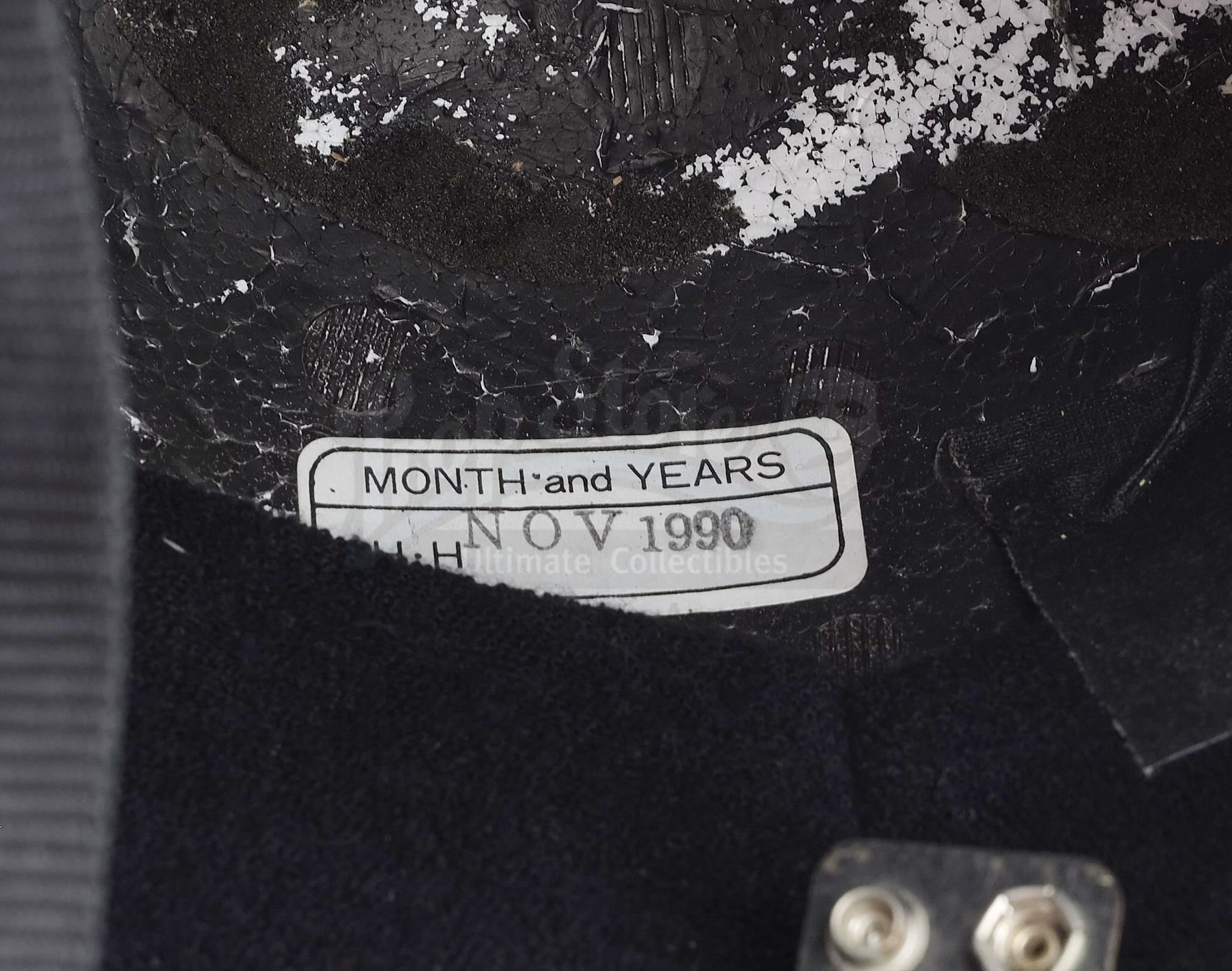 The uniform consists of a dark gray, cotton-blend jumpsuit with an elastic waist, zip-front, collar snap, various pockets throughout, and a sewn-on patch reading "L NF-54-863." Attached to the jumpsuit is a section of ribbed nylon-blend padding that covers the right chest, left shoulder, and wraps around the collar with a Velcro fastening. The metal helmet is painted dark gray to match the uniform, and features added details such as knobs and switches, a padded interior, a microphone with a long audio plug, and a pair of prop night-vision goggles on adjustable arms that allow them to be raised and lowered. Inside the helmet is a piece of tape with the number "8" handwritten on it and labels including one listing the month and year as "NOV 1990." The prop gun is a plastic Muzzelite bullpup stock with an attachable scope. The lot is in good overall condition with some wear from production and age, including scuffs and cracks to the plastic elements of the helmet and gun, loose wires in the helmet, Ruger parts and ammunition clip missing from the gun, and extensive staining to the jumpsuit both from intentional distressing and general wear.