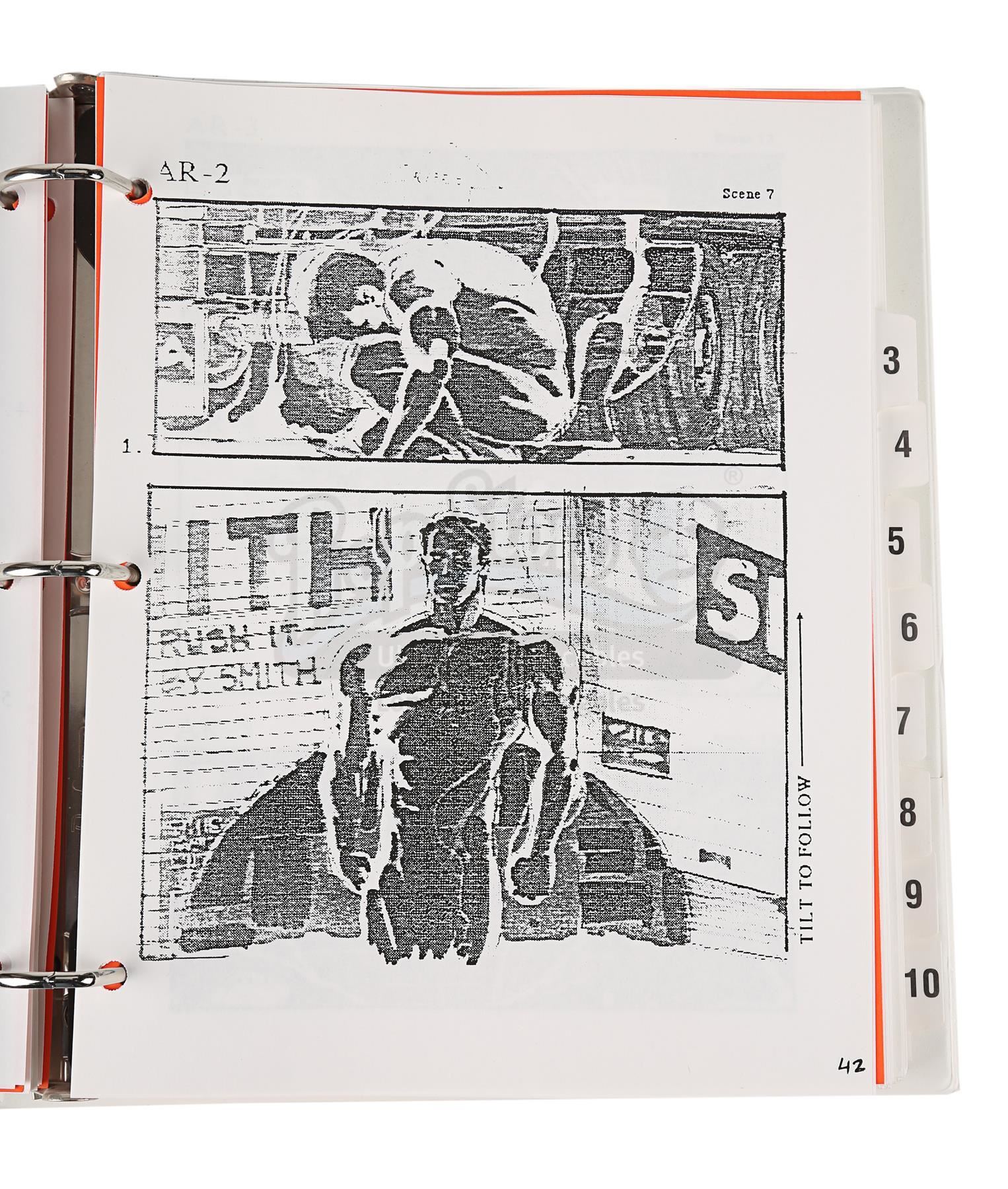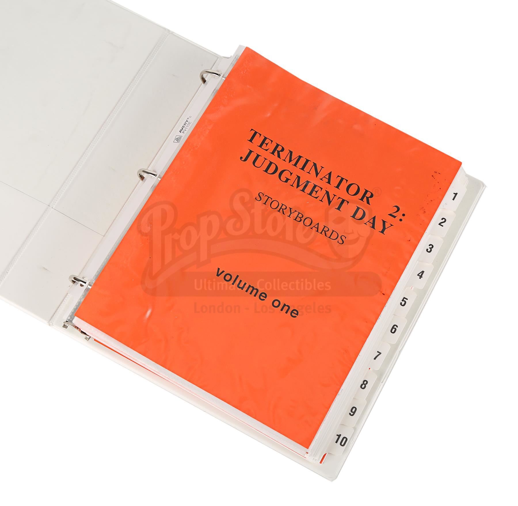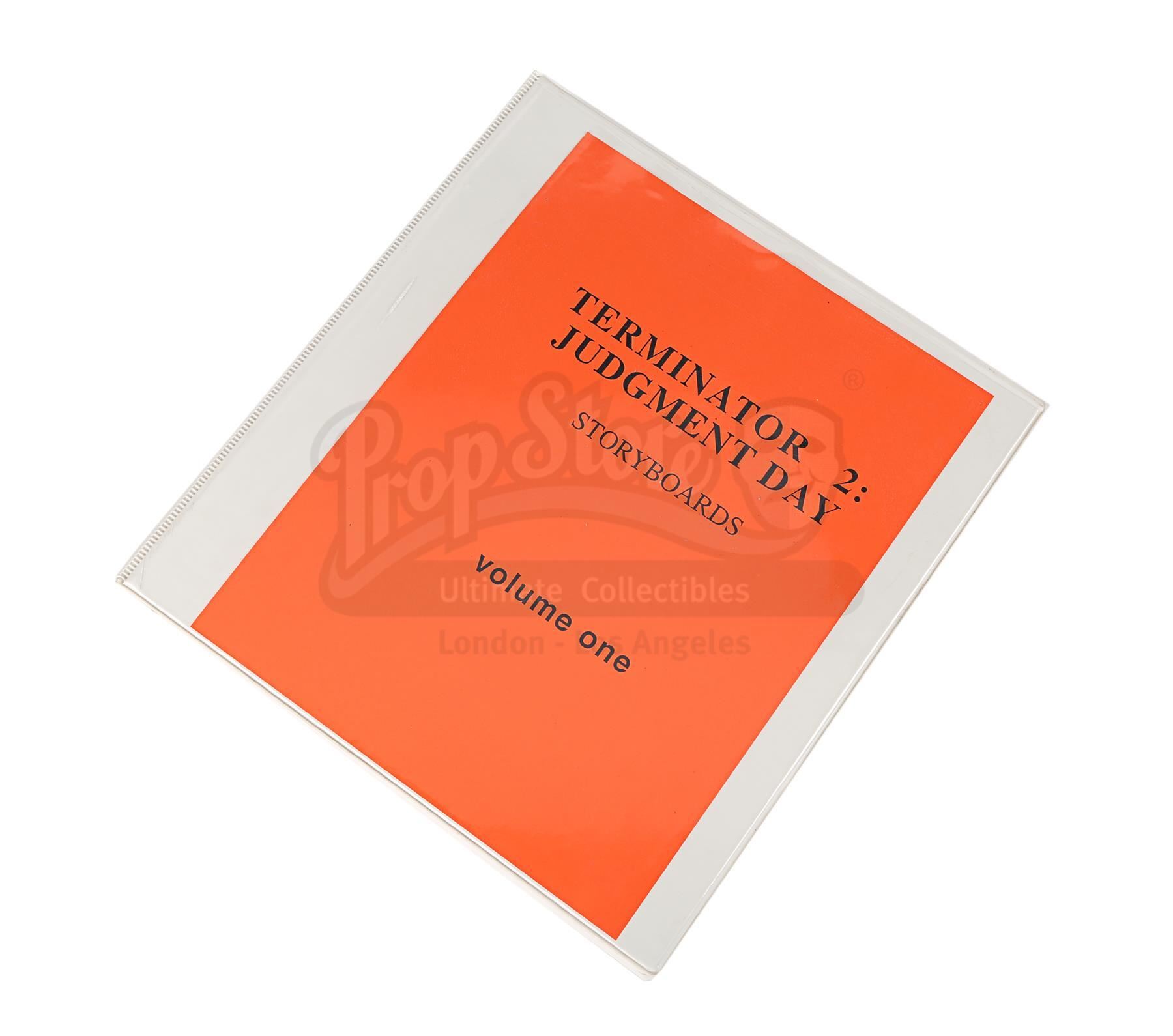 A storyboard folder from James Cameron's sci-fi sequel Terminator 2: Judgment Day. Storyboards are used to visually map out the film during the pre-production process. The folder is labeled "volume one" and features a complete set of storyboards from the beginning of the film up to the point when Cyberdyne explodes. The printed storyboards are divided into different labeled scenes (e.g. "Sarah's Nightmare #1) and are separated with orange sheets of paper.
