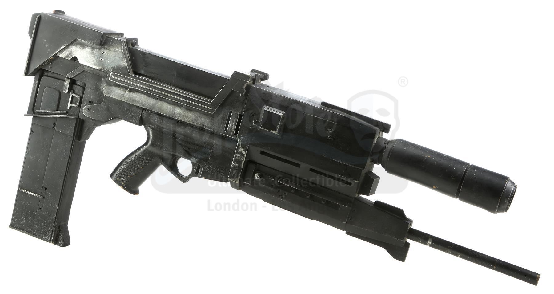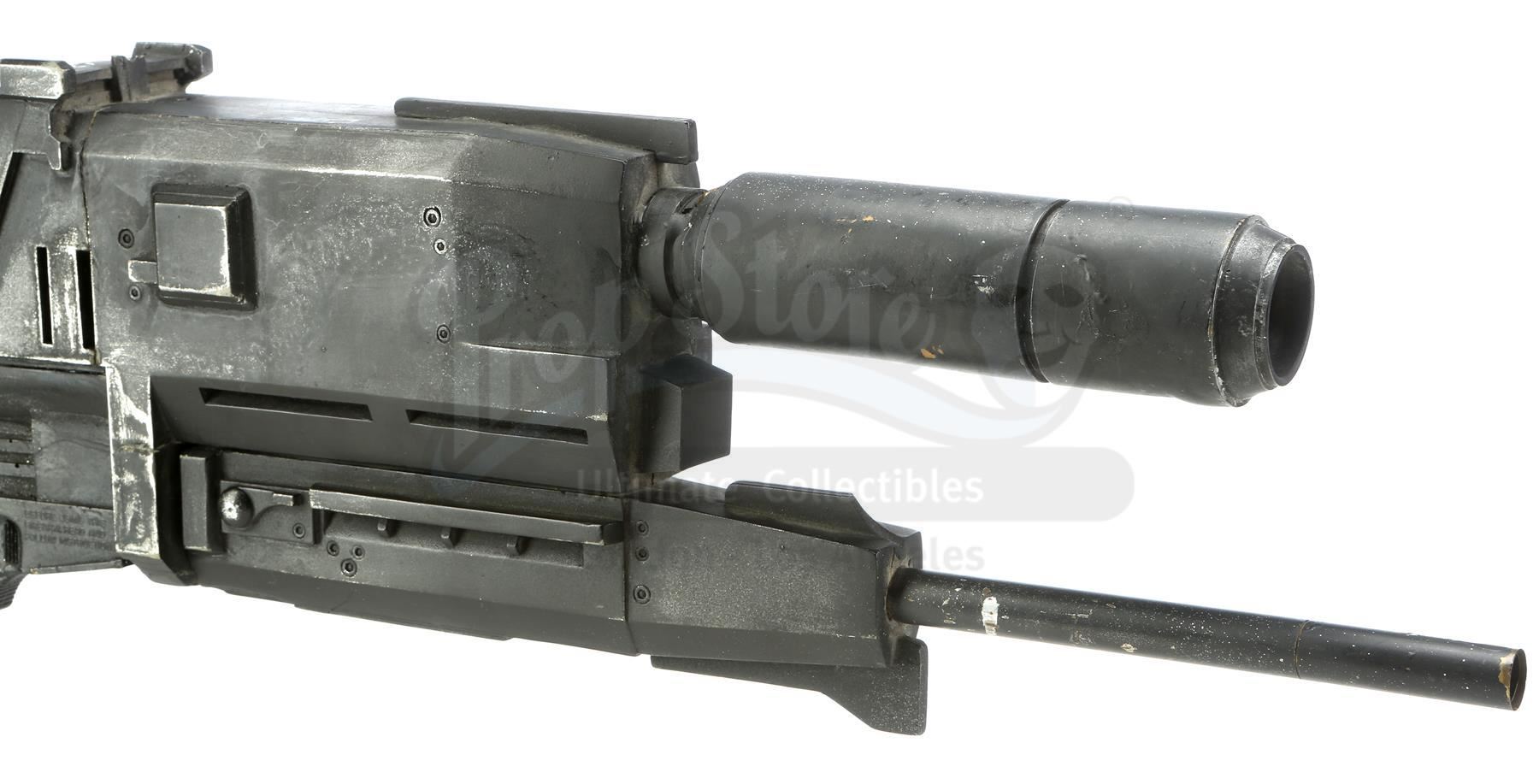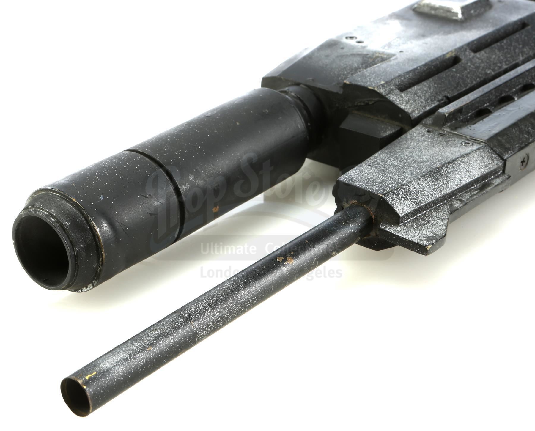 The custom-designed prop rifle is made of multiple molded resin components adhered with glue and screws, as well as metal piping for the lower barrel, all painted matte black with weathered silvertone highlights. It is in good overall condition with some signs of wear from use and age, including chips in the paint and cracks in the resin throughout.