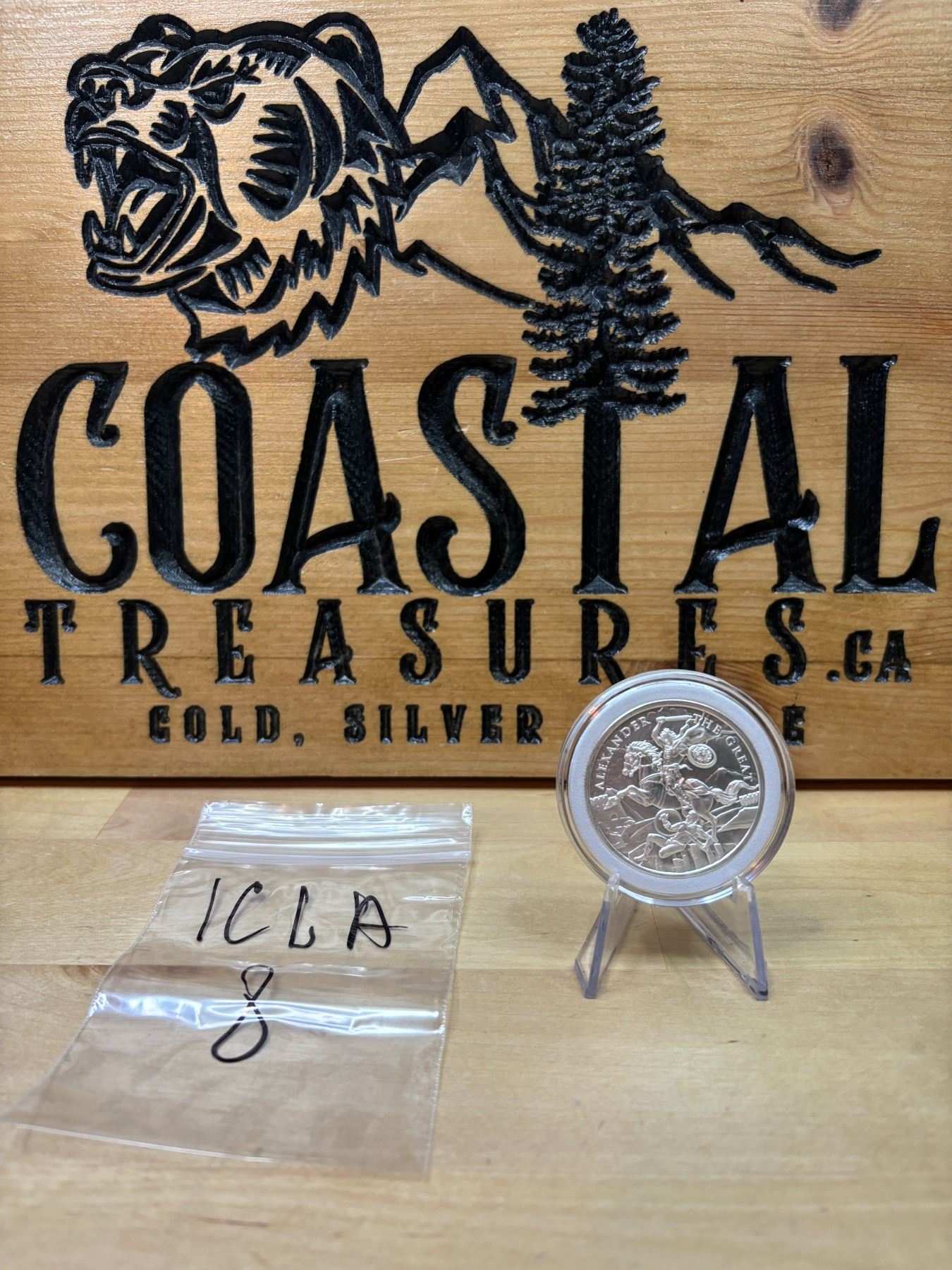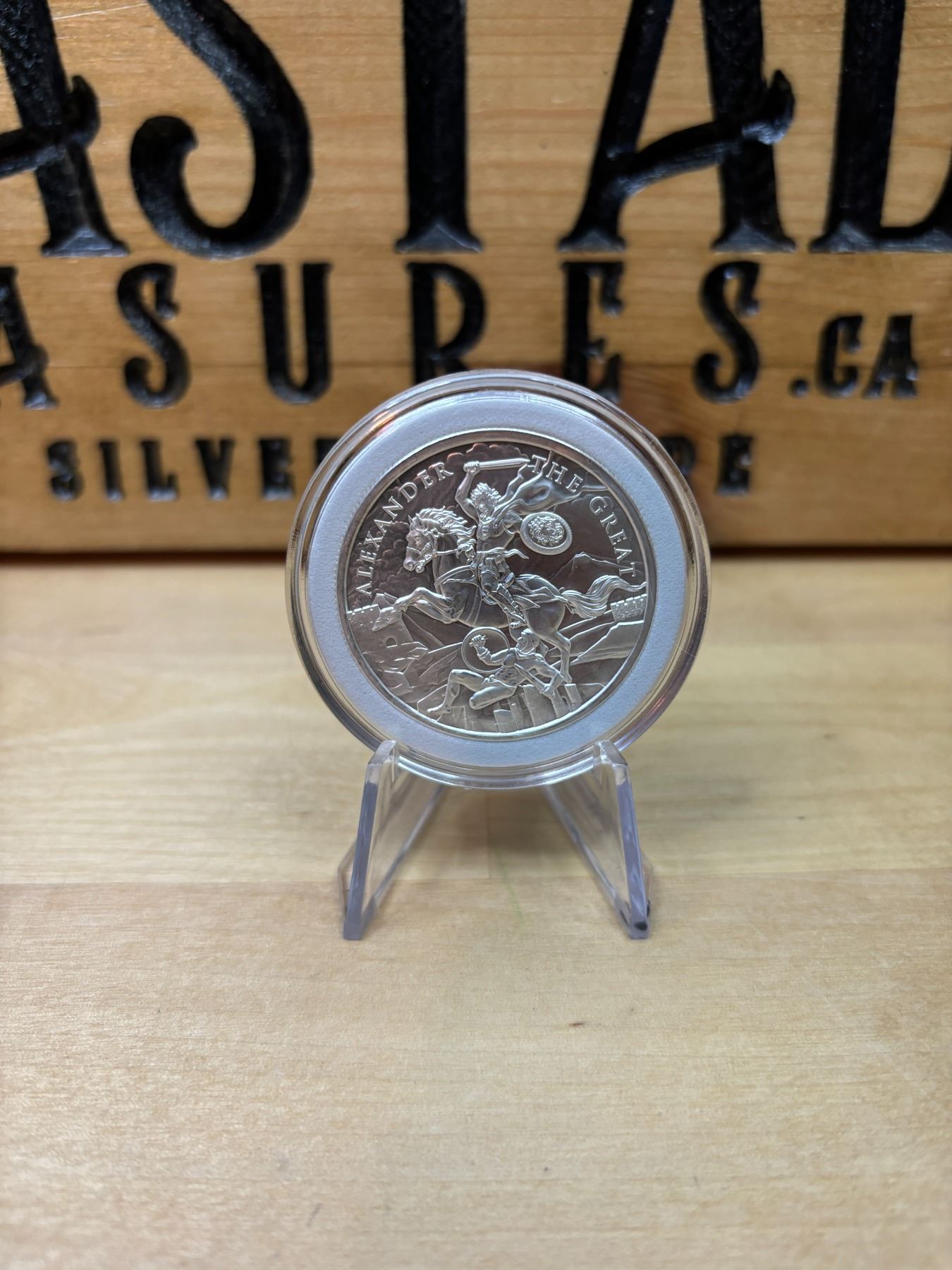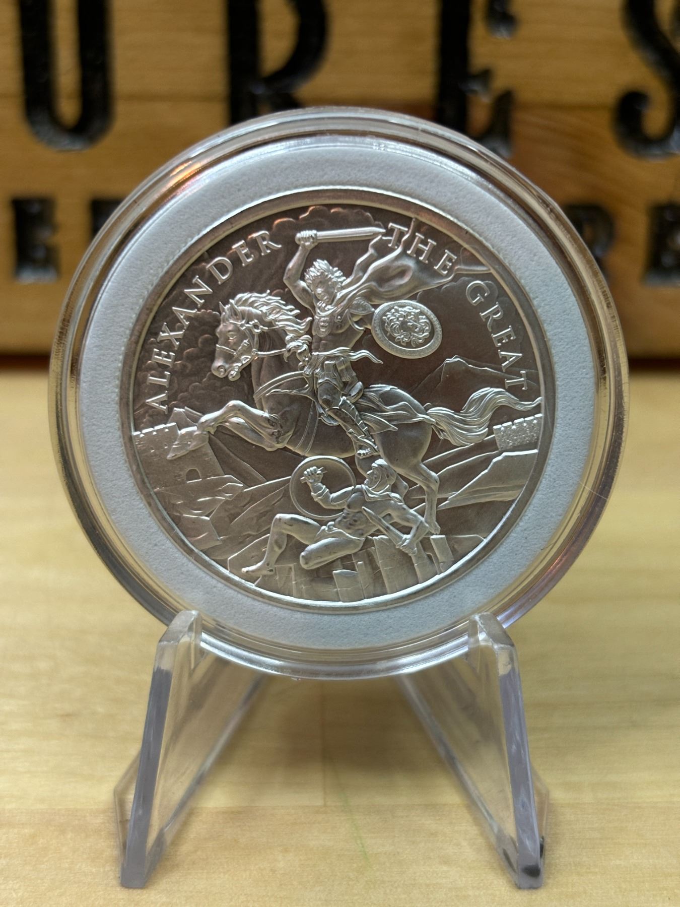 The Alexander the Great Legendary Warriors Silver is a 1oz silver coin (99.9% purity), featuring a portrait of **Alexander the Great** on the obverse. The reverse showcases imagery related to his military campaigns. The face value varies depending on the issuing country. This coin is a popular choice for collectors interested in history and ancient warfare.