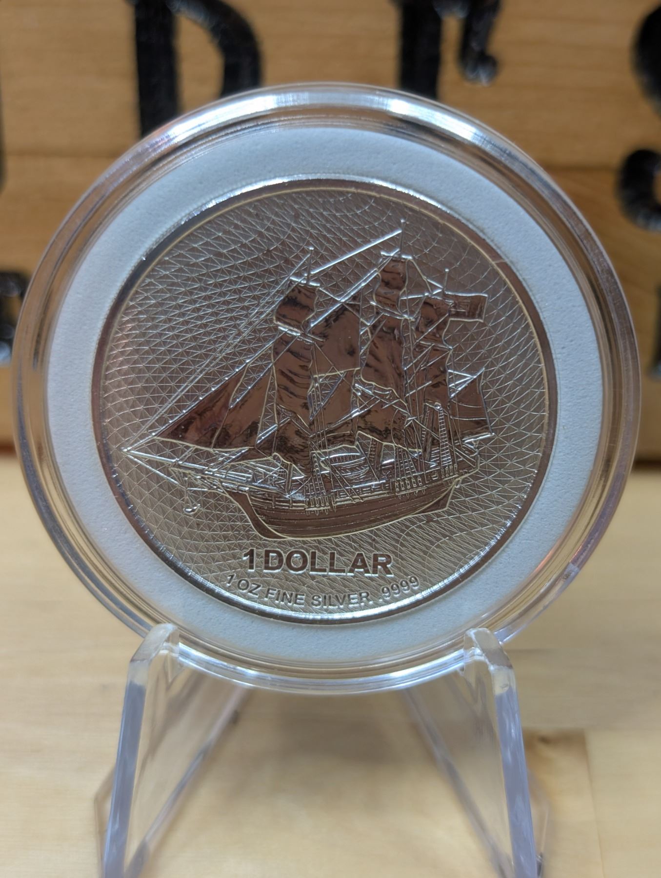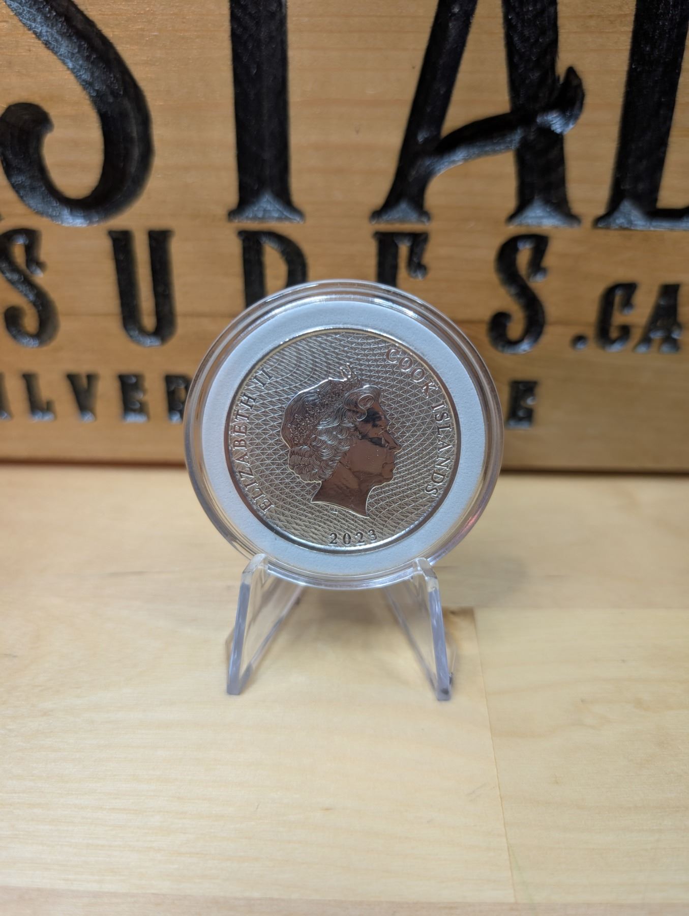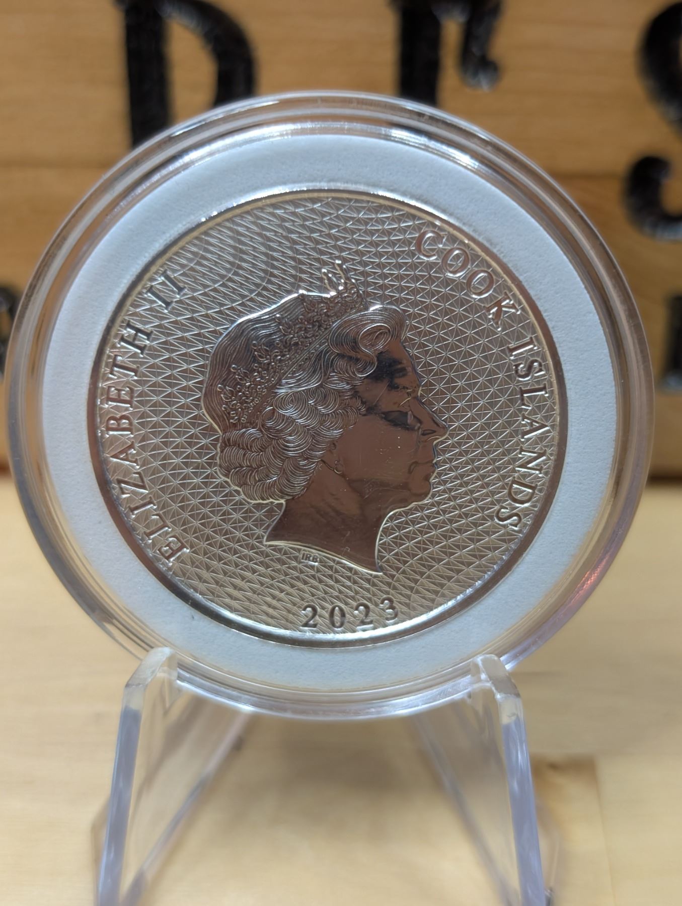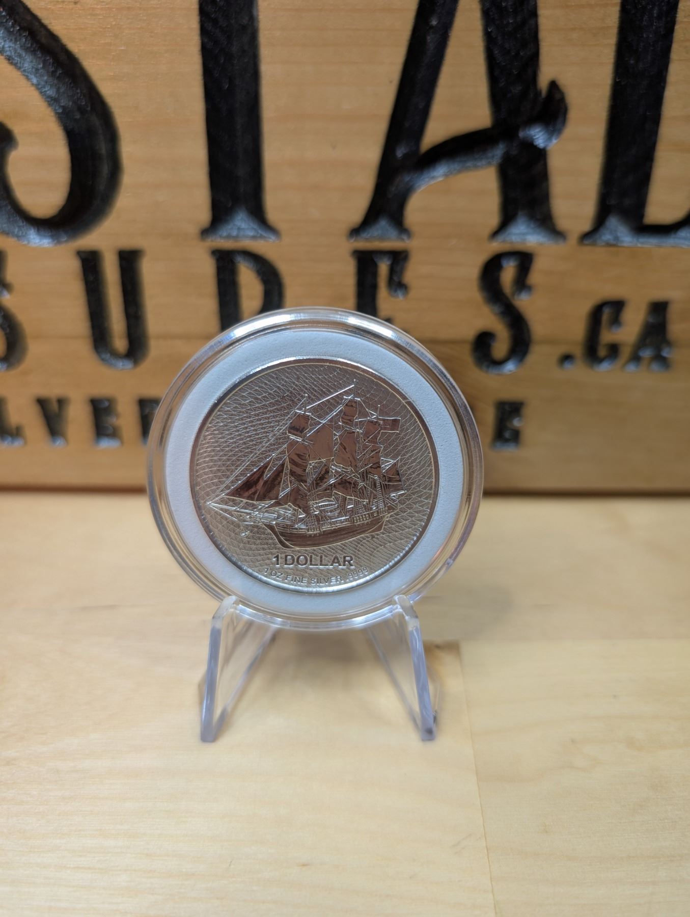 The 1 oz Cook Island Bounty Ship Silver Coin is a bullion coin made of 99.9% pure silver. It features a detailed image of the HMAV Bounty, a famous British ship, on the reverse. The coin's design typically includes the ship in full sail, along with a depiction of the Cook Islands' coat of arms and the year of issue. The obverse usually features the effigy of Queen Elizabeth II. This coin is popular among collectors for its historical theme and fine silver content.