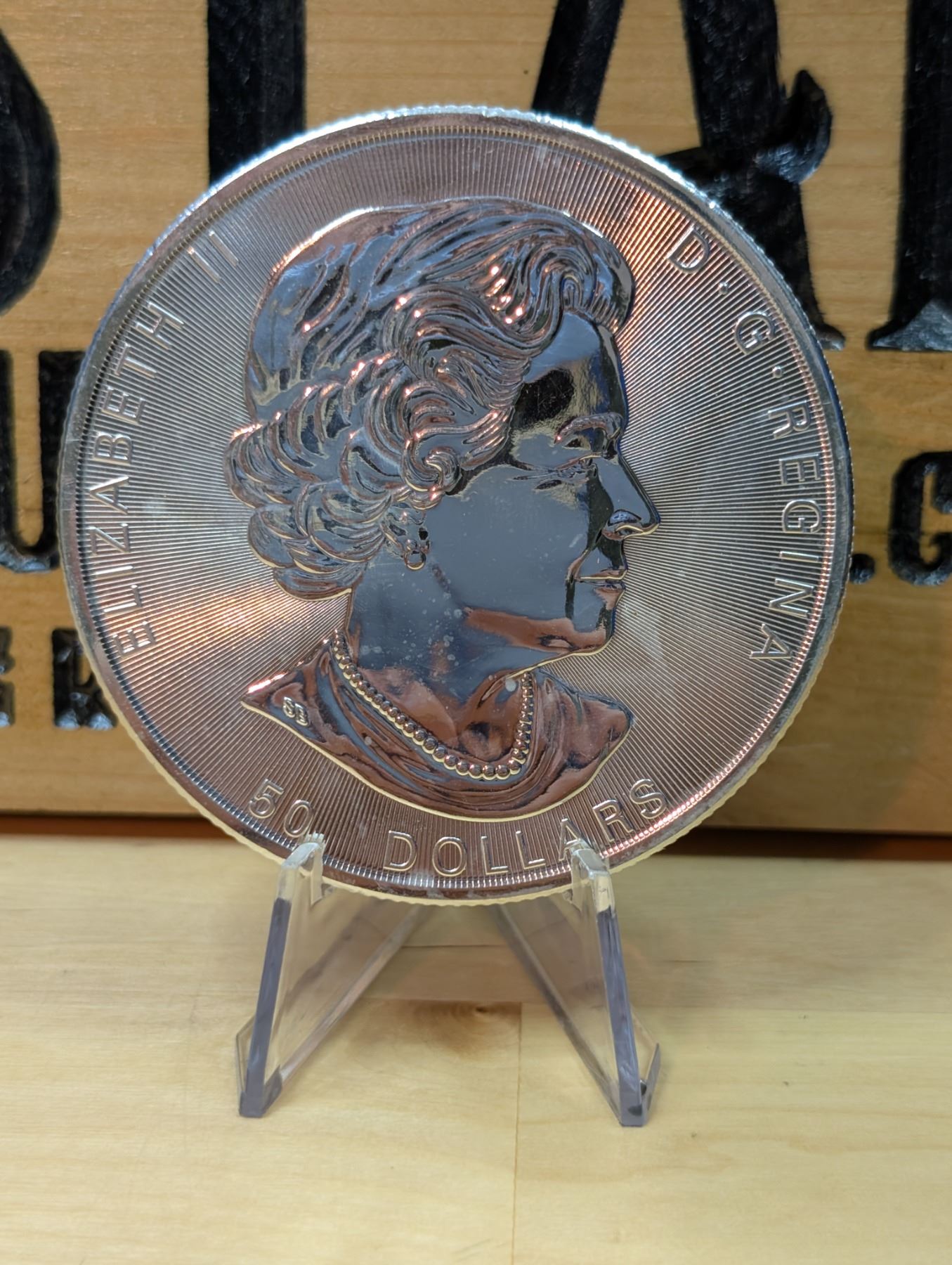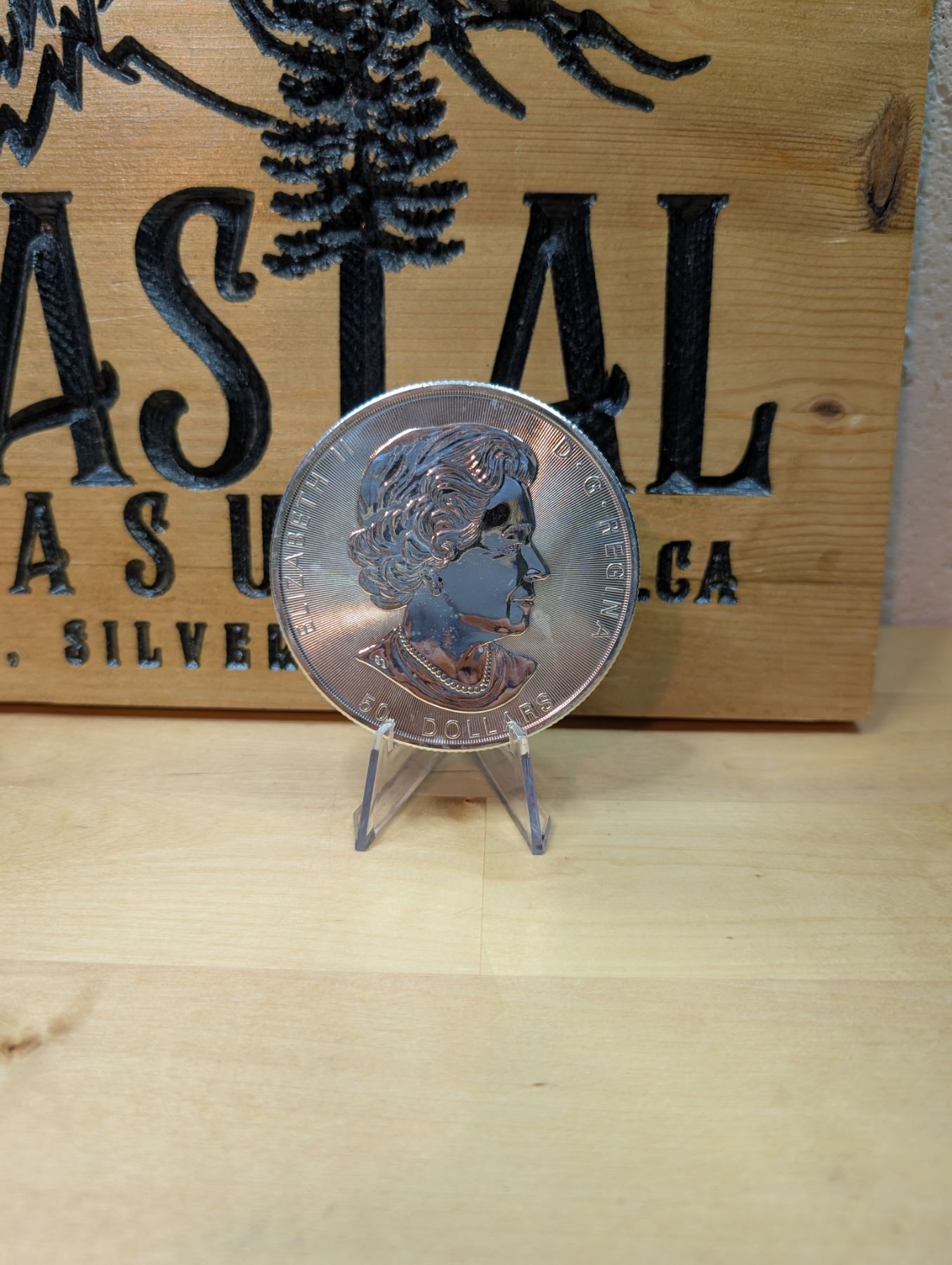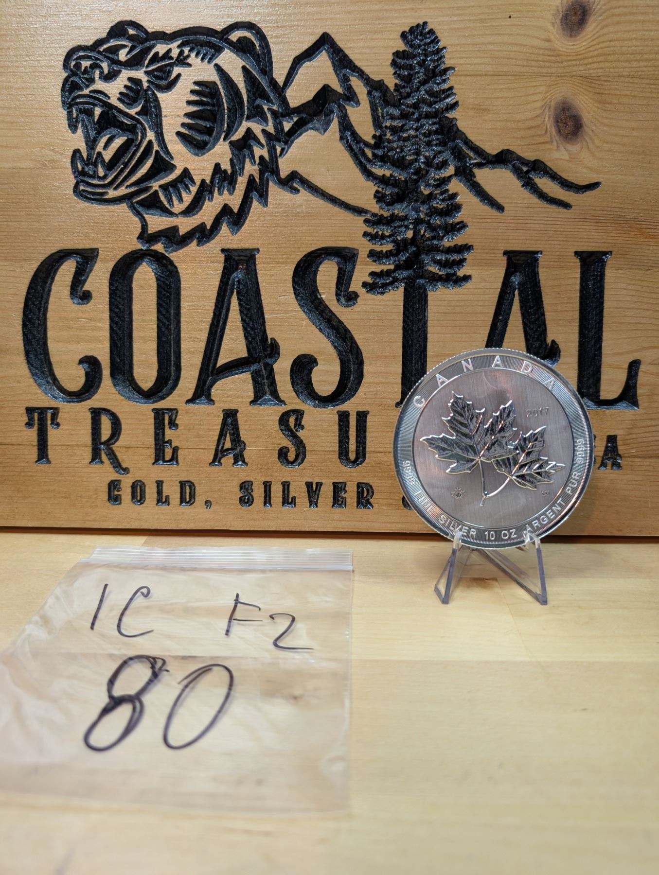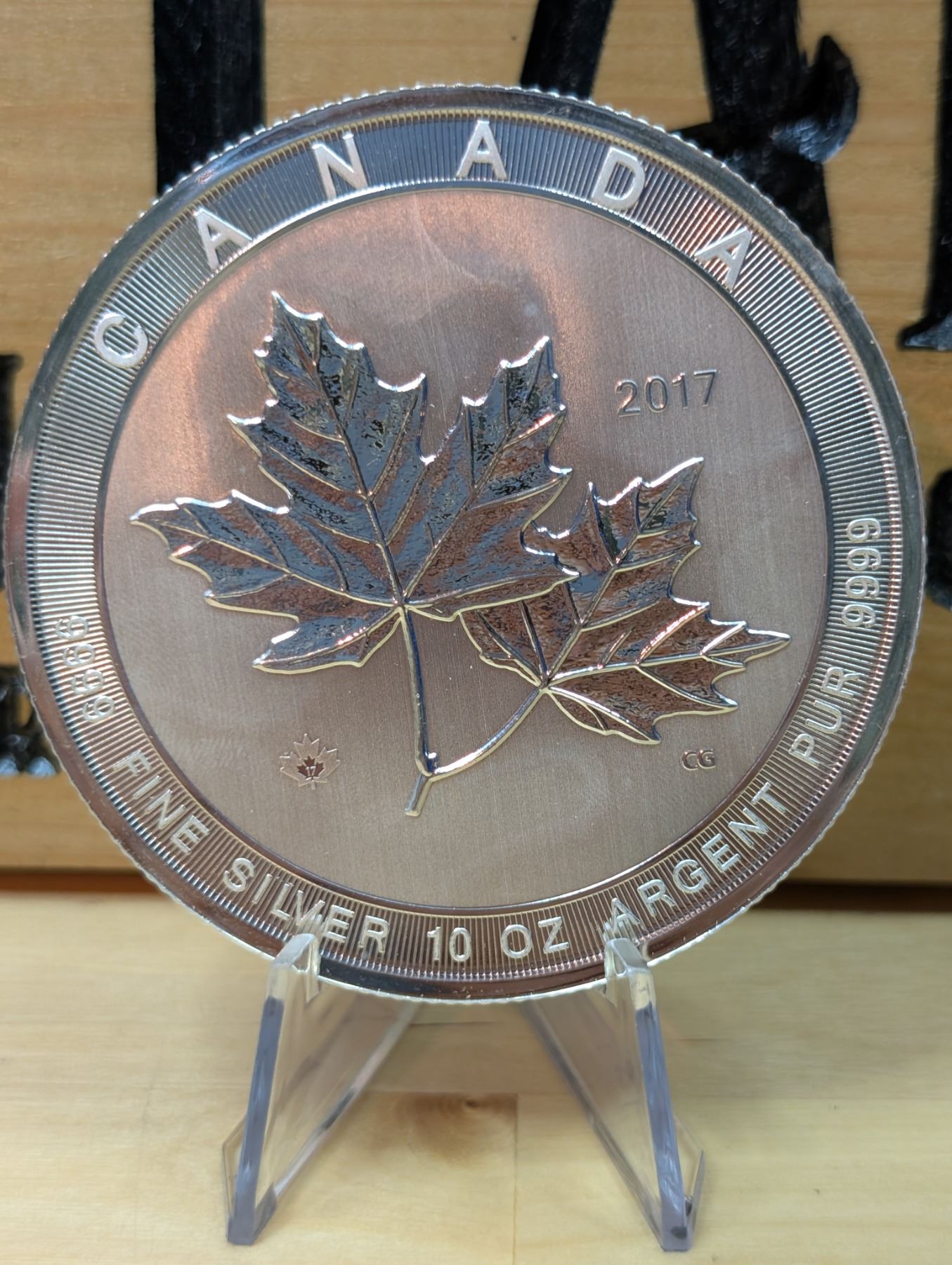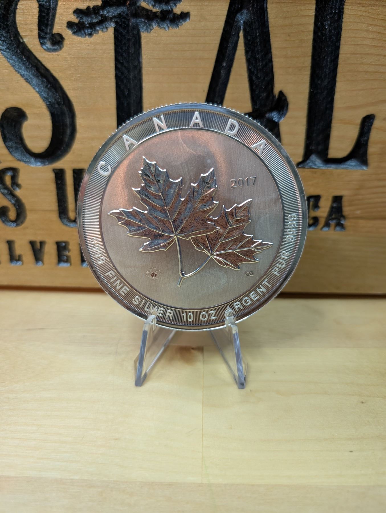 The 10 oz Canadian Maple Leaf 2017 silver coin is made from .9999 fine silver and features the iconic maple leaf design, symbolizing Canada. Issued by the Royal Canadian Mint, this larger-sized coin is popular among investors and collectors for its high purity and recognizable design. Its value is determined by the current silver price and demand for the 2017 edition.