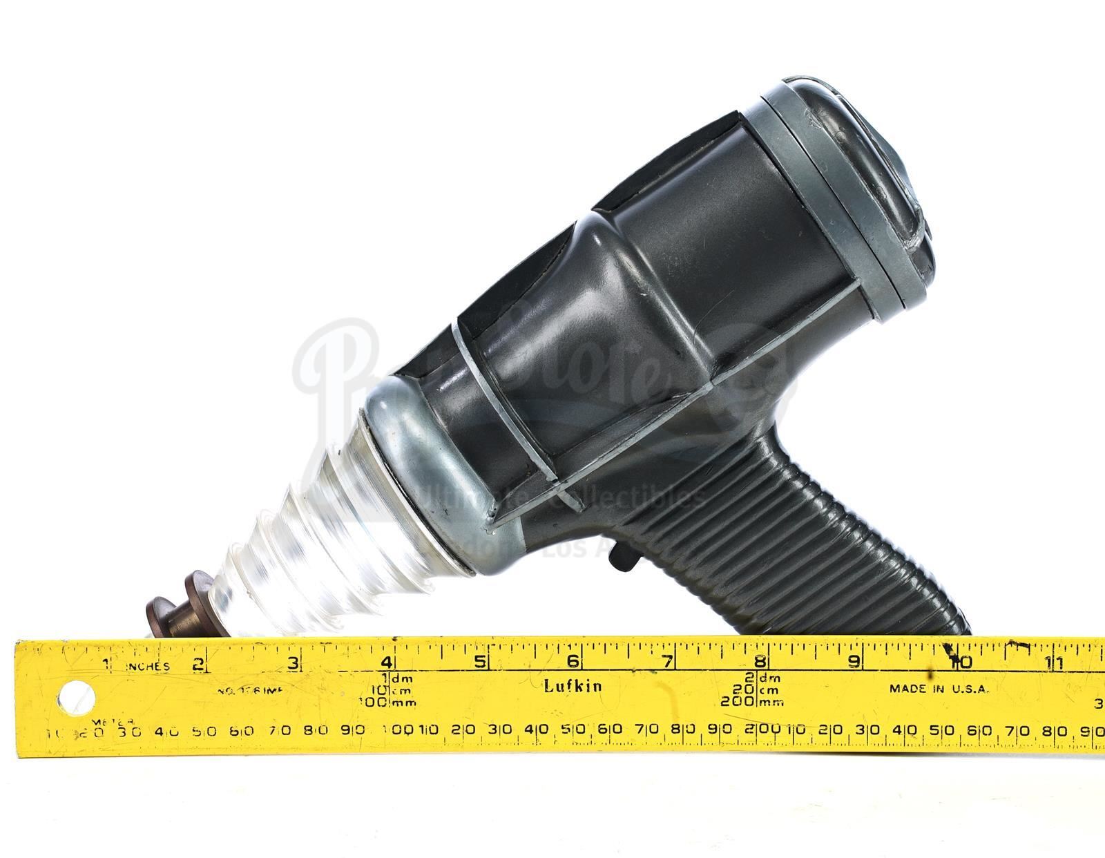 This lot will be auctioned on Tuesday, June 29th. The auction will begin at 9:00am PDT and lots are sold sequentially via live auctioneer; tune in to the live streaming broadcast on auction day to follow the pace. Note other lots in the auction may close on June 30th or July 1st. A blaster pistol from Fred McLeod Wilcox's sci-fi adventure film Forbidden Planet. The crew of the United Planets Cruiser C-57D carried their futuristic blasters throughout the film. Only around 15 blasters are thought to have been made by MGM, with several destroyed during filming, rented out to later productions, or gifted to the crew. This specific pistol is constructed of thermoformed plastic with a brass insulator on the barrel and a machined acrylic tip. An aluminum cap at the back conceals a vintage switch that makes a loud sound when toggled, as well as cloth-wrapped wires on the interior which have been cut and spliced to more modern wires. Due to the original wires being cut, the blaster does not currently illuminate, but it remains in good overall condition with paint chipping and some small fractures throughout the body and cap. Dimensions: 12" x 12" x 6" (30.5 cm x 30.5 cm x 15.25 cm) Contains electronic components; see notice in the Buyer's Guide. Ownership may be restricted in some countries; see replica firearm notice in Buyer's Guide. Estimate: $8,000 - 10,000