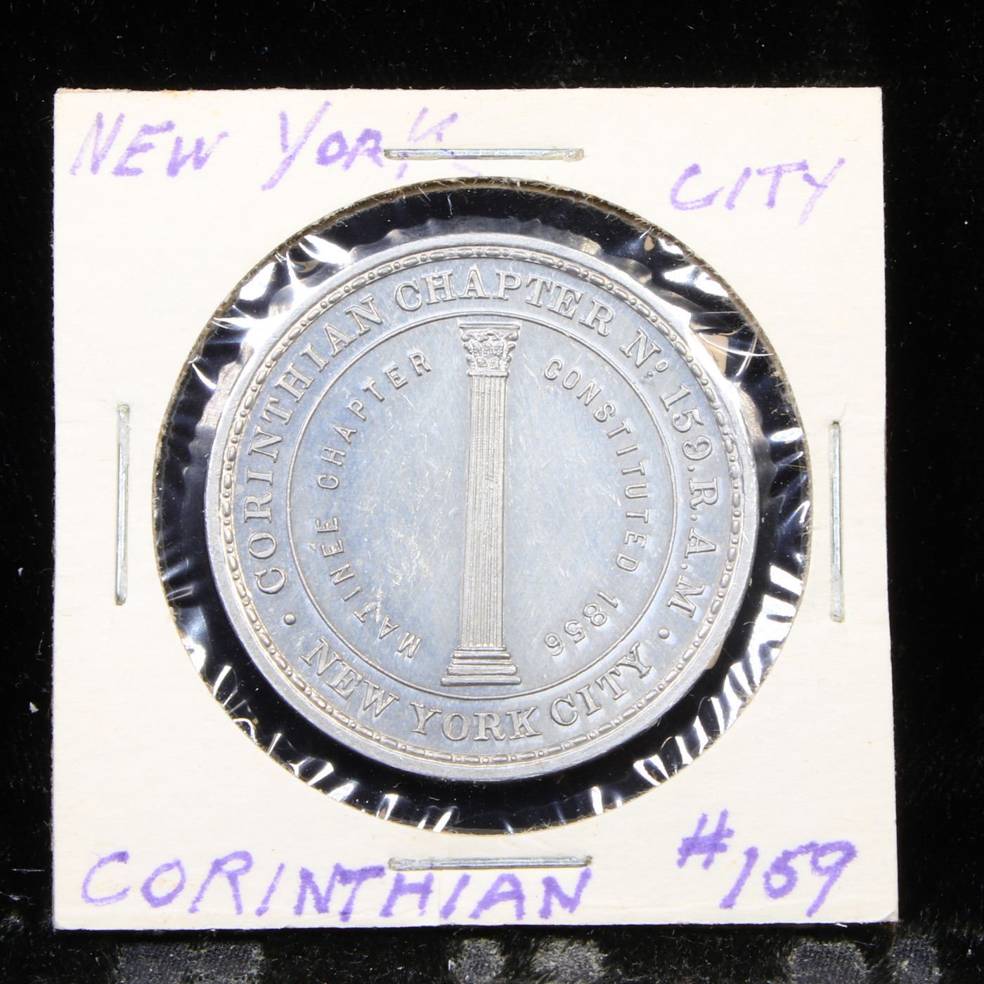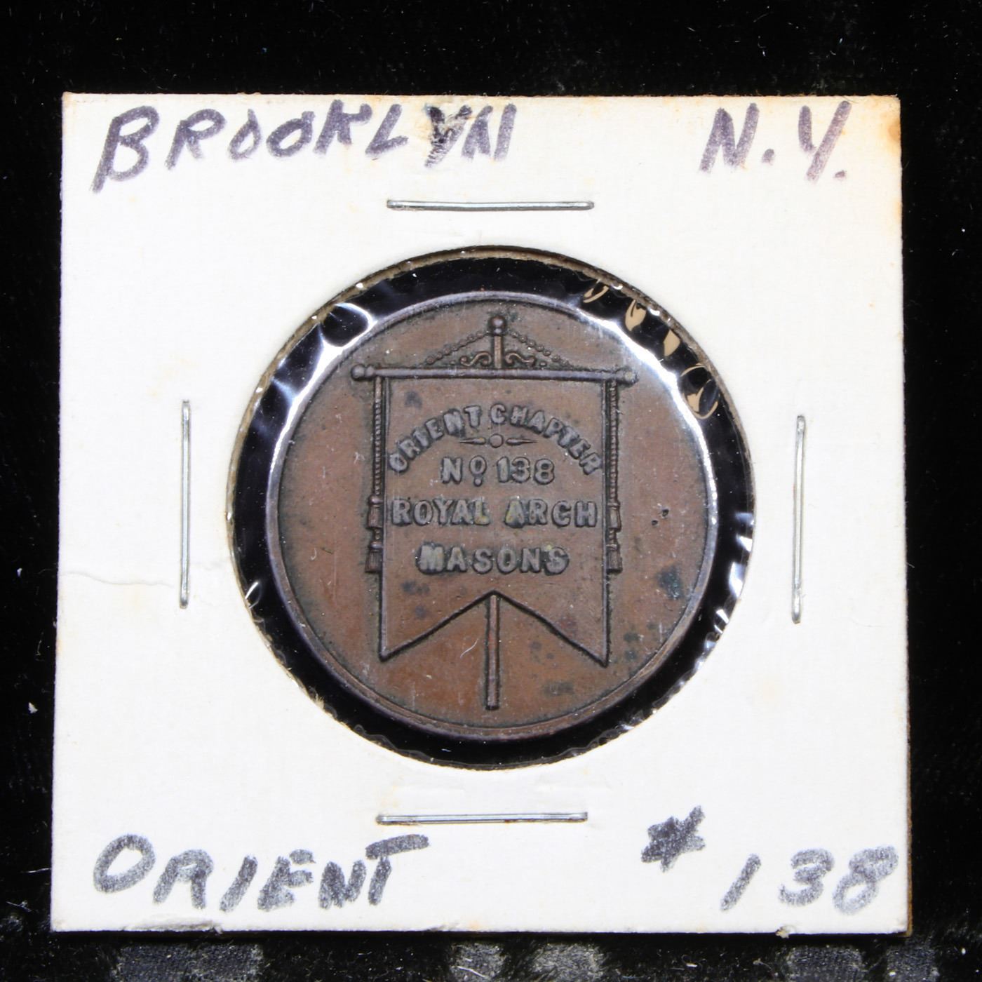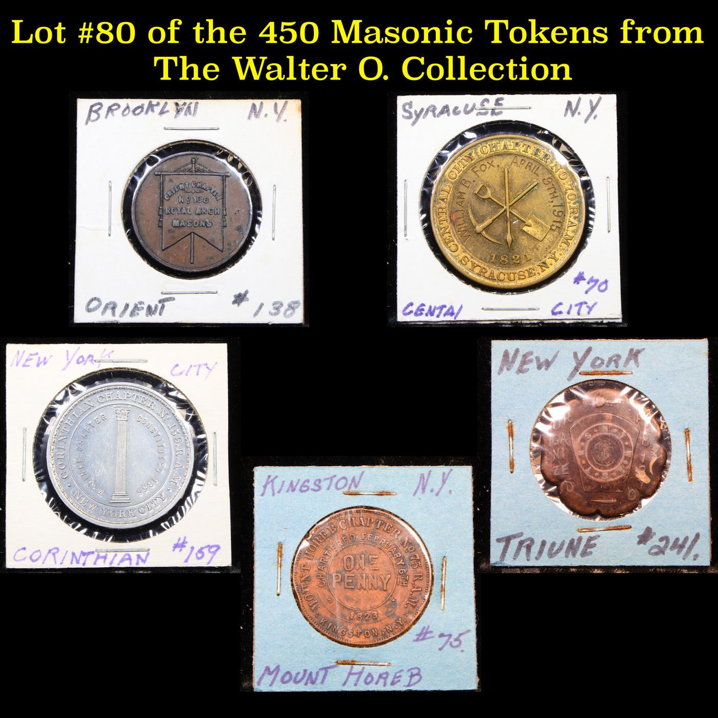 Lot #80 of the 450 Masonic Tokens from The Walter O. Collection. We Recently received a very Large Collection of 450 Masonic Tokens and coins. This collection was one man’s hobby for over 40 years. He collected each and every one with care and attention to detail and variety. Some of them are amazing and incredibly rare and highly sought by collectors and Masons. Here is a Brief Overview : Masonic coins often raise many questions for those looking to better understand the significance of the coins themselves as well as the symbolism represented in their imagery. In fraternal culture as a whole, symbolism has always been a significant part of these organizations’ identity, especially in Freemasonry, as Masonic coins are rich with symbolism, reflecting different events and characteristics of Freemasonry that give them the priceless value they hold. There are several varieties of masonic coins and tokens, and all tokens will fall into one of the following categories: a token celebrating a particular mason, lodge or event; an initiation token showing when a Brother was initiated, passed and raised; and finally the mark mason token (or penny) which signifies a pivotal part of a Mason’s initiation. Because symbolism was so important to fraternal culture, these small coins are rife with meaning. The most ubiquitous representation of the Masons was the letter "G" surrounded by a compass and square, representing the holy geometry of God. Some tokens feature the letters "H.T.W.S.S.T.K.S.," which means "Hiram the Widow's Son Sent to King Solomon," the biblical story that must be acted out to reach the third, or Master's Degree, in Freemasonry. Additionally, many contain either Apron and gloves: These symbols stand for living with a pure heart and to keep one’s hands clean. All-seeing eye: This symbol is designed to remind Masons that God and others always see their thoughts and actions. Ashlars: You may see rough and smooth ashlars on Masonic coins. They are to remind Masons of the contrast between man’s natural state and perfection and the Level: This symbol found on some Masonic coins reminds Masons that everyone is equal before God. We have broken the set up into groups of 5 Tokens in each lot. We have put 5 Lots per night over the 18 Nights of the Spring Auctions.