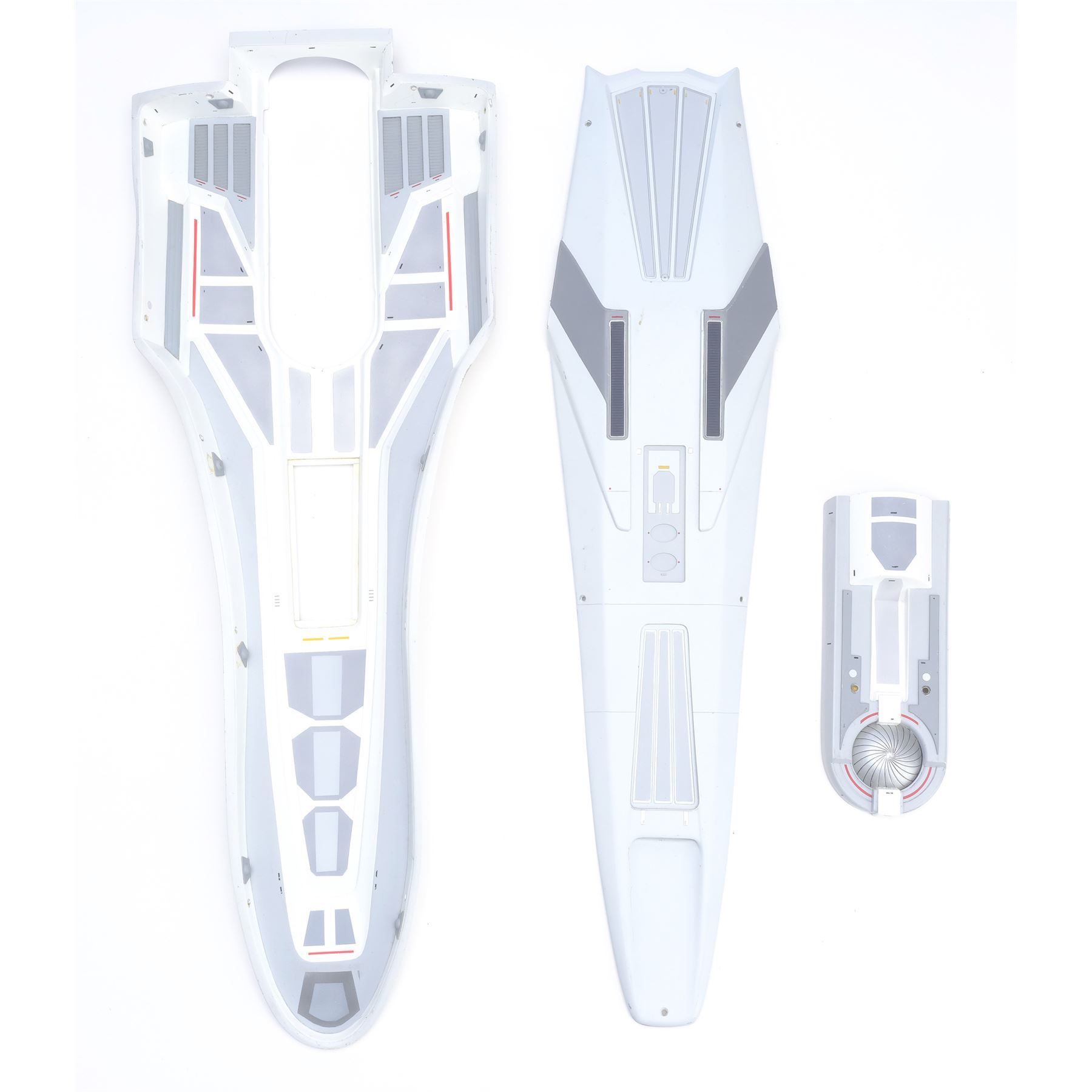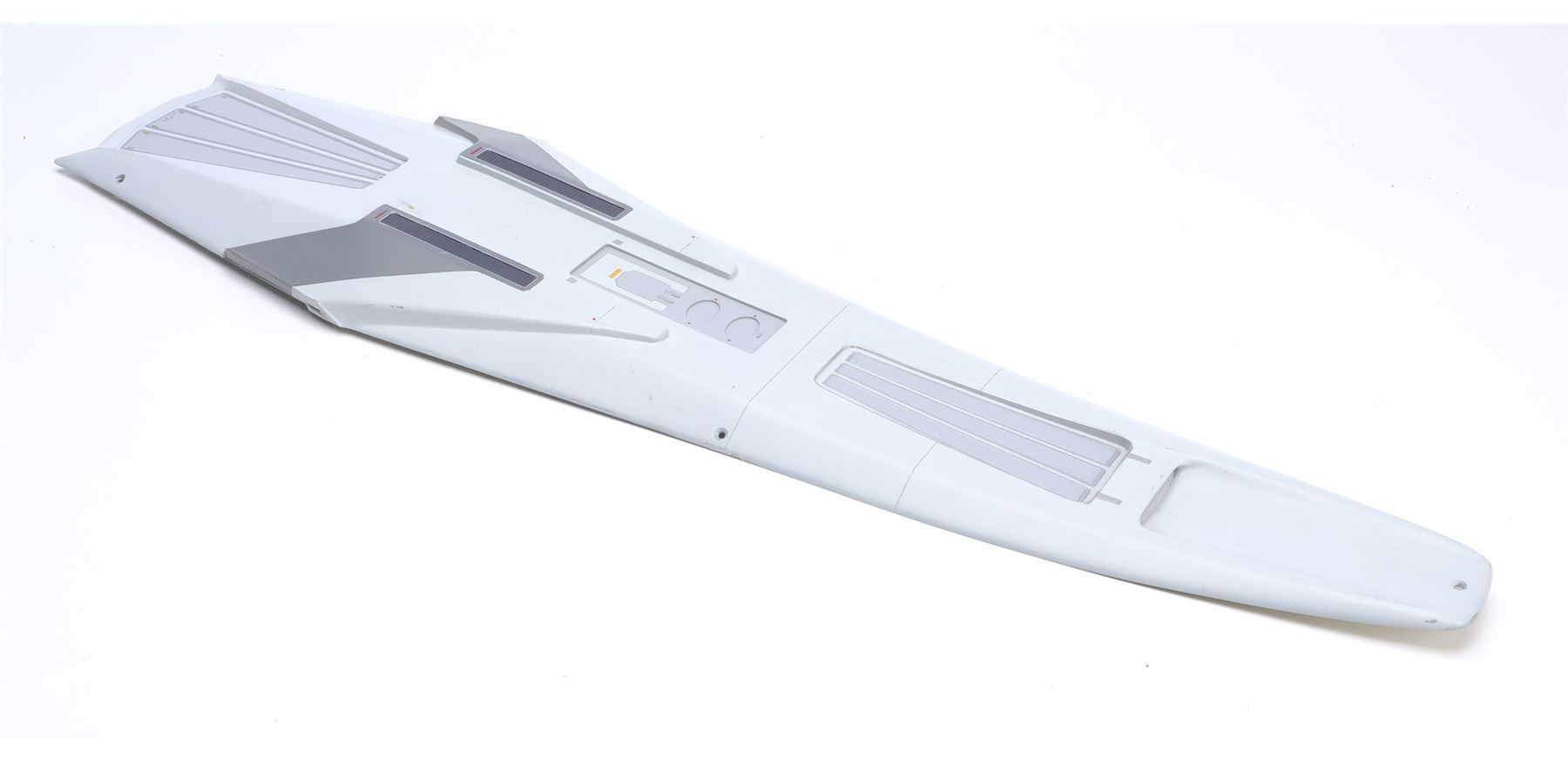 These three vacuum-formed plastic miniature components from the command deck's bottom panel and the NSEA Protector's top panels come from the collection of lead model maker John Duncan, who created them. Painted white and gray, they feature tape marked "Screws" to insert in the holes along the edges. The set exhibits grime, tape residue, and some missing screws. Dimensions: 24" x 8.75" x 1" (61 cm x 22.25 cm x 2.75 cm)