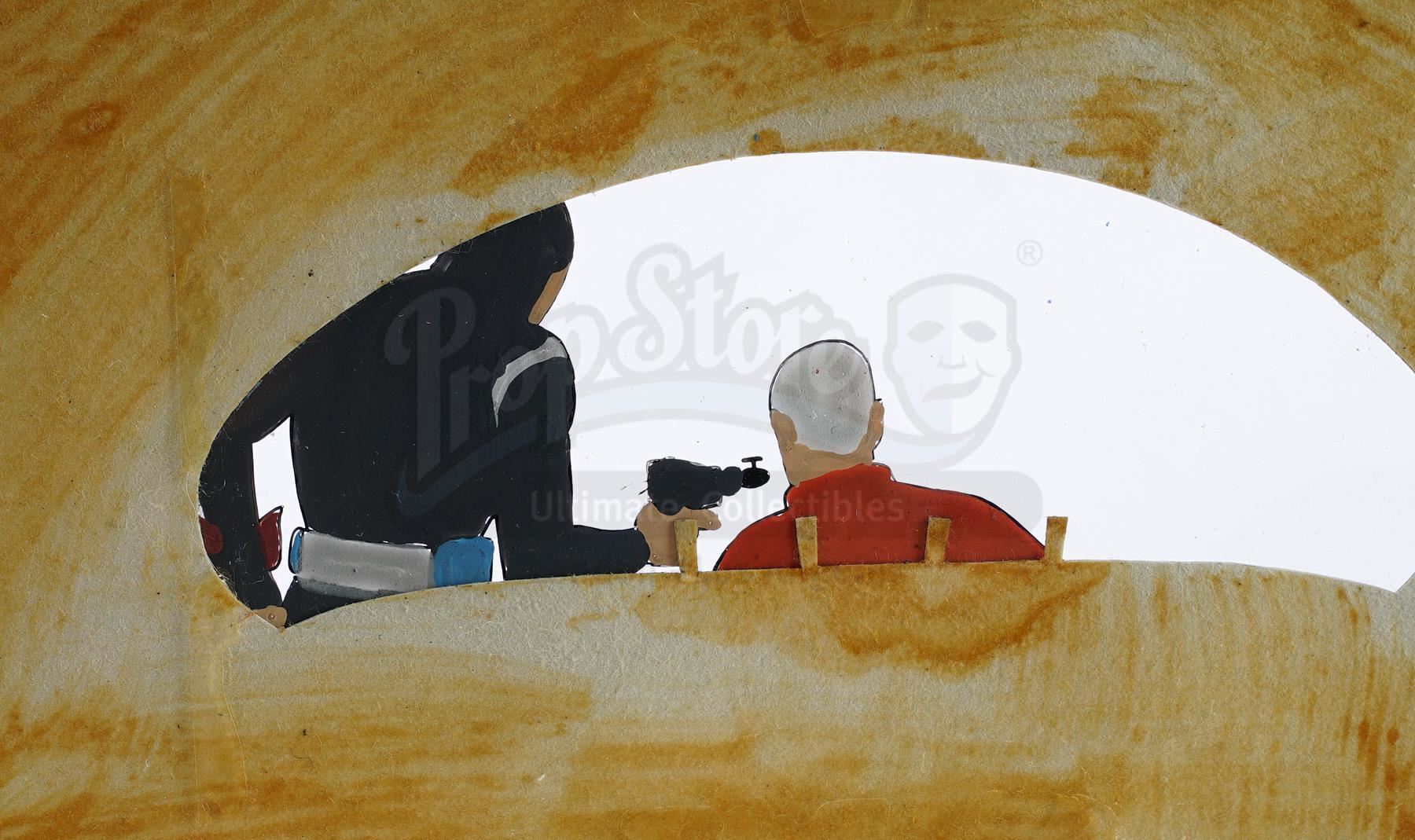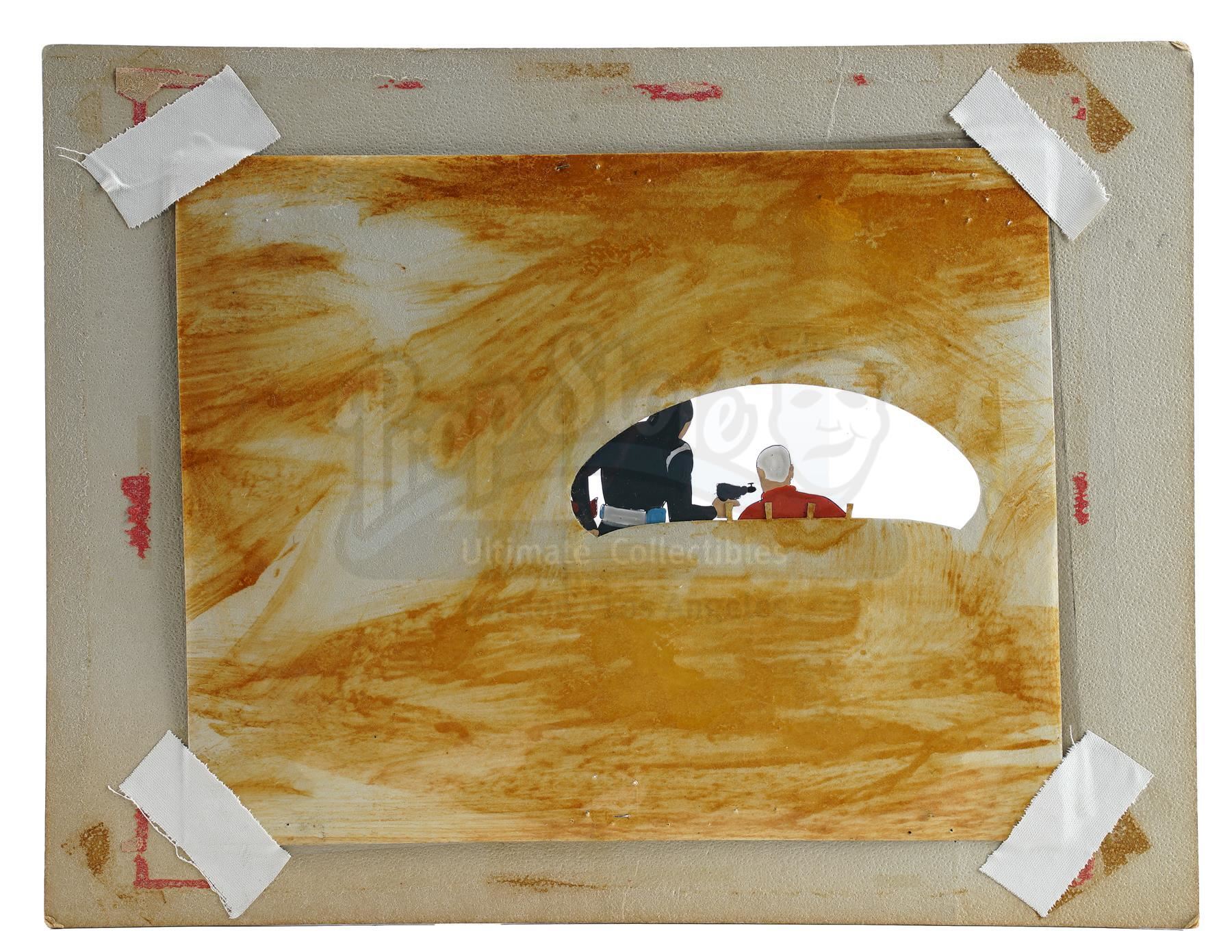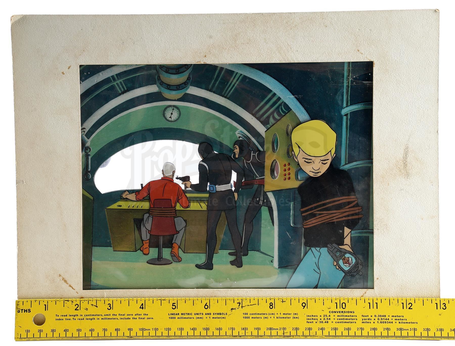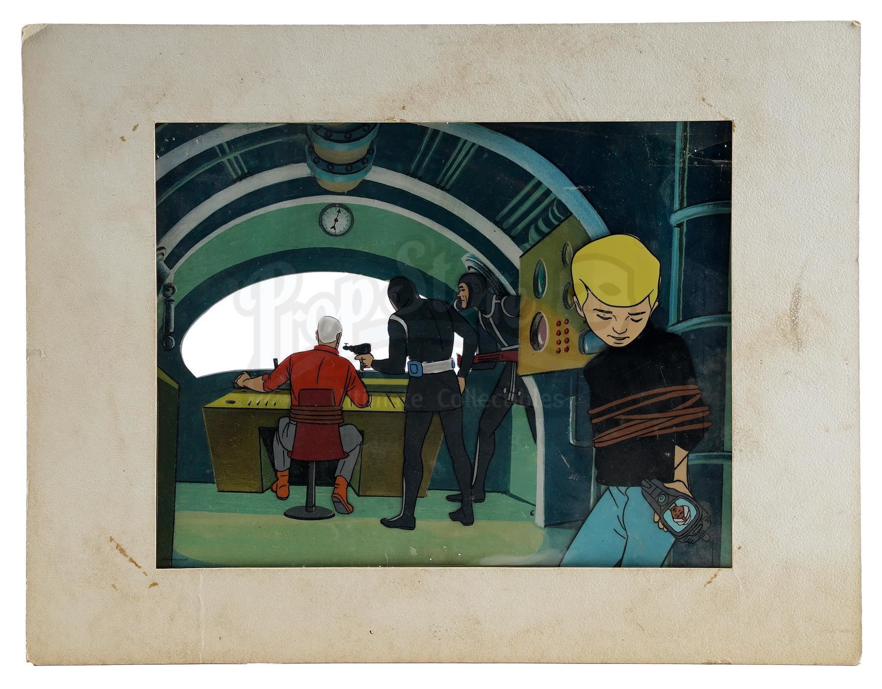This lot will be auctioned on Wednesday, June 30th. The auction will begin at 9:00am PDT and lots are sold sequentially via live auctioneer; tune in to the live streaming broadcast on auction day to follow the pace. Note other lots in the auction may close on June 29th or July 1st. A hand-painted Jonny Quest (Tim Matheson) cel from the animated adventure series Jonny Quest. In the episode "Pirates from Below," Quest attempted to contact Hadji Singh (Danny Bravo) while Race Bannon (Mike Road) was held at gunpoint. This cel consists of three clear acetate layers with the hand-painted character elements spread between them and one hand-painted paper background layer with a window cut out stapled and taped to white matboard. It is in fair overall condition with wear from age; including layers sticking, scuffs throughout, and staining to the matboard . Dimensions: 13" x 10" (33.25 cm x 25.5 cm) Sold without copyright; see notice in the Buyer's Guide Estimate: $600 - 800