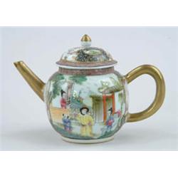 Lot # 802: COVERED ORIENTAL TEAPOT. Angled spout with loop handle, small dome cover with pointed finial. Scenes of people and houses. Handle and spout are gilt decorated. SIZE: 5” h. CONDITION: Possible re-painted area including body and gold. Some yellow of costume missing. 9-97243