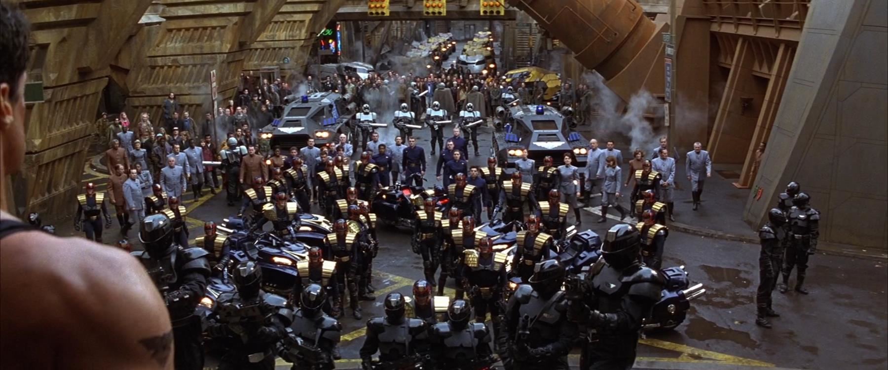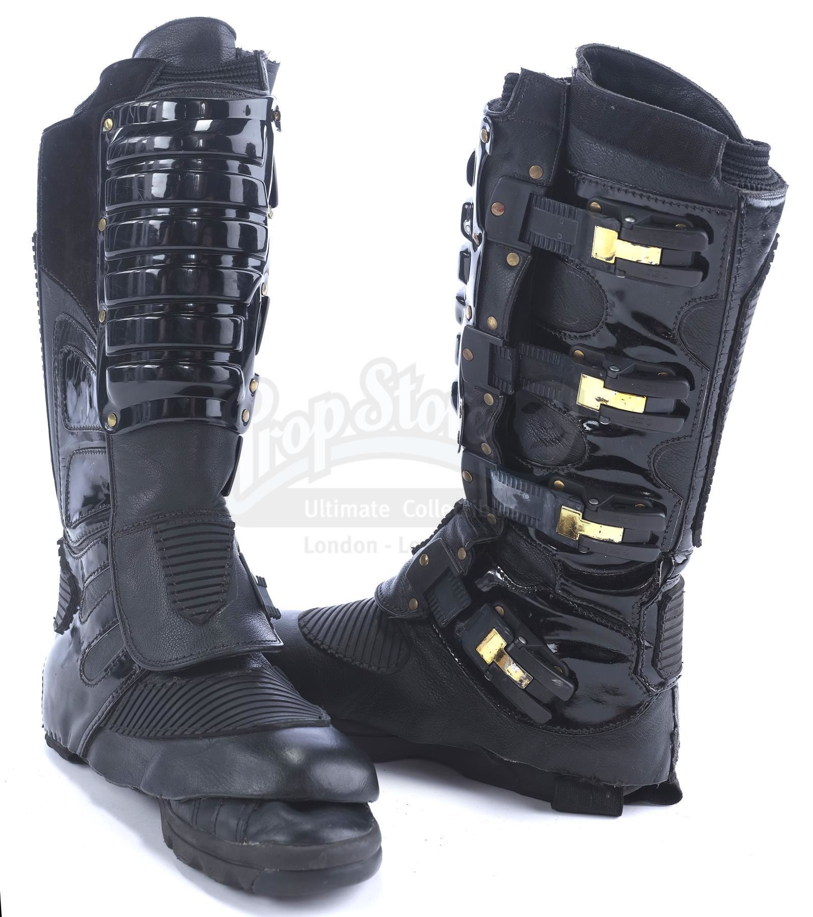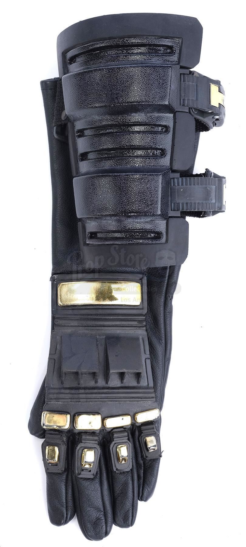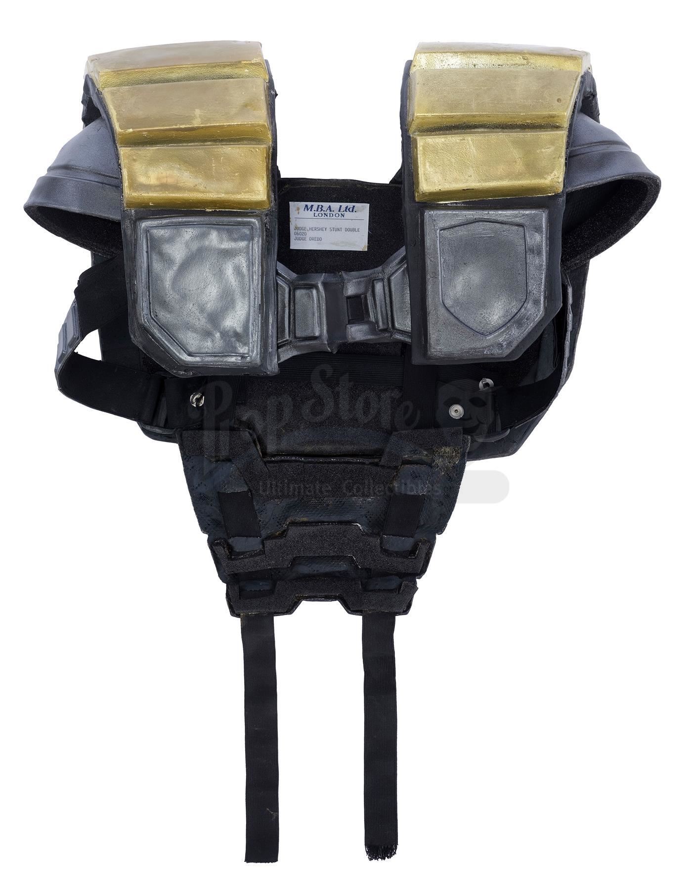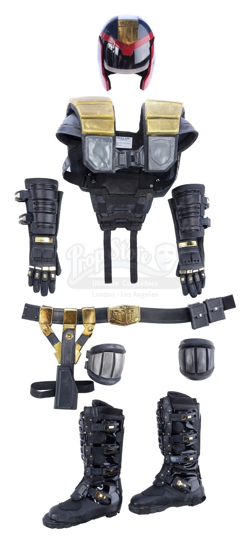 This lot will be auctioned on Wednesday, June 30th. The auction will begin at 9:00am PDT and lots are sold sequentially via live auctioneer; tune in to the live streaming broadcast on auction day to follow the pace. Note other lots in the auction may close on June 29th or July 1st. Street Judge Jones costume components from Danny Cannon's comic book action film Judge Dredd. In a dystopian future, "Judges" operated as judge, jury, and executioners of potential criminals. This street judge costume was conceived by legendary fashion designer Gianni Versace. It consists of a black rubber and Velcro belt with false pouches; a multicolor holster buckle; a pair of black foam rubber wrist guards with gold-color clasps; black leather gloves with rubber and resin multicolor details; black rubber knee pads with clasped straps; black rubber and leather shoes with shin guard accents; a multicolor vacuform plastic, rubber and fiberglass piece of shoulder armor and the multicolor fiberglass judge helmet with a tinted plastic visor. It exhibits signs of wear from age and use including minor damage to the shoulder elements, but remains in good overall condition. Estimate: $4,000 - 6,000