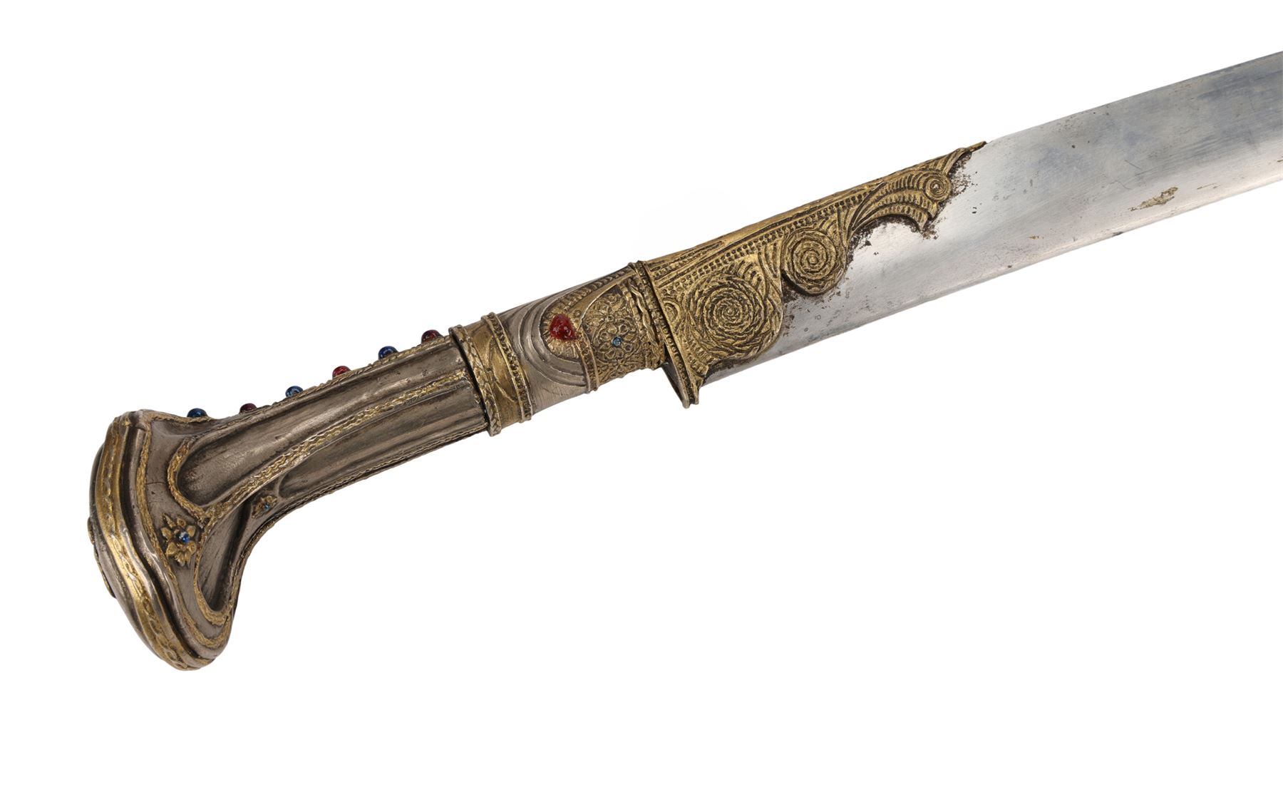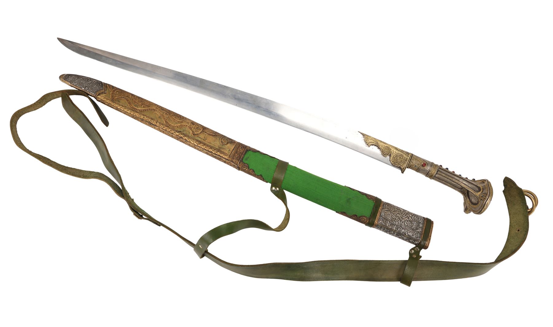 The sword's aluminium blade has a dulled edge, and its hilt has a curved grip. Both the hilt and ricasso feature intricate silver-and-gold-coloured resin detailing, while the scabbard's chape and locket display a flower motif. The pommel is decorated with faux sapphires and rubies, some of which form the ovules of engraved flowers. The body of the scabbard is covered in green fabric, around which is wrapped a green leather belt and dual gold-coloured resin buckles. The lot exhibits minor signs of wear, including rust spots on the blade and fraying on the scabbard fabric. Dimensions: 91 cm x 16 cm x 10 cm (36" x 6 1/2" x 4")