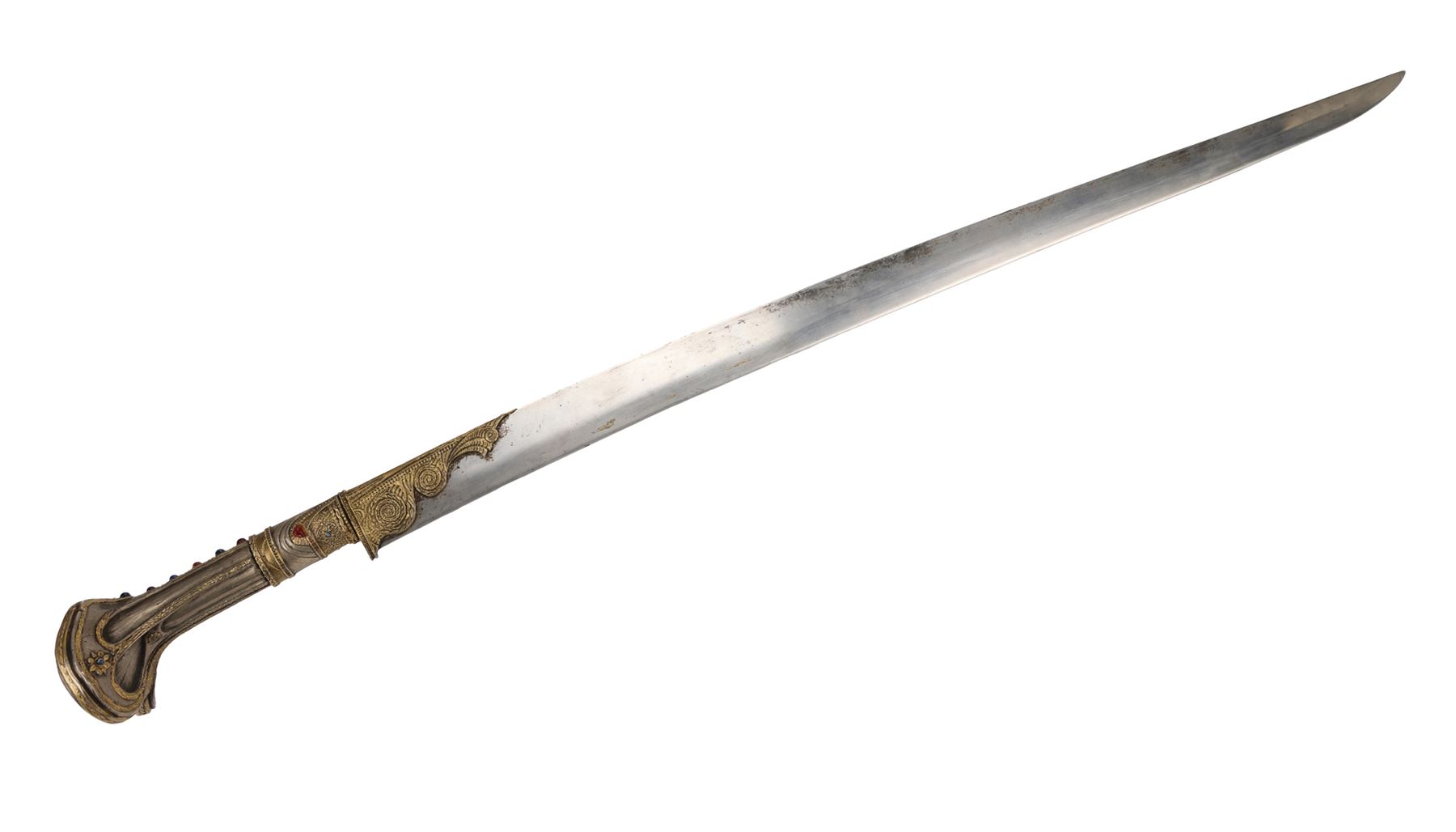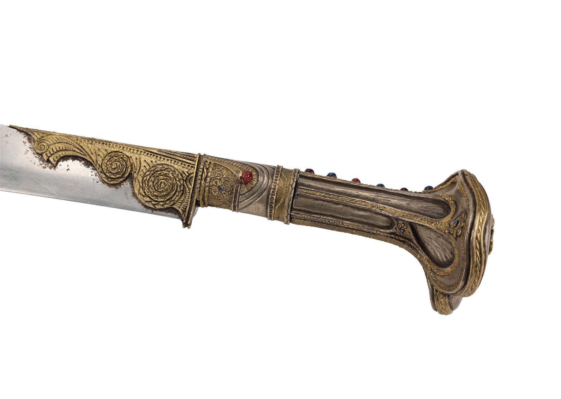 Prince Anders' (Billy Magnussen) sword and scabbard from Guy Ritchie's musical fantasy Aladdin. The Prince wore a sheathed sword when he was introduced to Princess Jasmine (Naomi Scott).