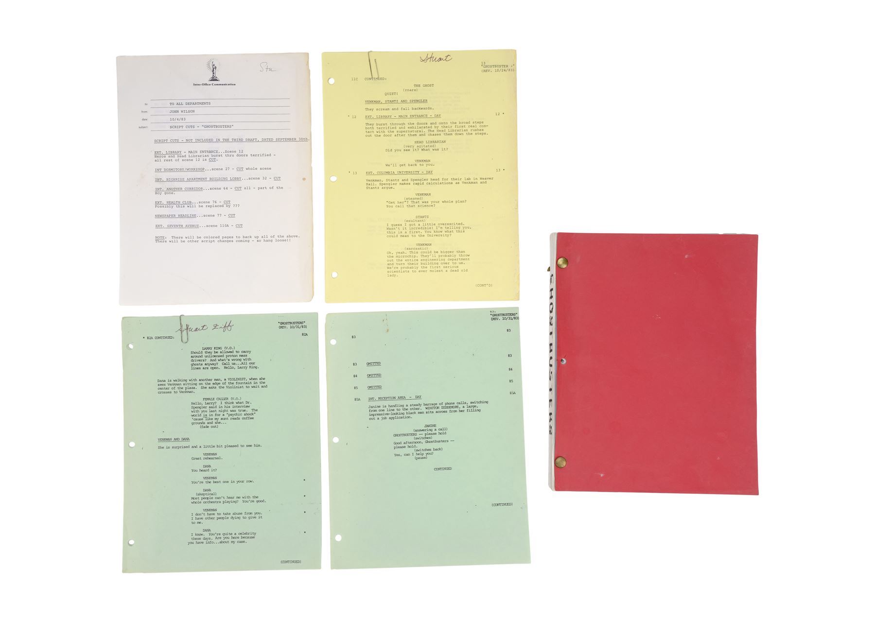 GHOSTBUSTERS (1984) - Stuart Ziff Collection: Bound Revised Third Draft Script with Production Paperwork - Ghost Shop creature effects supervisor Stuart Ziff's personal bound, revised third draft script with paperwork from the production of Ivan Reitman's supernatural comedy Ghostbusters. This lot comes from Ziff's collection. It consists of a brass brad-bound, 138-page script credited to Dan Aykroyd and Harold Ramis, dated "7 October 1983," hand-marked "1006 Stuart Ziff" on the cover, and enclosed in a red folder; eight yellow script revision pages handmarked "Stuart"; two white production memoranda handmarked "Stu"; and five green script revision pages. The paperwork exhibits edge wear, dog earring, and rodent bites from storage. Dimensions: (largest) 8.5" x 11" x 1" (21.5 cm x 28 cm x 2.5 cm)