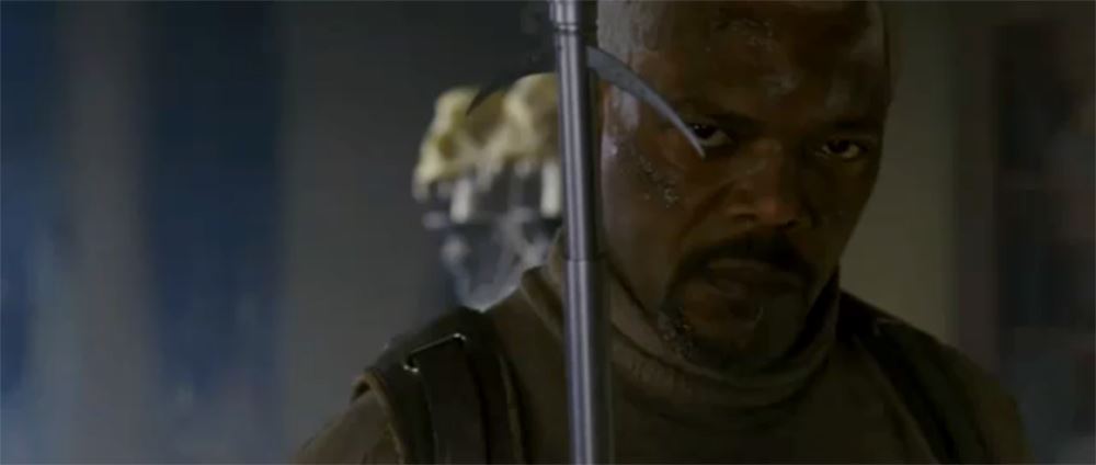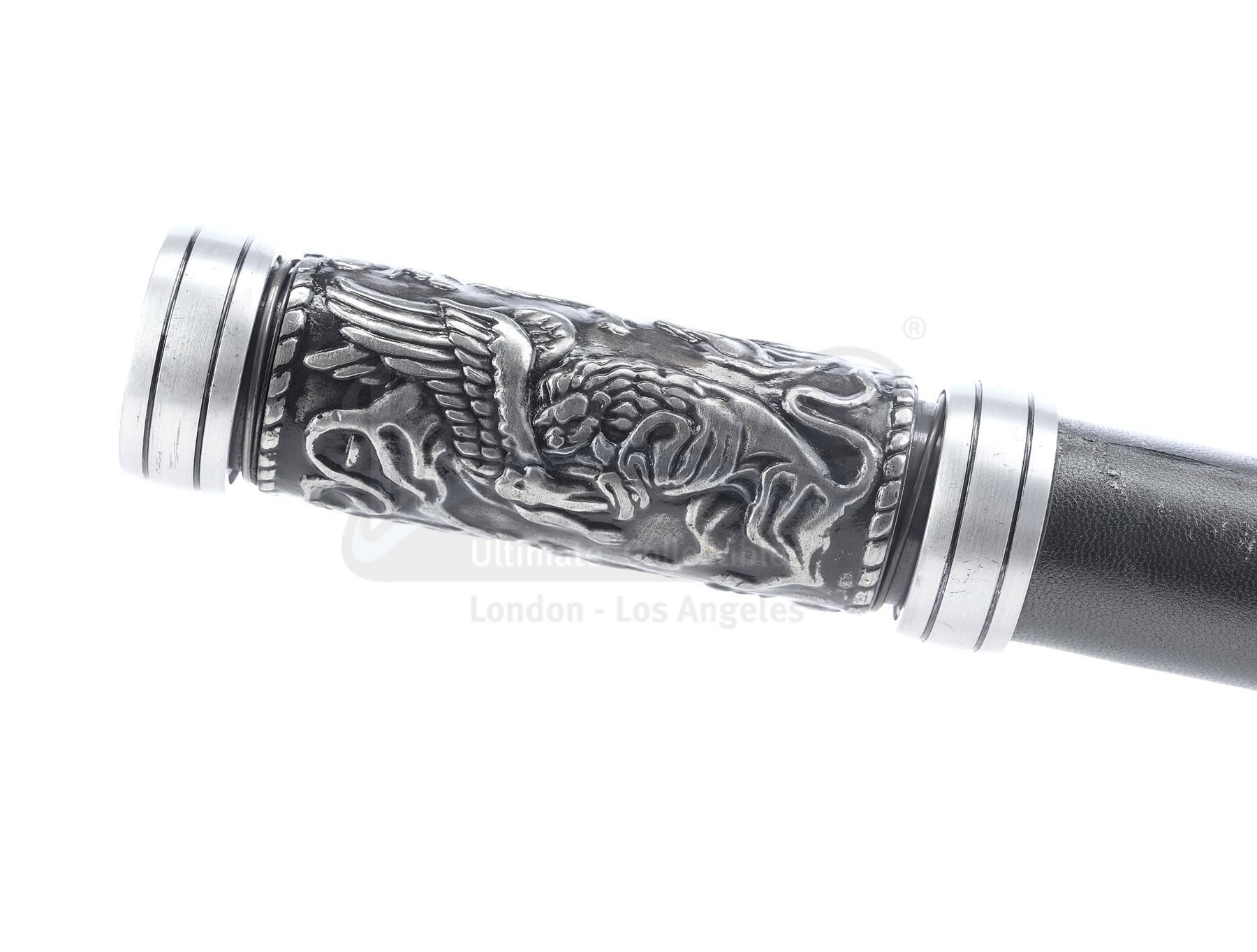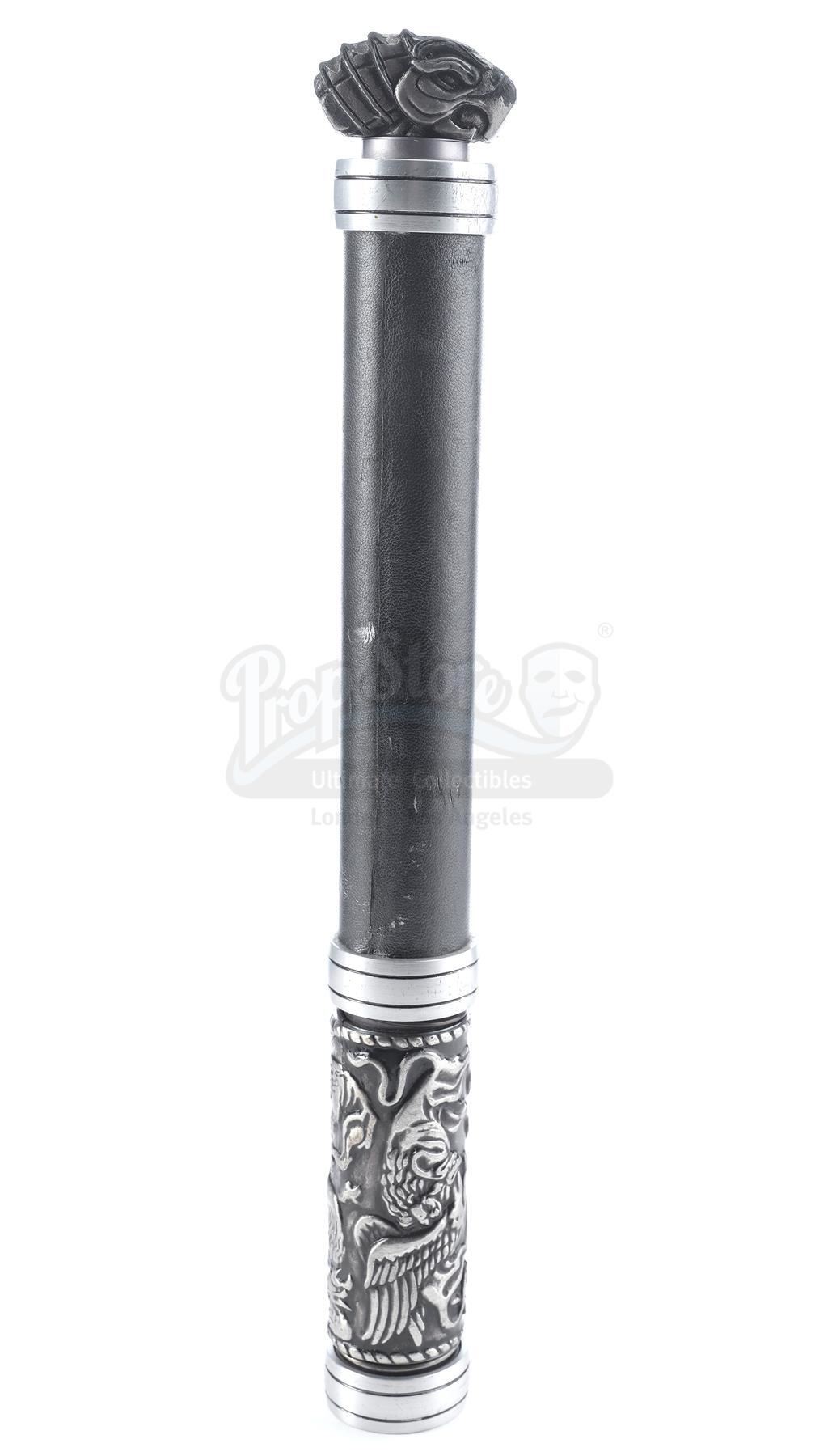 This lot will be auctioned on Wednesday, June 30th. The auction will begin at 9:00am PDT and lots are sold sequentially via live auctioneer; tune in to the live streaming broadcast on auction day to follow the pace. Note other lots in the auction may close on June 29th or July 1st. A Paladin stun rod from Doug Liman's sci-fi adventure Jumper. Roland Cox's (Samuel L. Jackson) Paladins used grappling hook-equipped stun rods to hunt down Teleporters David Rice (Hayden Christensen) and Griffin (Jamie Bell). This static metal, resin, and leatherette stun rod features a gray handle engraved with decorative gryphons and lions and a two-faced eagle totem affixed on top. It exhibits signs of production use, including paint chipping to the body, but remains in excellent overall condition. Dimensions: 14" x 3" x 3" (35.5 cm x 7.75 cm x 7.75 cm) Estimate: $1,500 - 2,500
