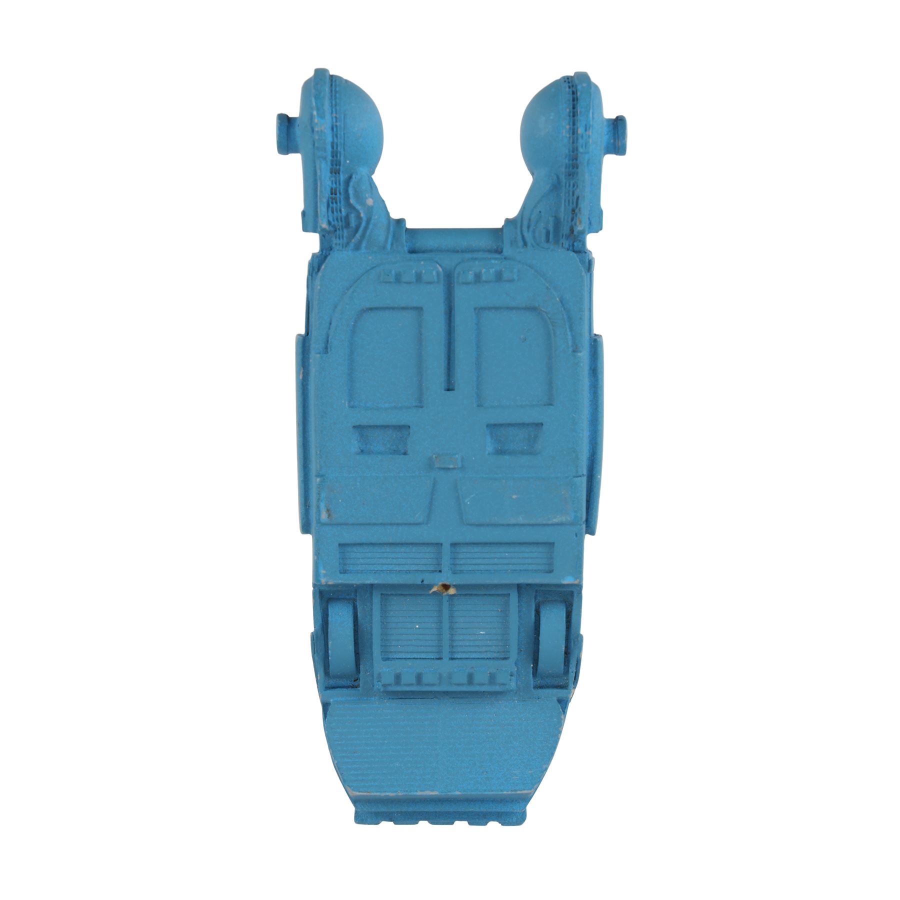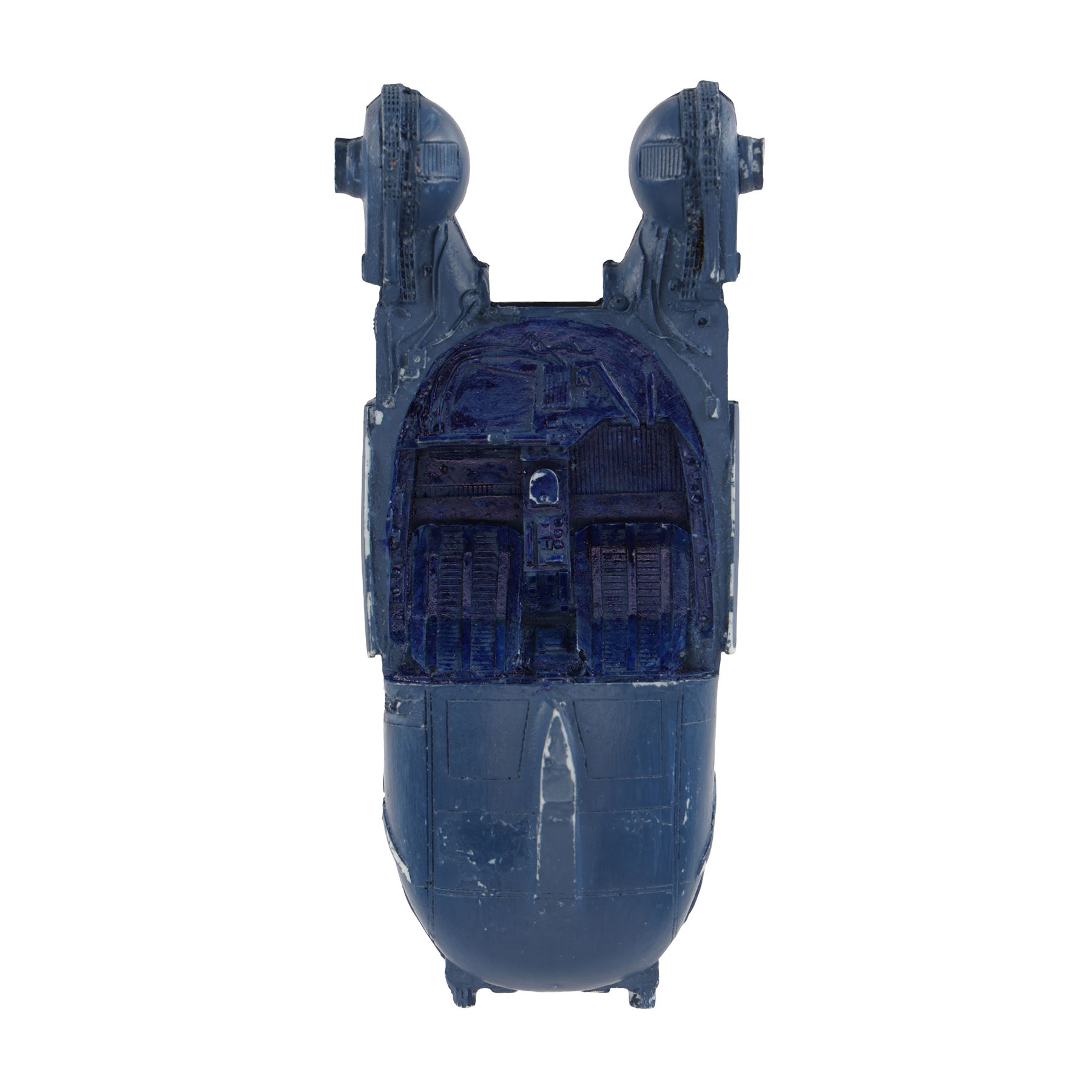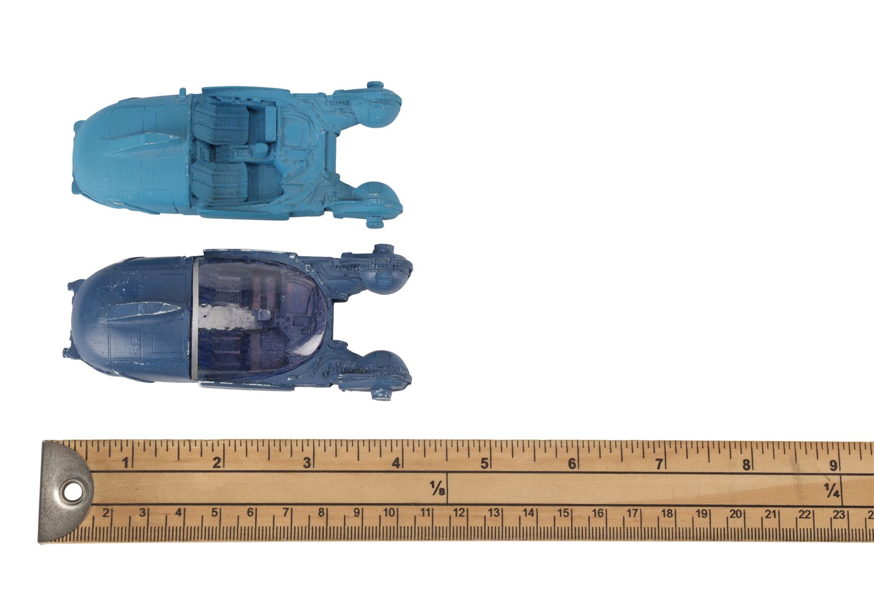 The spinners are made of resin and painted blue. Aerodynamically shaped, each has a pair of front wheel arms, a rear wheel housing, a two-seater cockpit and a roof fin. The spinners feature intricate detailing throughout, including cockpit control panels, seat grooves, pipes and fans. One comes with a removable clear plastic windshield and is finished in two-tone blue paint while the other is unfinished. Glue residue exists on the finished spinner’s base. The spinners exhibit minor signs of wear, including paint scuffs. Dimensions (each): 10 cm x 4 cm x 3 cm (4" x 1 1/2" x 1 1/4")