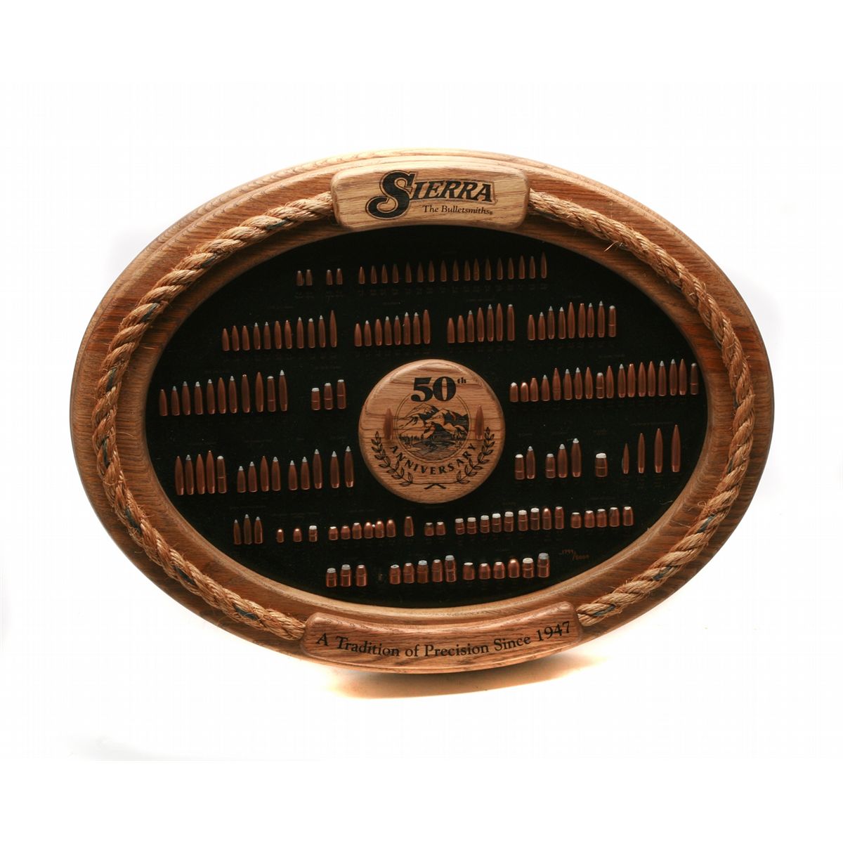 ANIB Limited Edition #1799/5000 Sierra Wood frame 50th Anniversary bullet display board - rope trimmed solid oak oval frame & accents - features 158 handgun & rifle bullets - 24" x 19" framed size - with factory shipping box - non-ffl - 25VVFKIL069