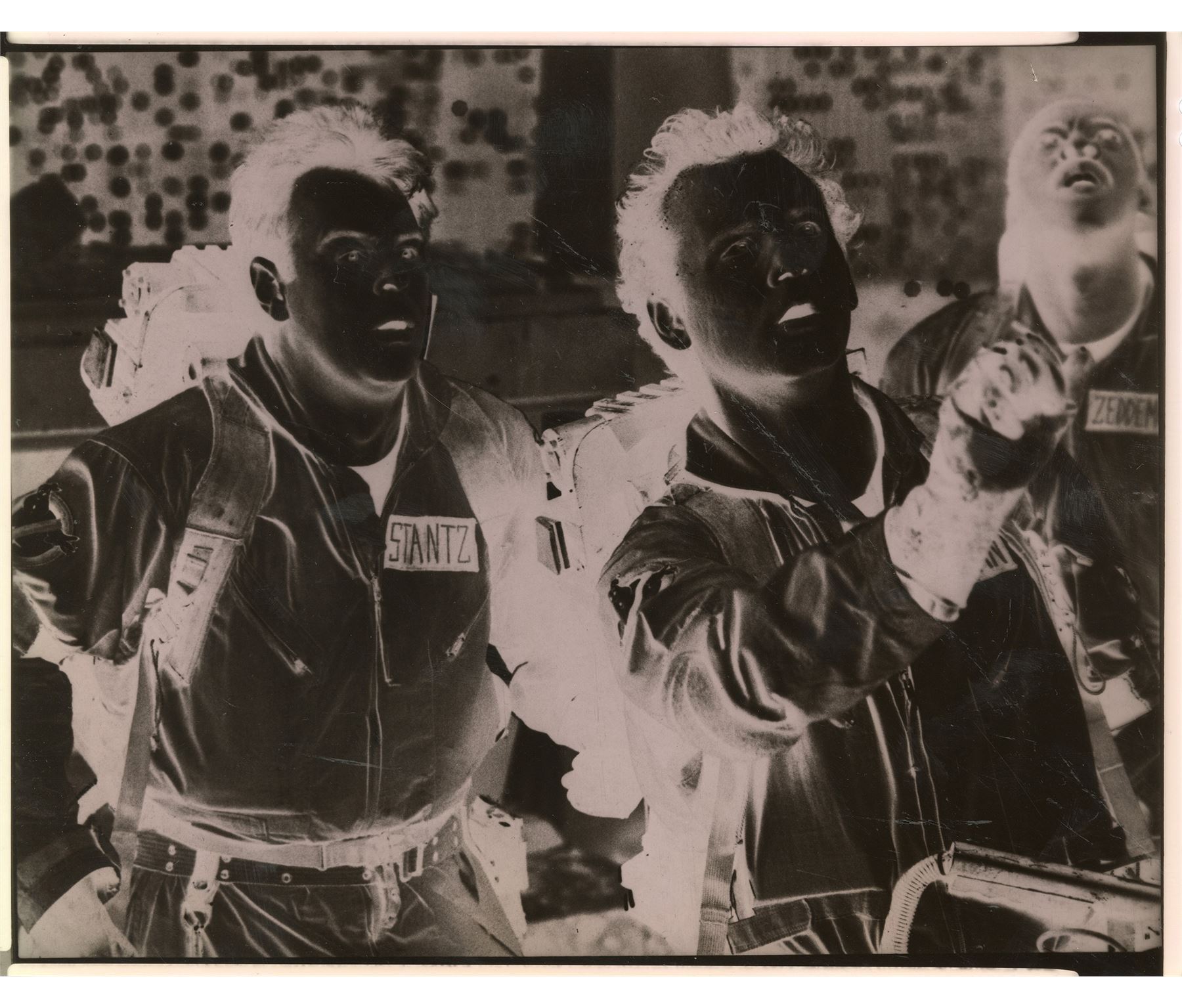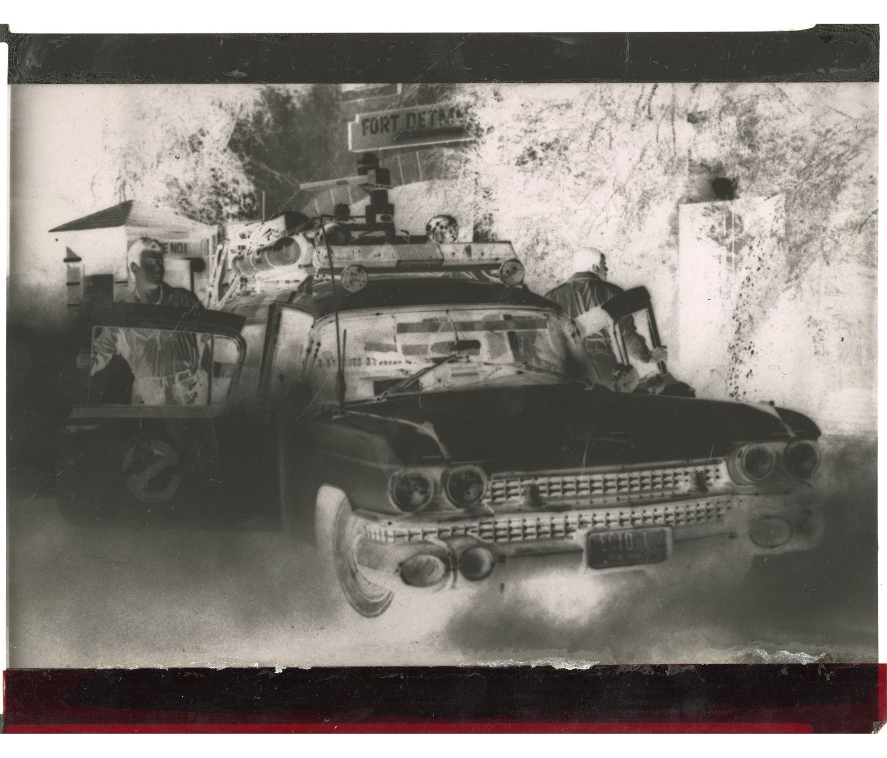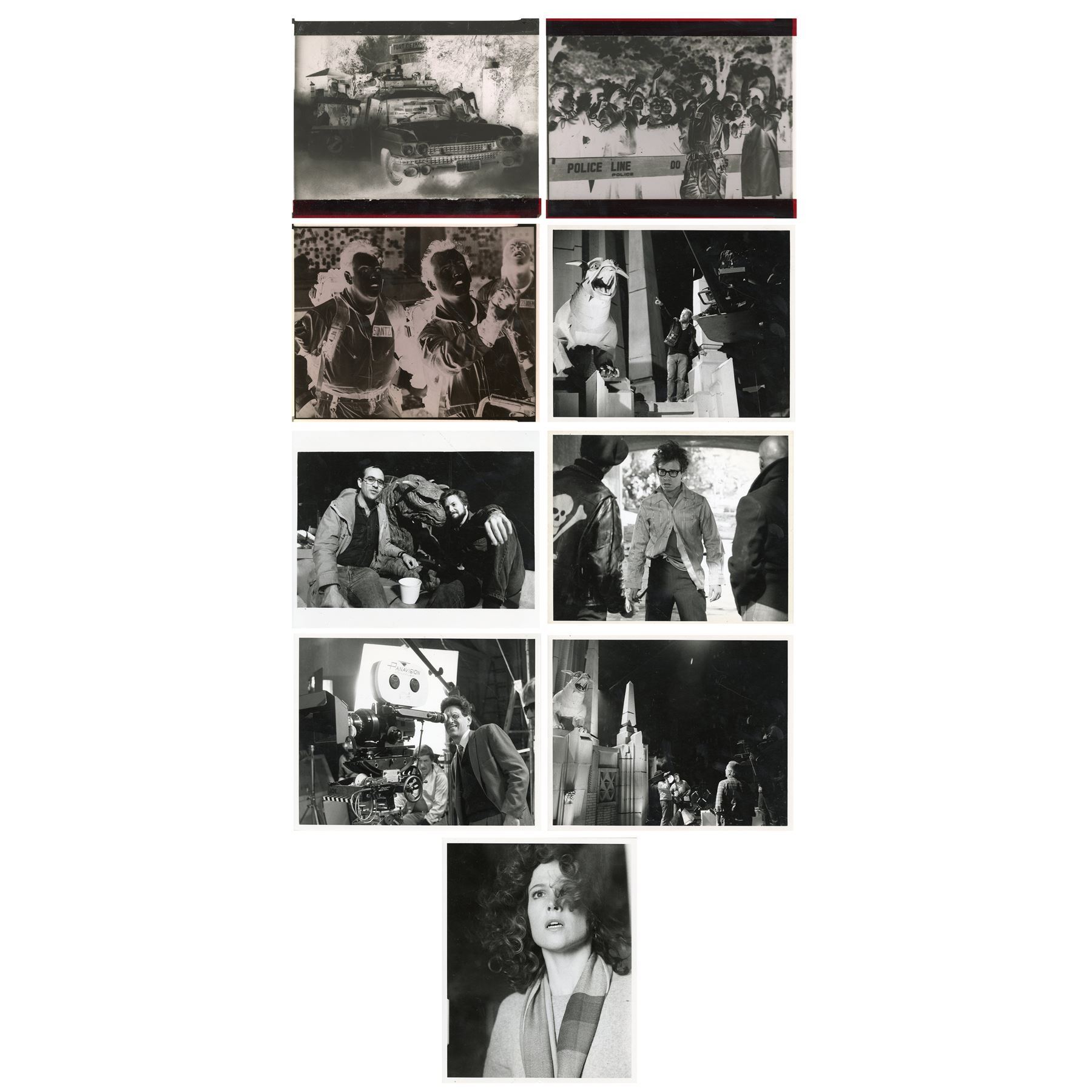 GHOSTBUSTERS (1984) - Set of Behind-the-Scenes Stills and Studio Negatives - Behind-the-scenes stills and studio negatives from the production of Ivan Reitman's sci-fi comedy Ghostbusters. This set consists of two black-and-white glossy production stills of Dana Barrett (Sigourney Weaver) and Louis Tully (Rick Moranis); four black-and-white glossy behind-the-scenes stills featuring Harold Ramis and the Terror Dog statues; and three Columbia Pictures lab negatives featuring the Ghostbusters and the Ecto-1, one of which is unpublished. Each still is hand-numbered and stamped with the Columbia Pictures copyright on the reverse. The set exhibits bending and edge wear throughout from handling. Dimensions: (each) 8.5" x 11" (21.75 cm x 28 cm)