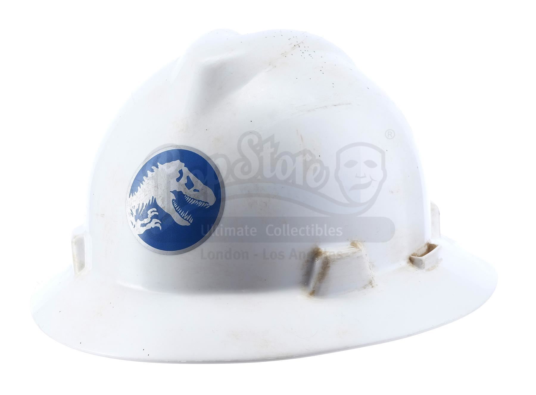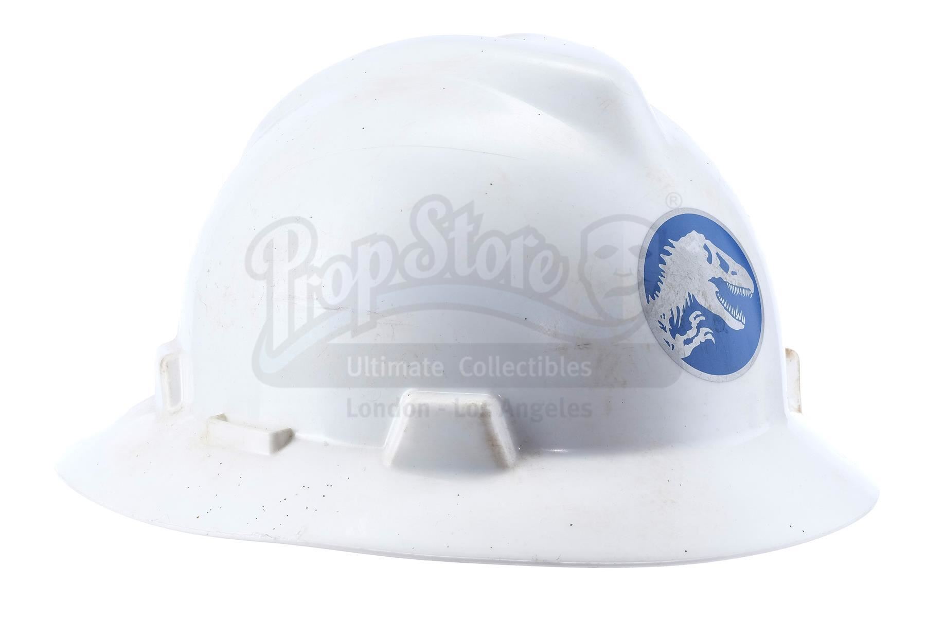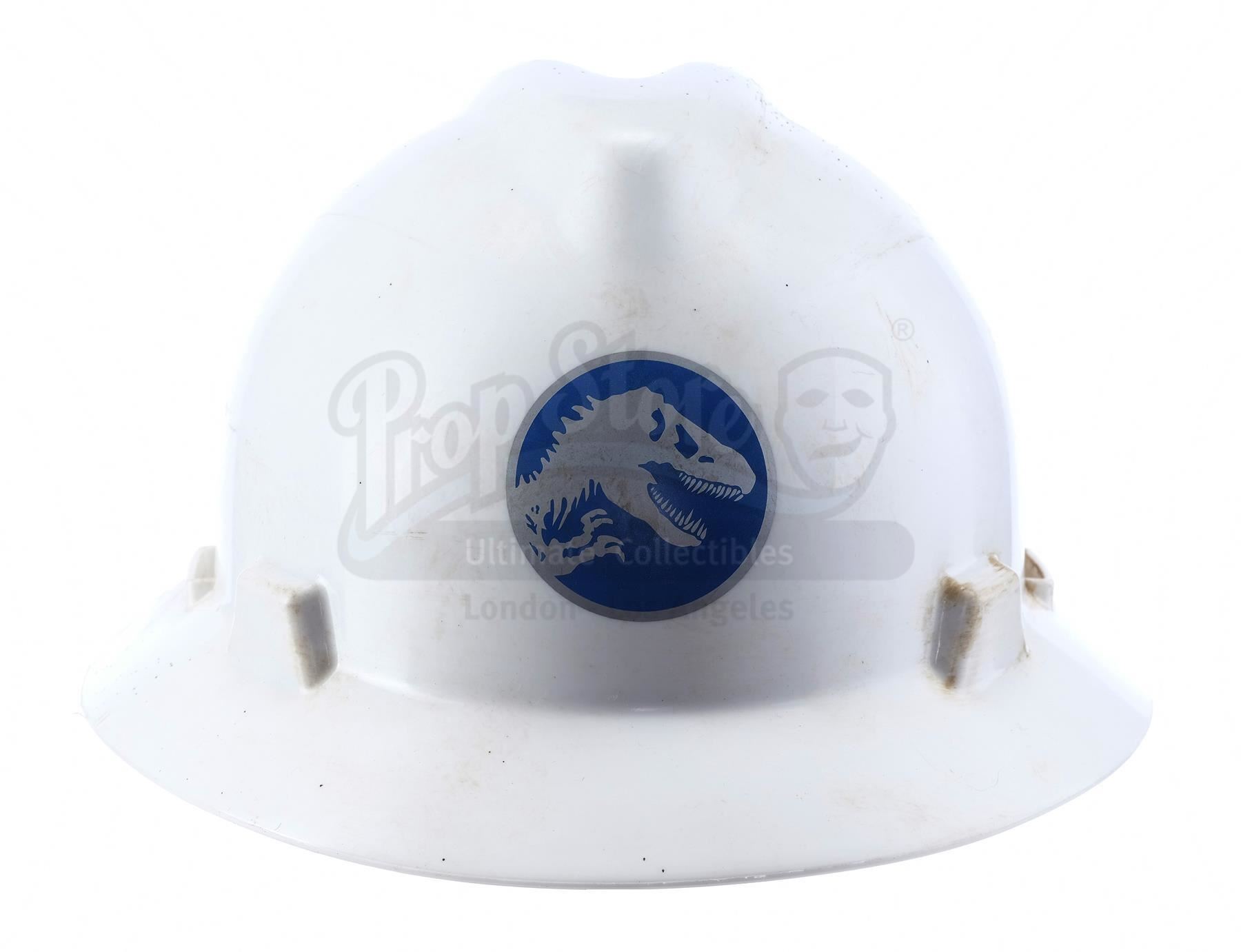 This lot will be auctioned on Wednesday, June 30th. The auction will begin at 9:00am PDT and lots are sold sequentially via live auctioneer; tune in to the live streaming broadcast on auction day to follow the pace. Note other lots in the auction may close on June 29th or July 1st. A Jurassic World employee hard hat from Colin Trevorrow's sci-fi adventure sequel Jurassic World. Park employees wore their hard hats while undergoing the construction of the paddock that housed the new genetically designed Indominus Rex. Made from rigid white plastic, the hat features a circular silver-color and blue Jurassic World logo on the front. It displays a green "MSA" vinyl applique on the side. The piece contains a gray and black adjustable comfort liner fitted within. The hat shows distress for use on the production and stains throughout. Dimensions: 12" x 10.5" x 6.25" (30 cm x 27 cm x 16 cm). Estimate: $1,500 - 2,500