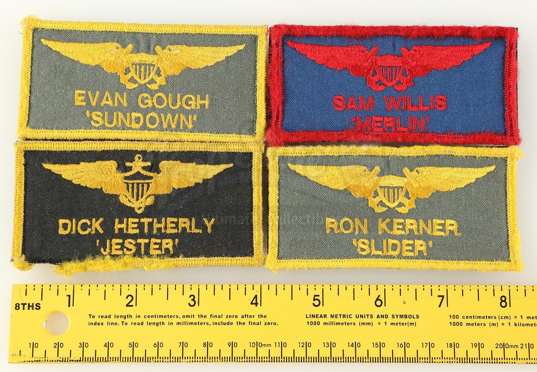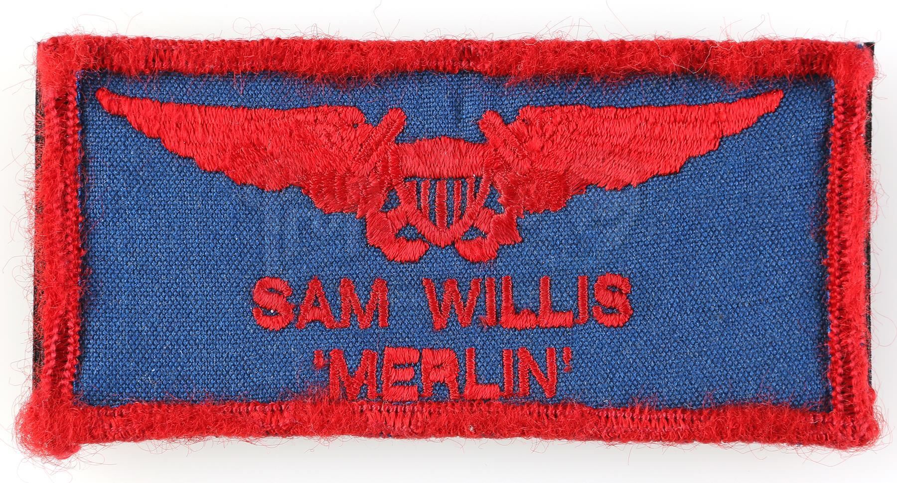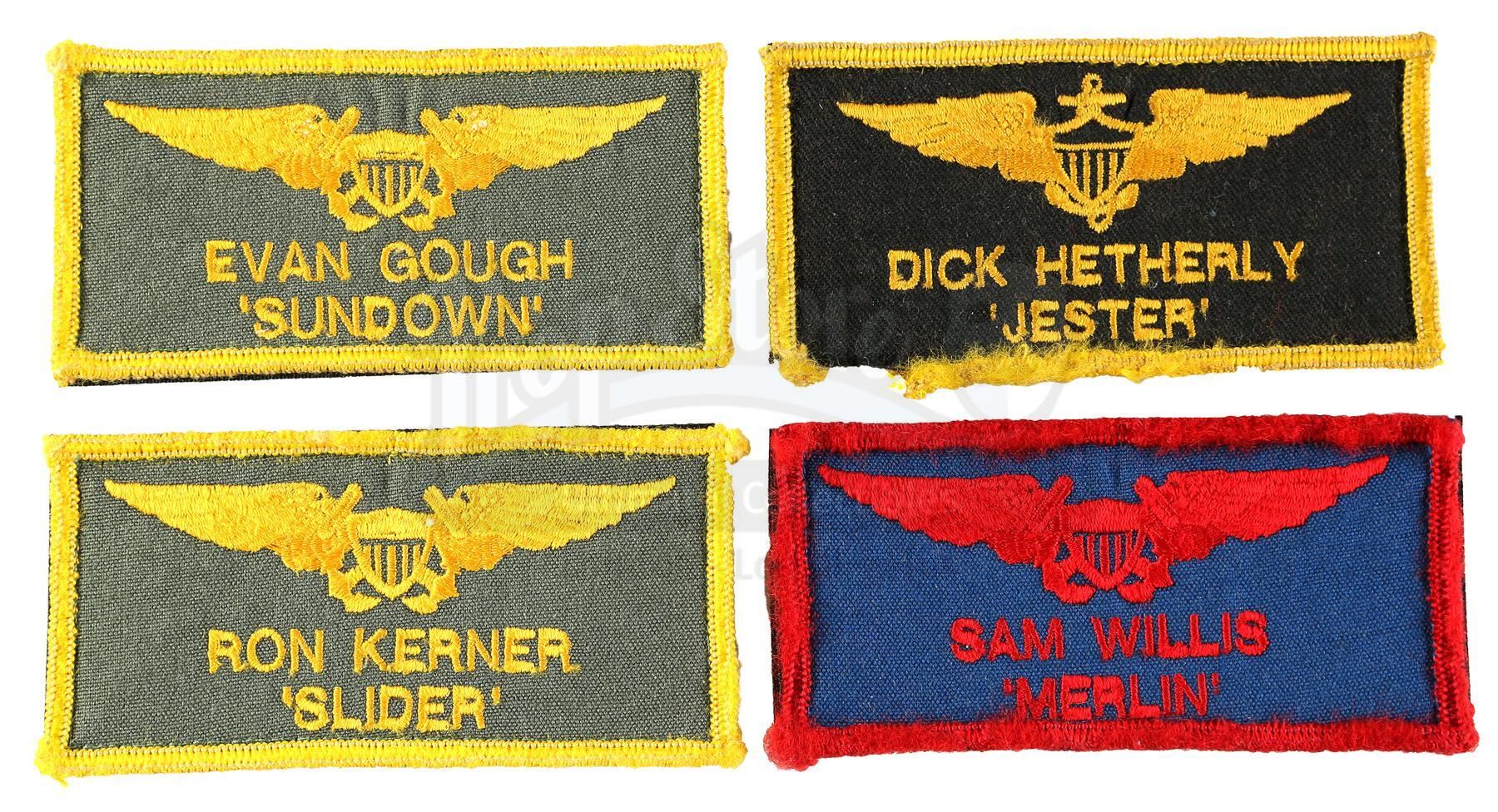 Merlin (Tim Robbins), Jester (Michael Ironside), Slider (Rick Rossovich) and Sundown's (Clarence Gilyard Jr.) flight suit patches from Tony Scott's action drama Top Gun. Radio intercept officers Sam "Merlin" Willis, Ron "Slider" Kerner and Evan "Sundown" Gough wore their flight suits with ID patches while training at the Naval Air Station Miramar's elite "Top Gun" fighter program under the instruction of their commanding officer, Dick "Jester" Hetherly.