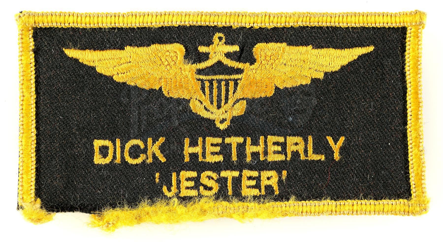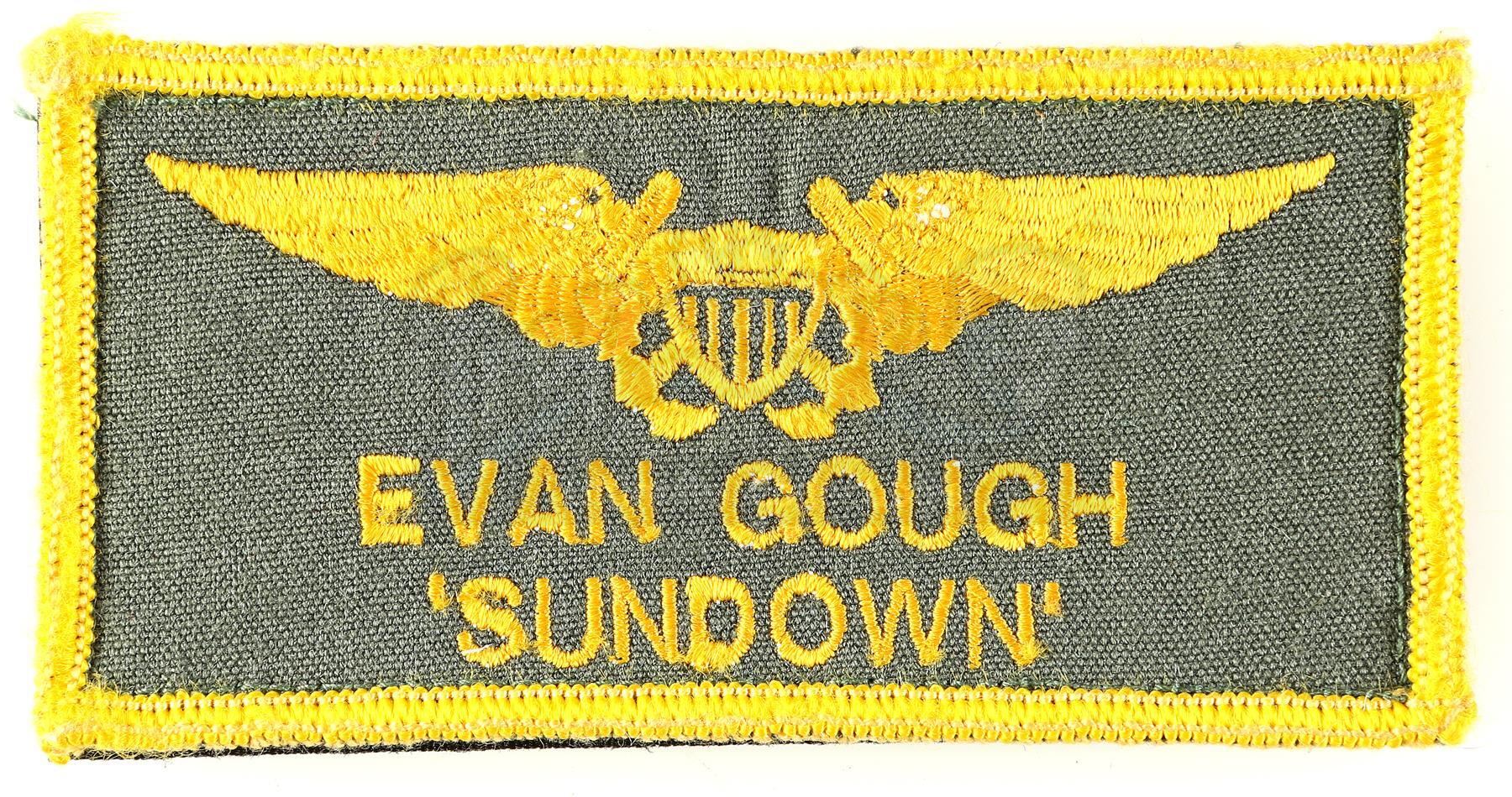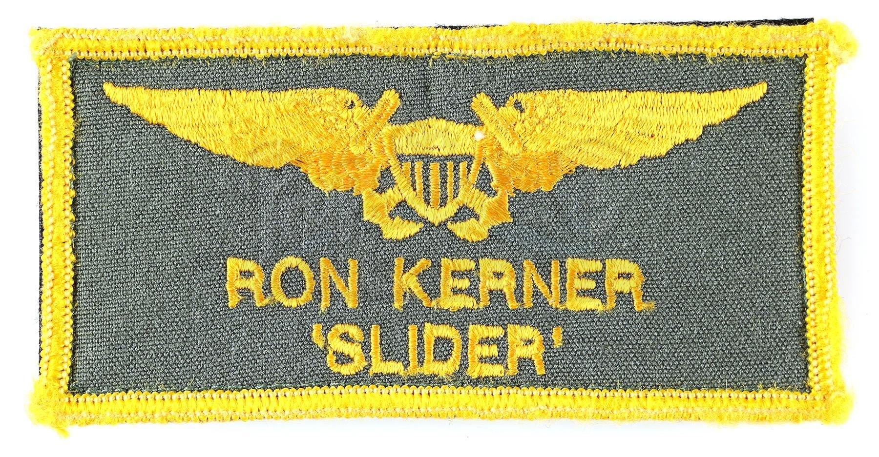 Merlin (Tim Robbins), Jester (Michael Ironside), Slider (Rick Rossovich) and Sundown's (Clarence Gilyard Jr.) flight suit patches from Tony Scott's action drama Top Gun. Radio intercept officers Sam "Merlin" Willis, Ron "Slider" Kerner and Evan "Sundown" Gough wore their flight suits with ID patches while training at the Naval Air Station Miramar's elite "Top Gun" fighter program under the instruction of their commanding officer, Dick "Jester" Hetherly.