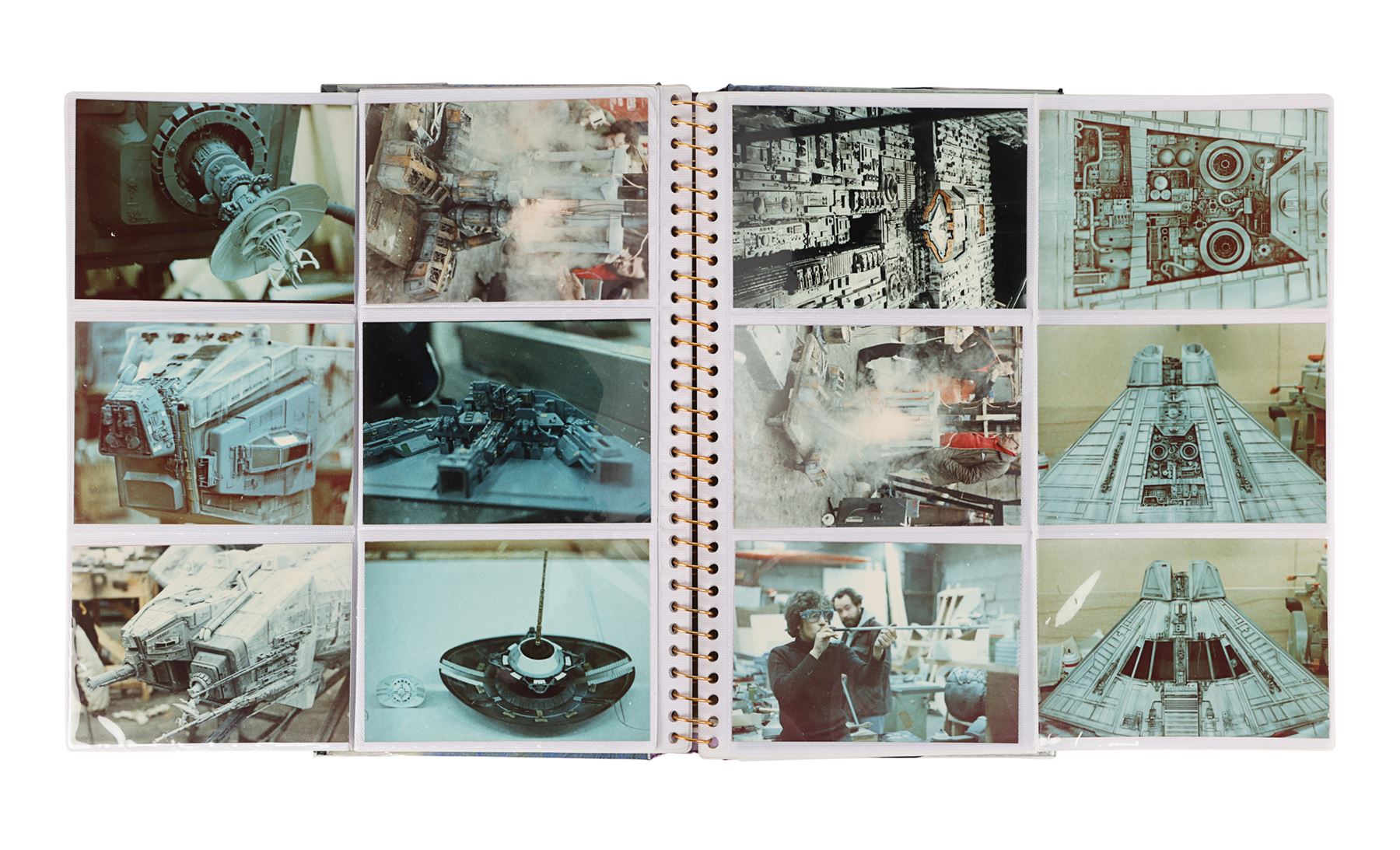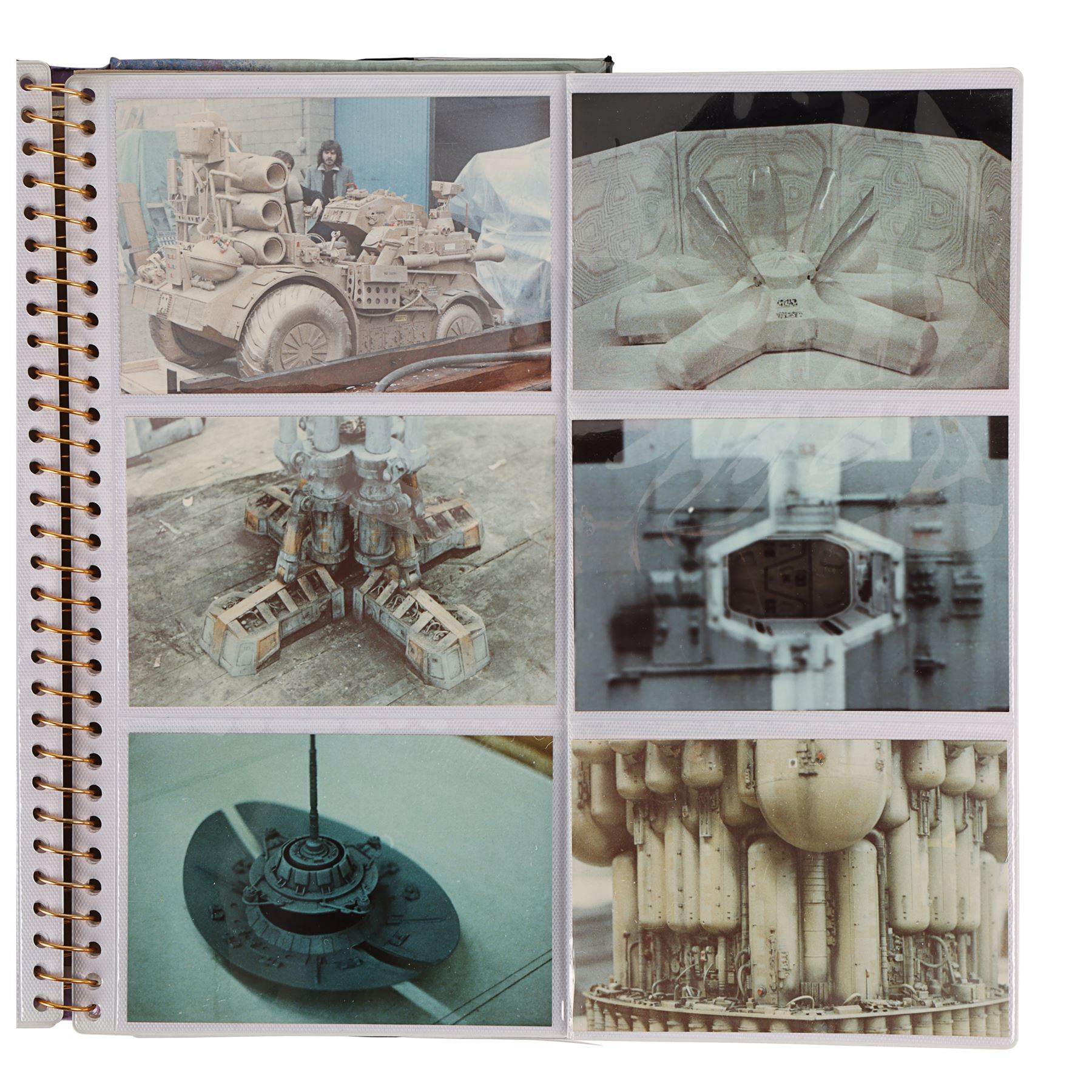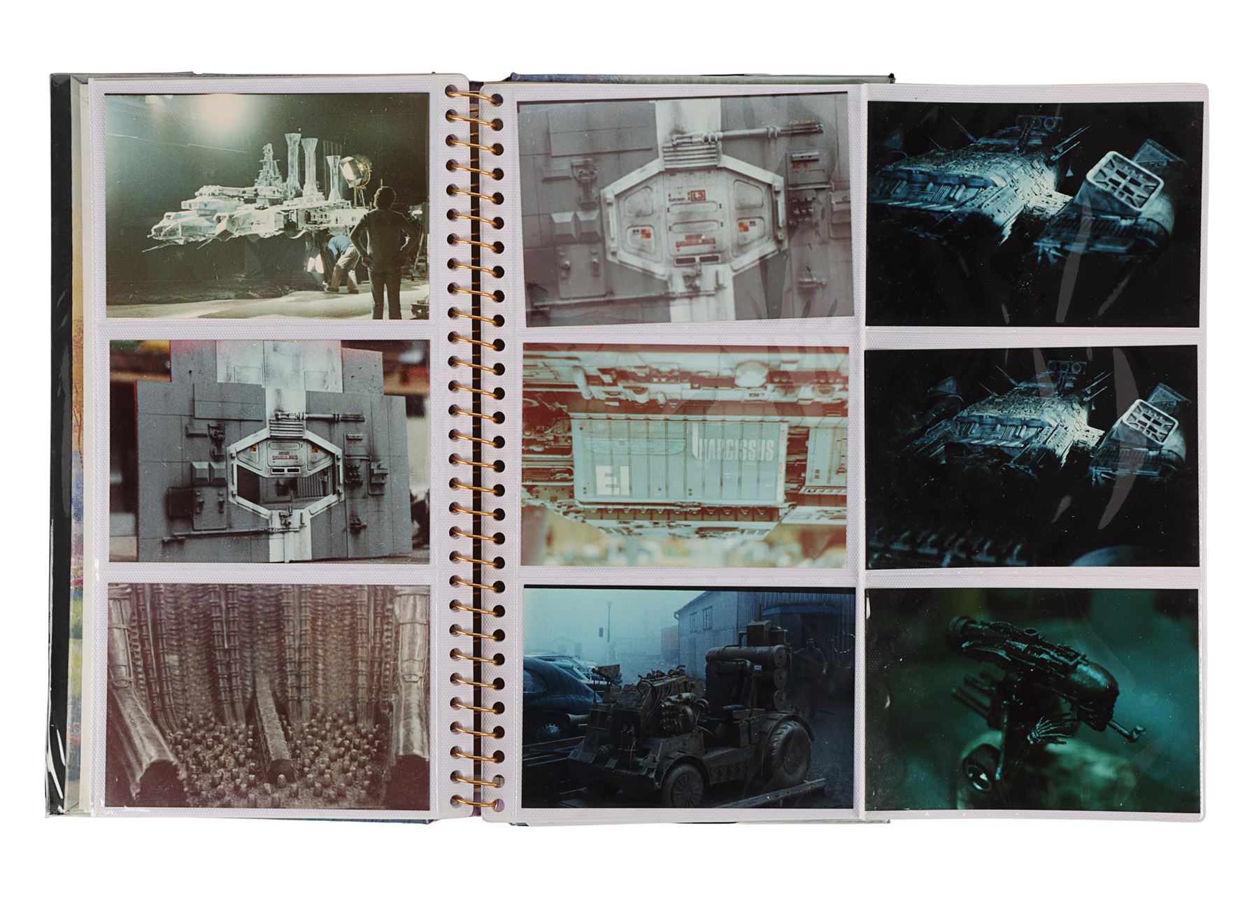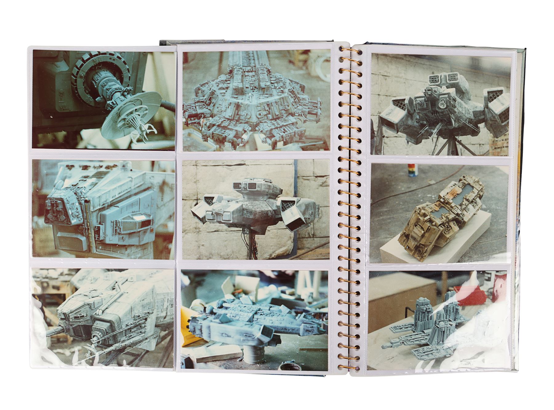 A collection of photographs from the production of Ridley Scott's sci-fi horror Alien. The photographs exhibit model miniatures of various spacecraft, including the Alien ship Derelict, the space tug USCSS Nostromo, and its shuttlecraft, the Narcissus. Also featured in the collection are photographs of the Alien, the Nostromo's survey buggy and the space suit EVA helmet.
