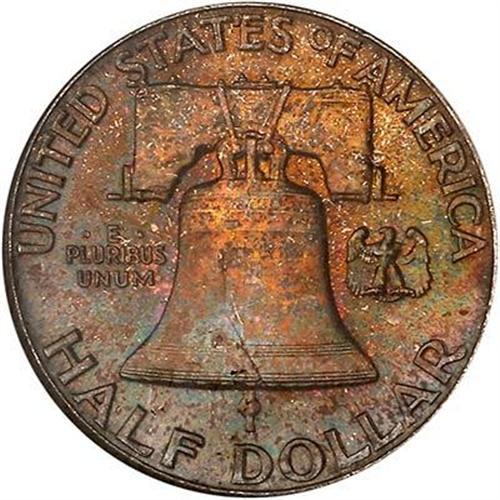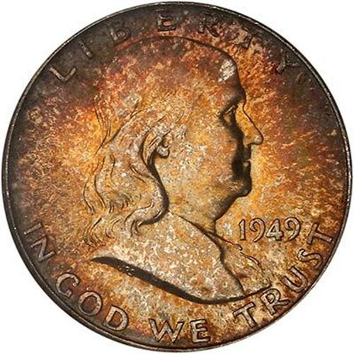 1949 Franklin Half Dollar. Beautifully toned on either side, the luster beneath glows and swirls with cartwheel splendor. (#86653)