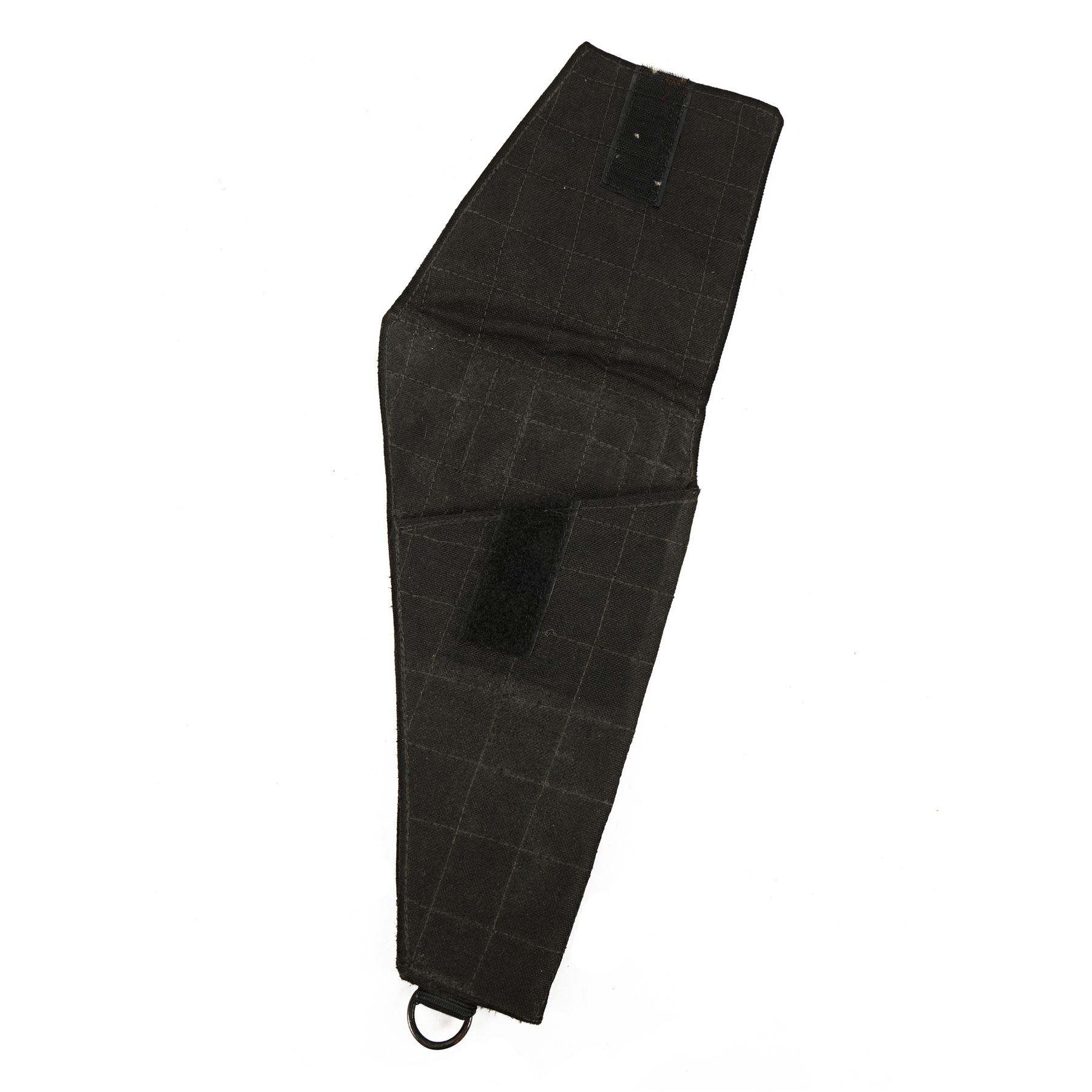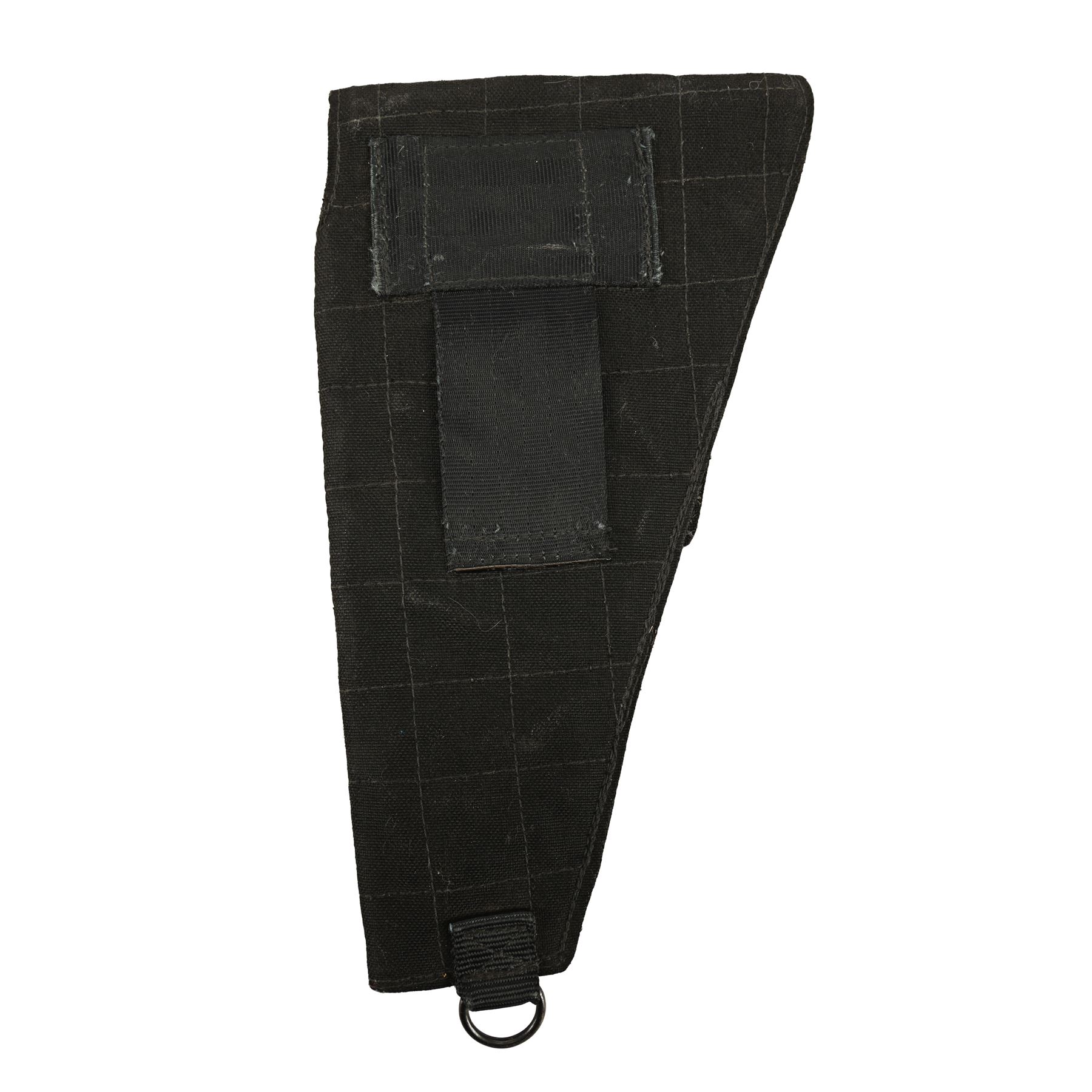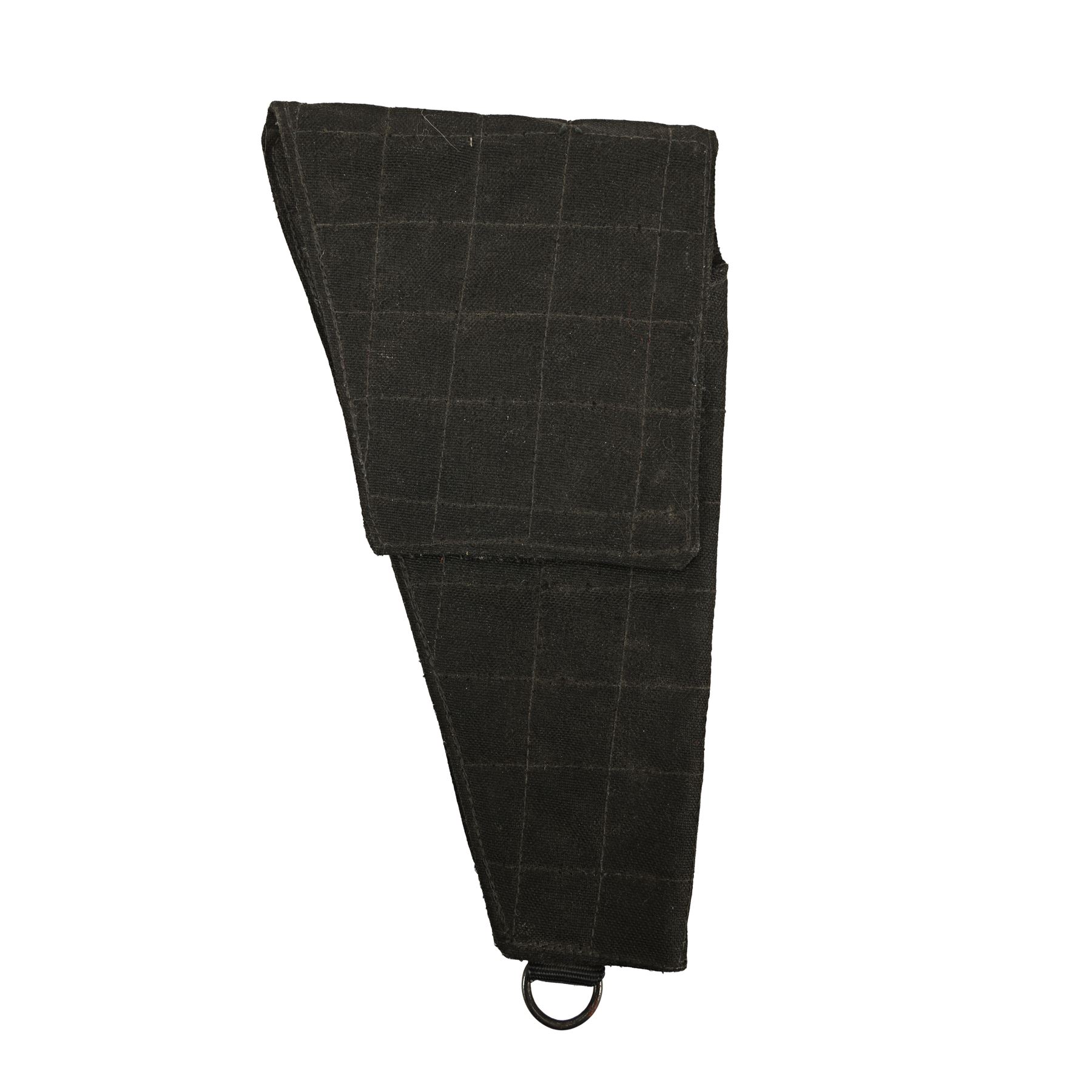 The holster is made of black canvas with a Velcro fastening and a loop on the back where it can be attached to a belt. A metal ring is attached to the bottom of the holster. It has some wear from production use and age, including plucking and loose threads, and the metal ring shows some rust. Dimensions: 31 cm x 16 cm x 2 cm (12 1/4" x 6 1/4" x 3/4")