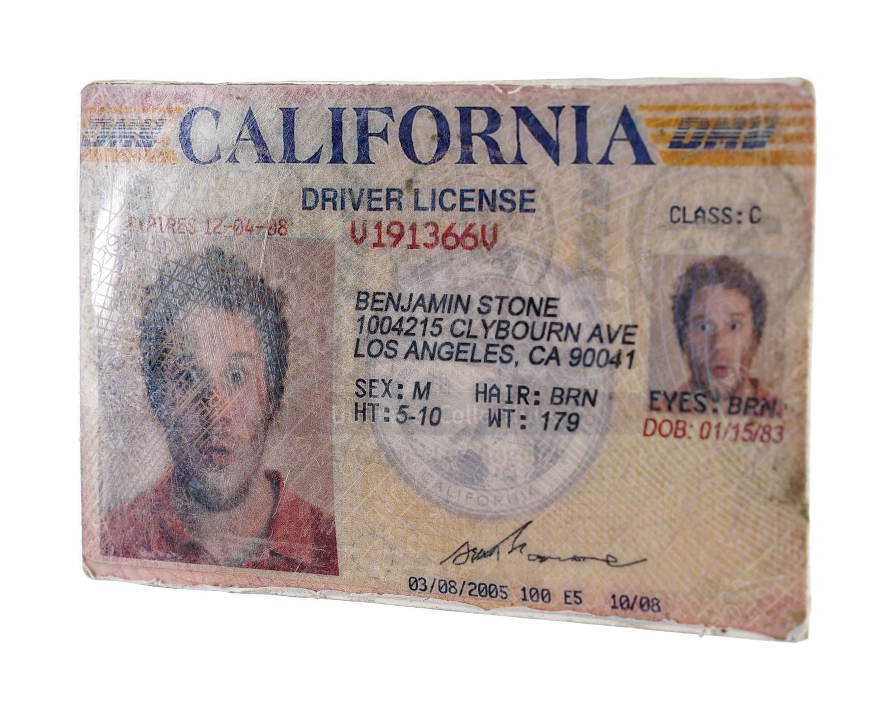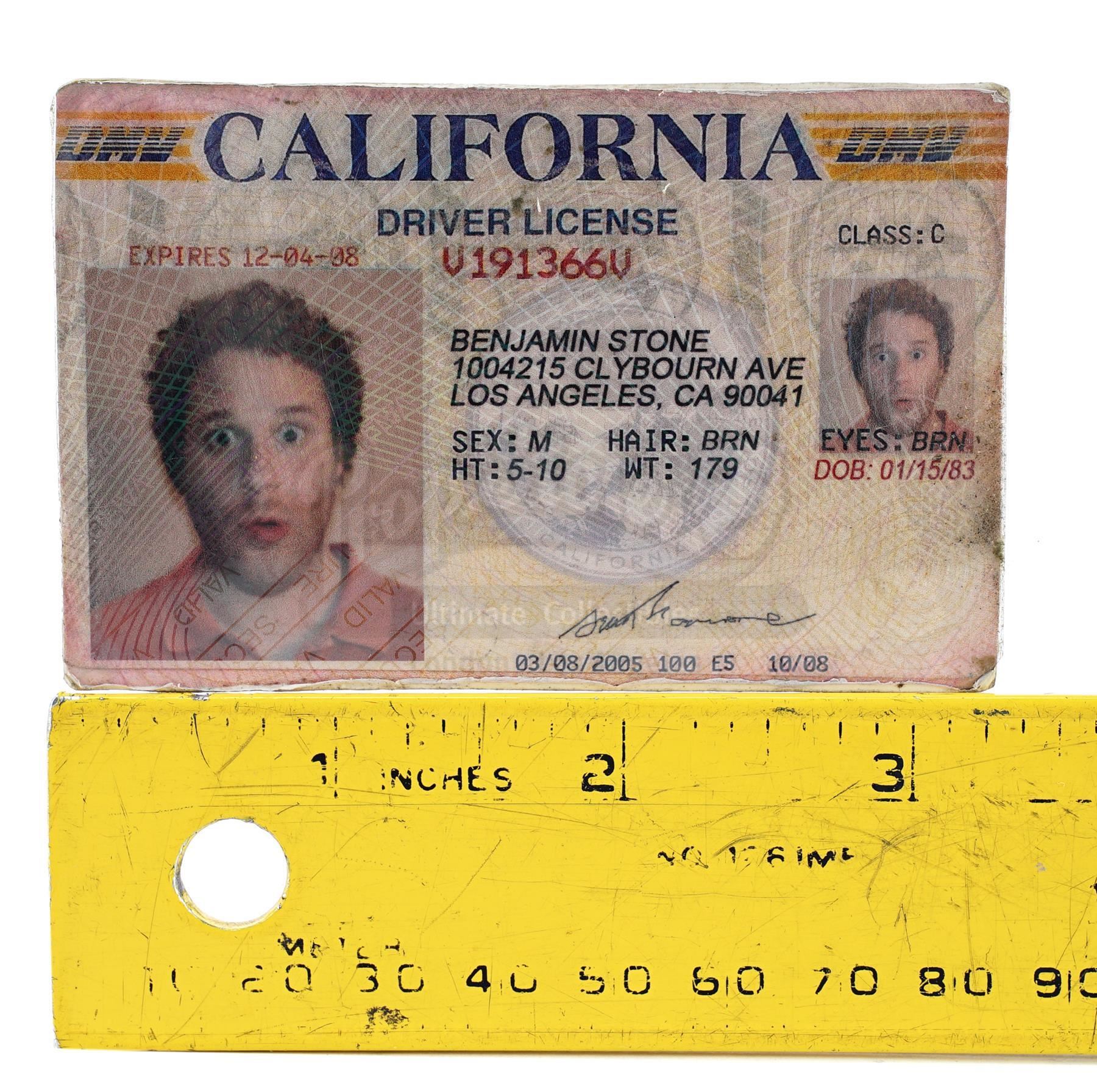 This lot will be auctioned on Wednesday, June 30th. The auction will begin at 9:00am PDT and lots are sold sequentially via live auctioneer; tune in to the live streaming broadcast on auction day to follow the pace. Note other lots in the auction may close on June 29th or July 1st. Ben Stone's (Seth Rogen) driver's license from Judd Apatow's romantic comedy film Knocked Up. Slacker Ben Stone revealed that he was 23 years old to Alison Scott (Katherine Heigl) after their one-night stand resulted in a pregnancy. This California driver's license is made of plastic and features a photo of Rogen as Stone along with the character's fictional address and basic identification information. It is in good overall condition with some wear from production, including scuffing, stains, and peeling around the edges. Dimensions: 3.25" x 2.25" x 0.25" (8.5 cm x 5.75 cm x 0.75 cm) Estimate: $800 - 1,200
