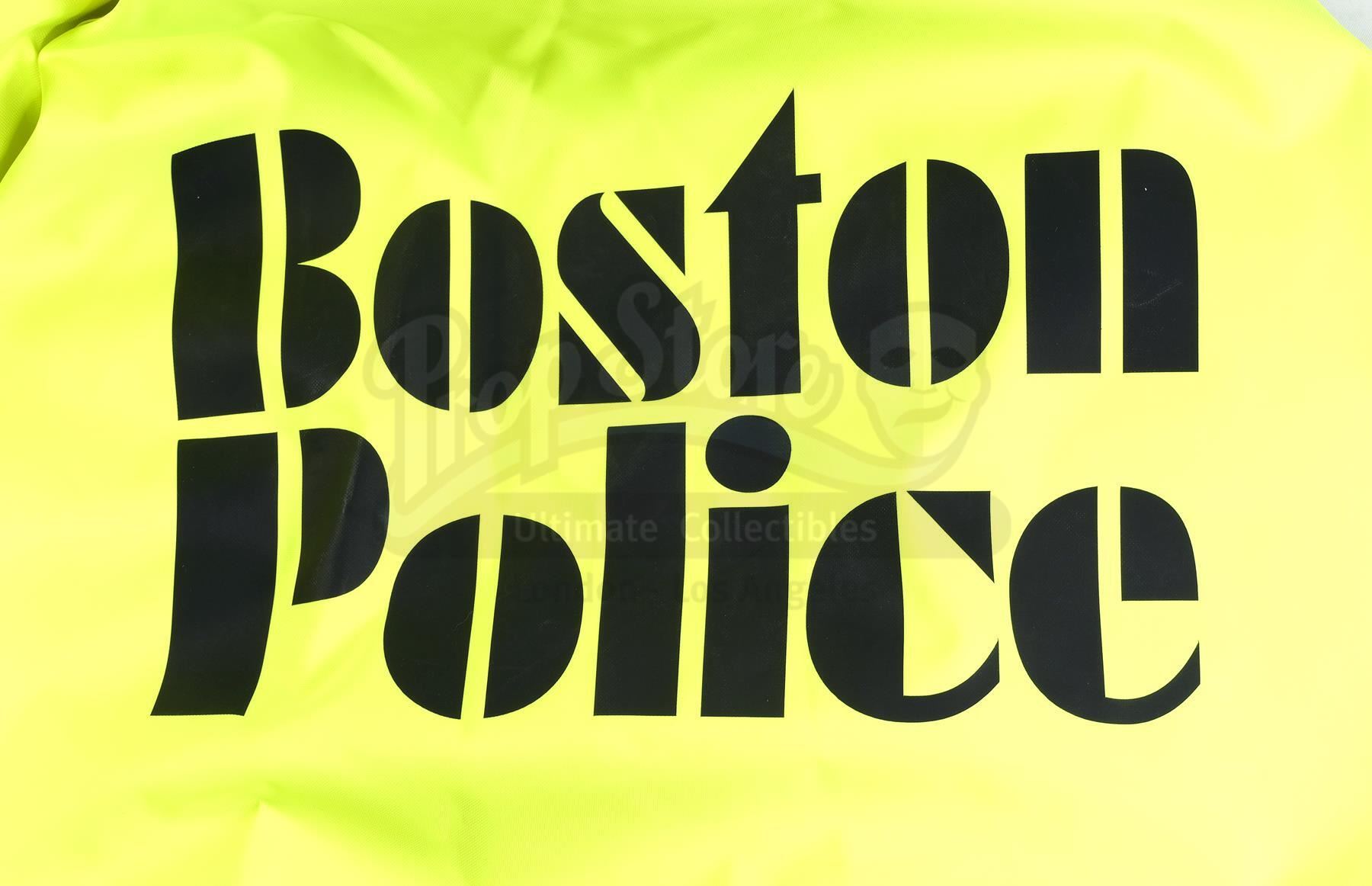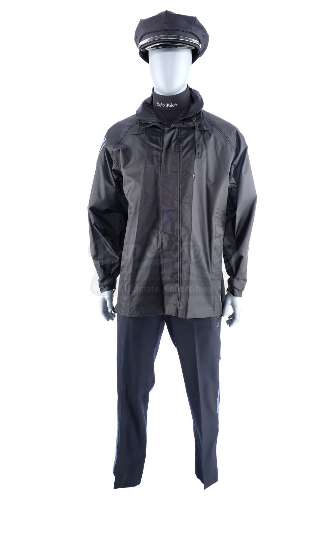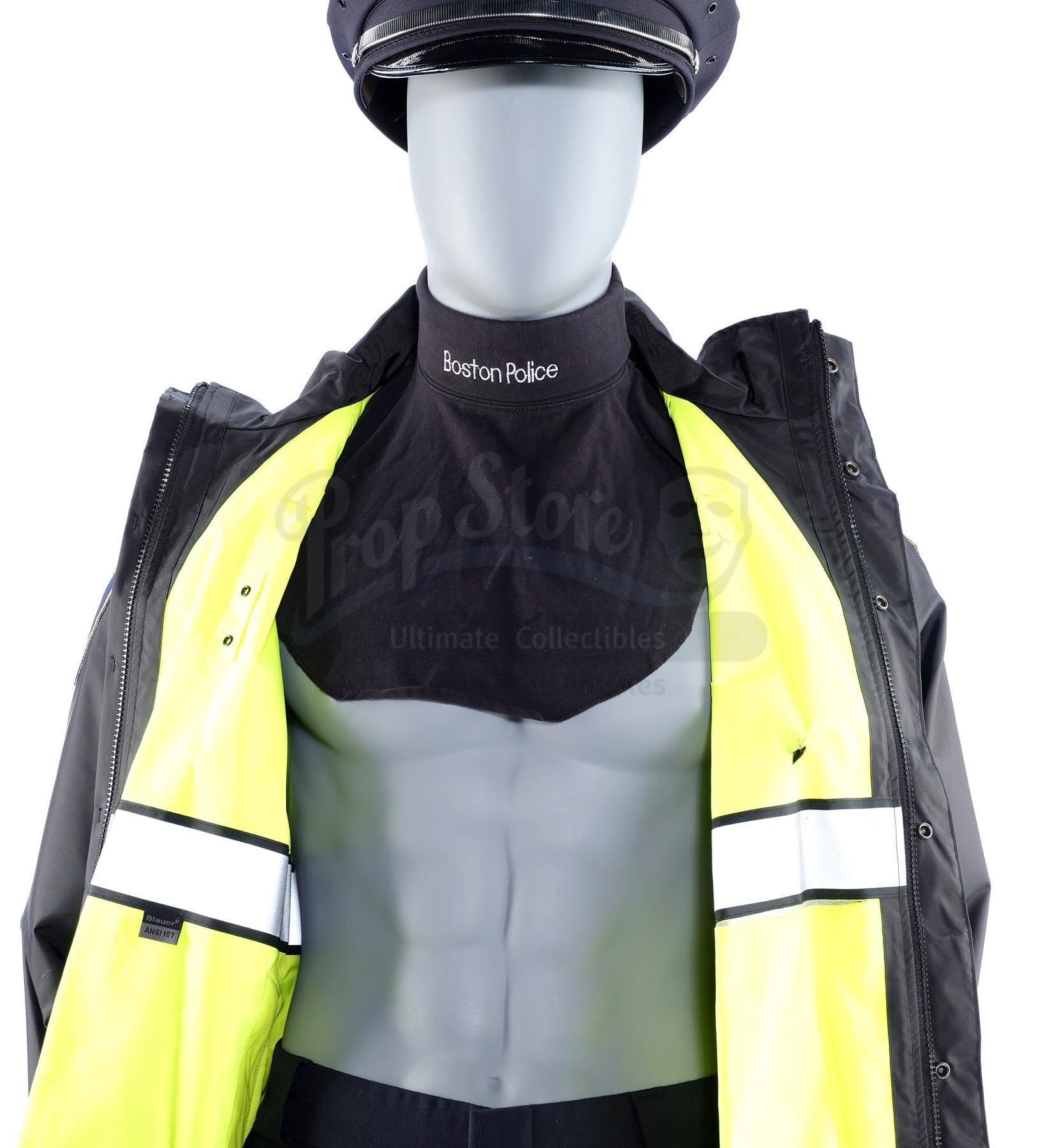 This costume consists of a reversible polyester and nylon jacket featuring one black side with a pair of Boston Police patches on the shoulders, and one fluorescent yellow side with a gray stripe and "BOSTON POLICE" on the back; a pair of navy pants with "DOUG" written on an interior tag; a navy police officer's hat labeled "DOUG" on the interior; and a black polyester blend Boston Police neck warmer. This costume is in excellent overall condition with some wear from production throughout all items and a hole in the front of the jacket.