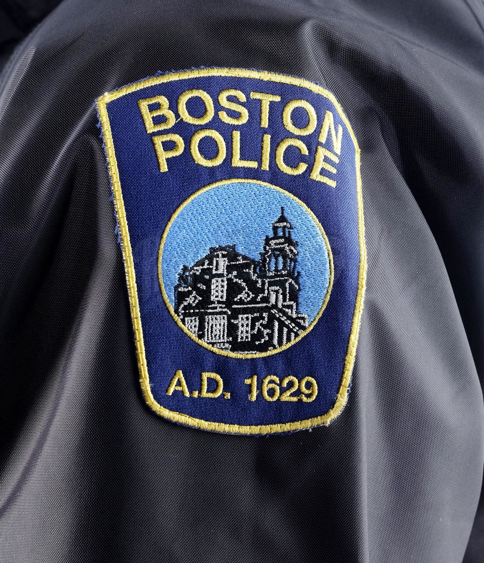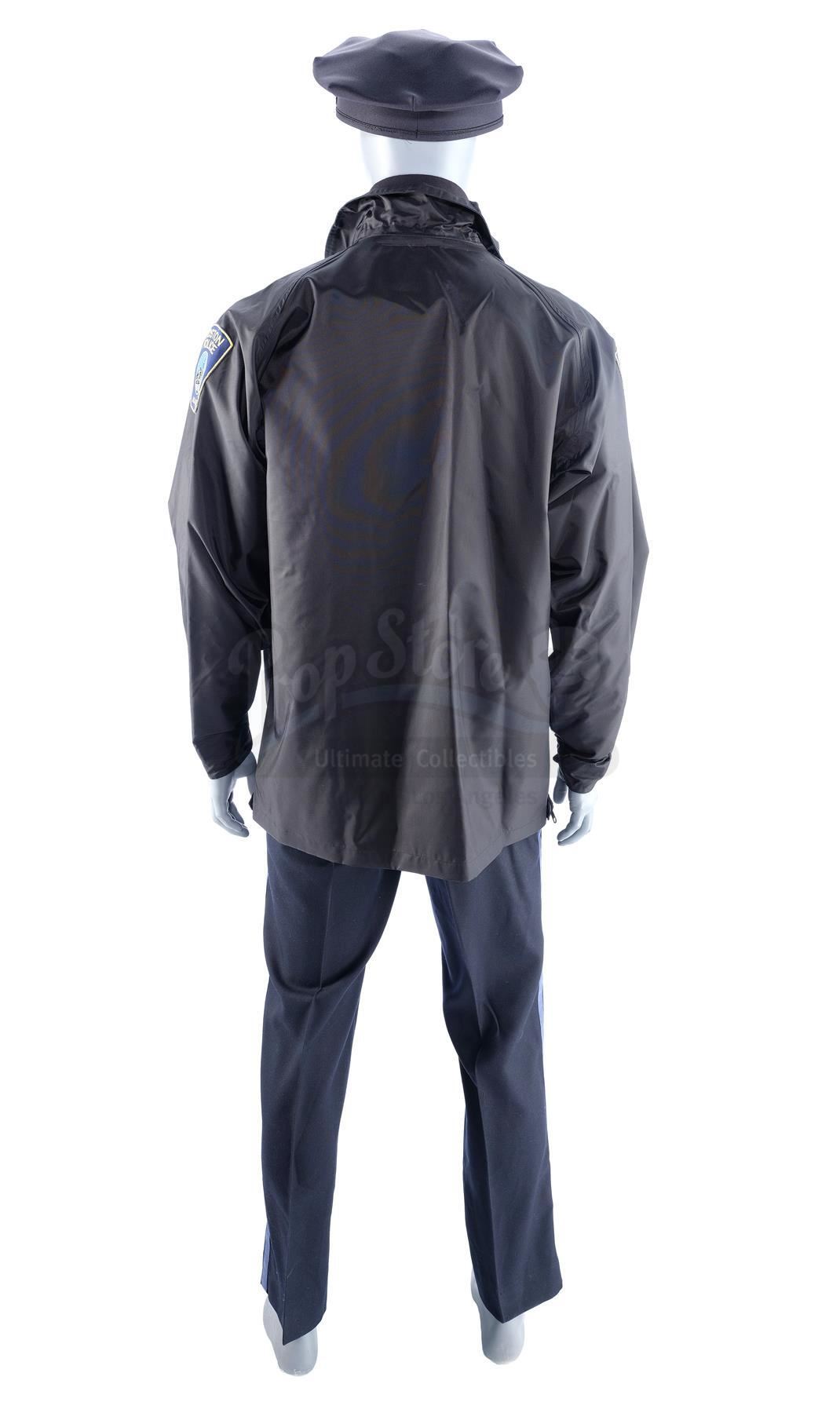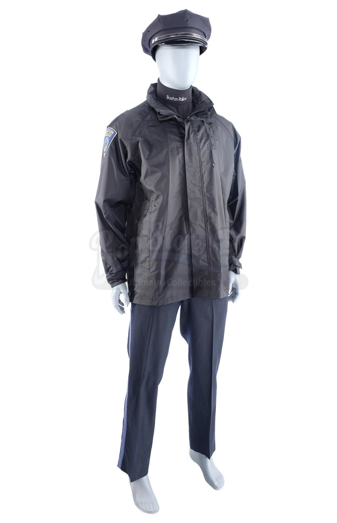 This costume consists of a reversible polyester and nylon jacket featuring one black side with a pair of Boston Police patches on the shoulders, and one fluorescent yellow side with a gray stripe and "BOSTON POLICE" on the back; a pair of navy pants with "DOUG" written on an interior tag; a navy police officer's hat labeled "DOUG" on the interior; and a black polyester blend Boston Police neck warmer. This costume is in excellent overall condition with some wear from production throughout all items and a hole in the front of the jacket.