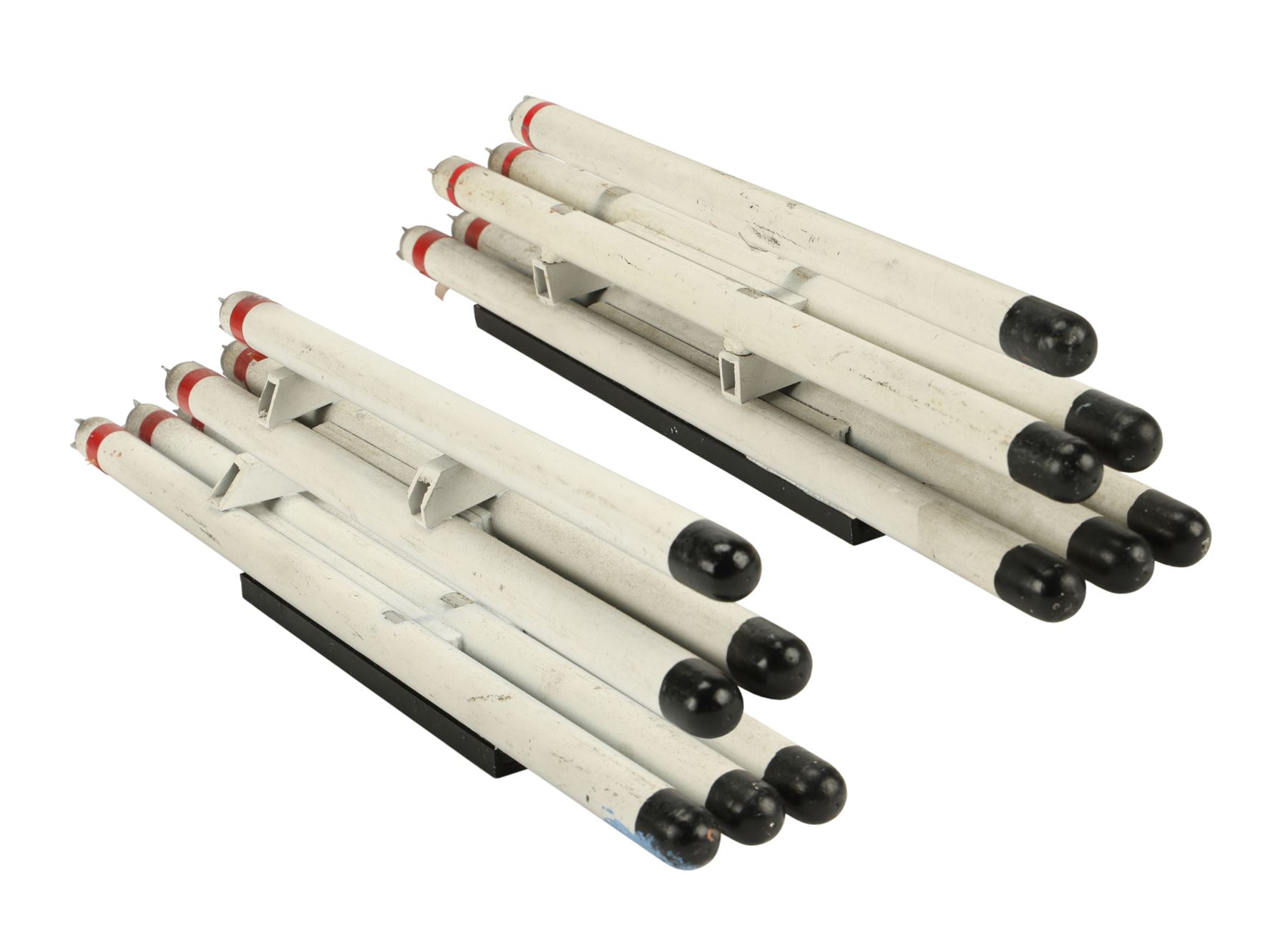 Original model miniature dropship missiles from James Cameron's sci-fi action sequel Aliens. Ellen Ripley (Sigourney Weaver) and an elite team of Colonial Marines used dropships to land on and later be evacuated from the planet LV-426. These missiles were designed to sit in the pods on the model's fold-out wings.