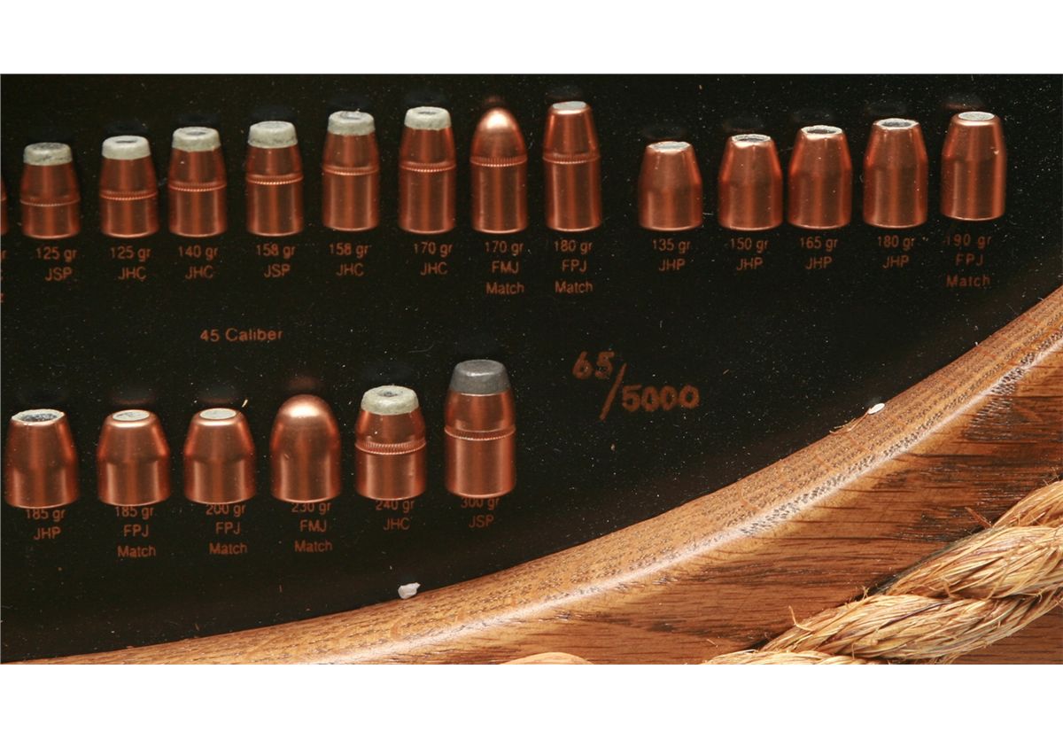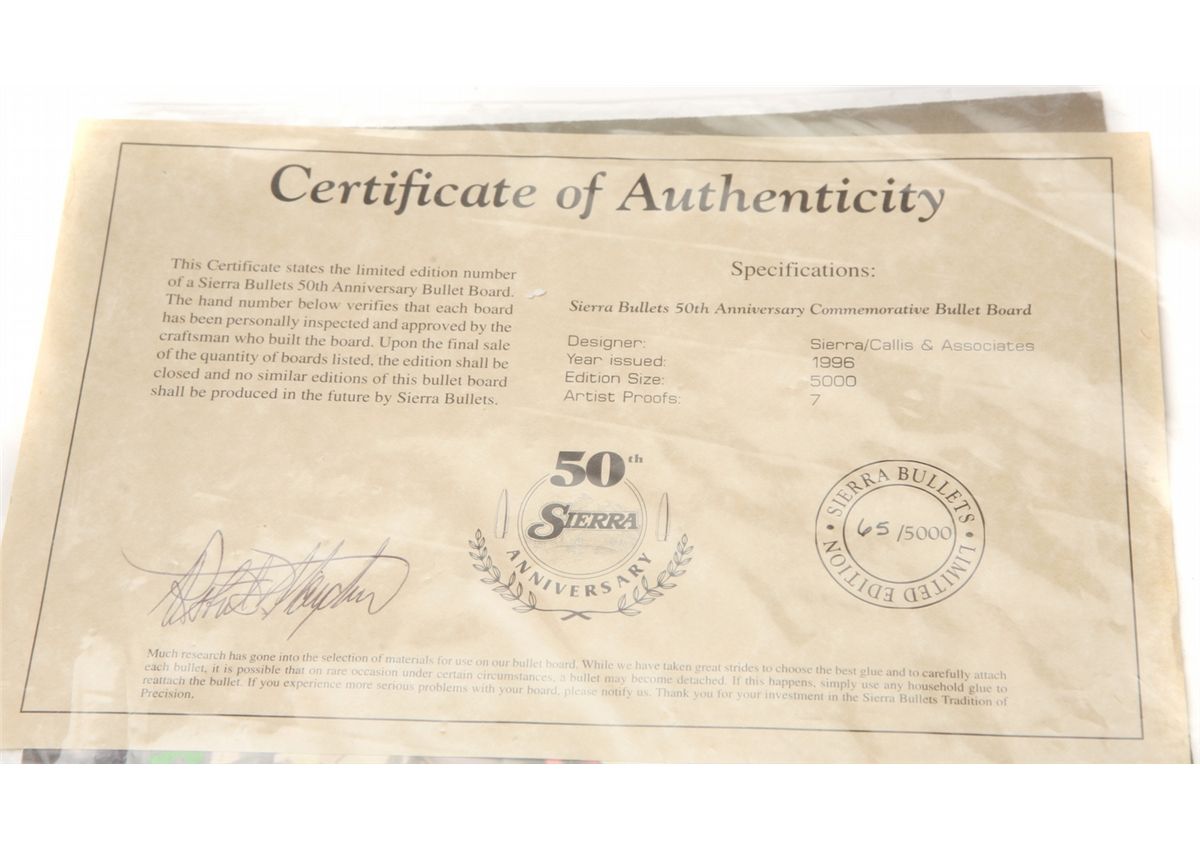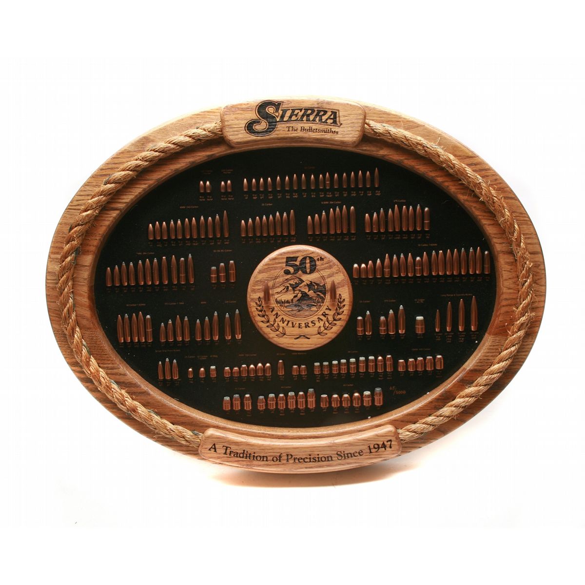 ANIB Limited Edition #65/5000 Sierra Wood frame 50th Anniversary bullet display board - rope trimmed solid oak oval frame & accents - features 158 handgun & rifle bullets - 24" x 19" framed size - with factory shipping box - non-ffl - 25VVFKIL086