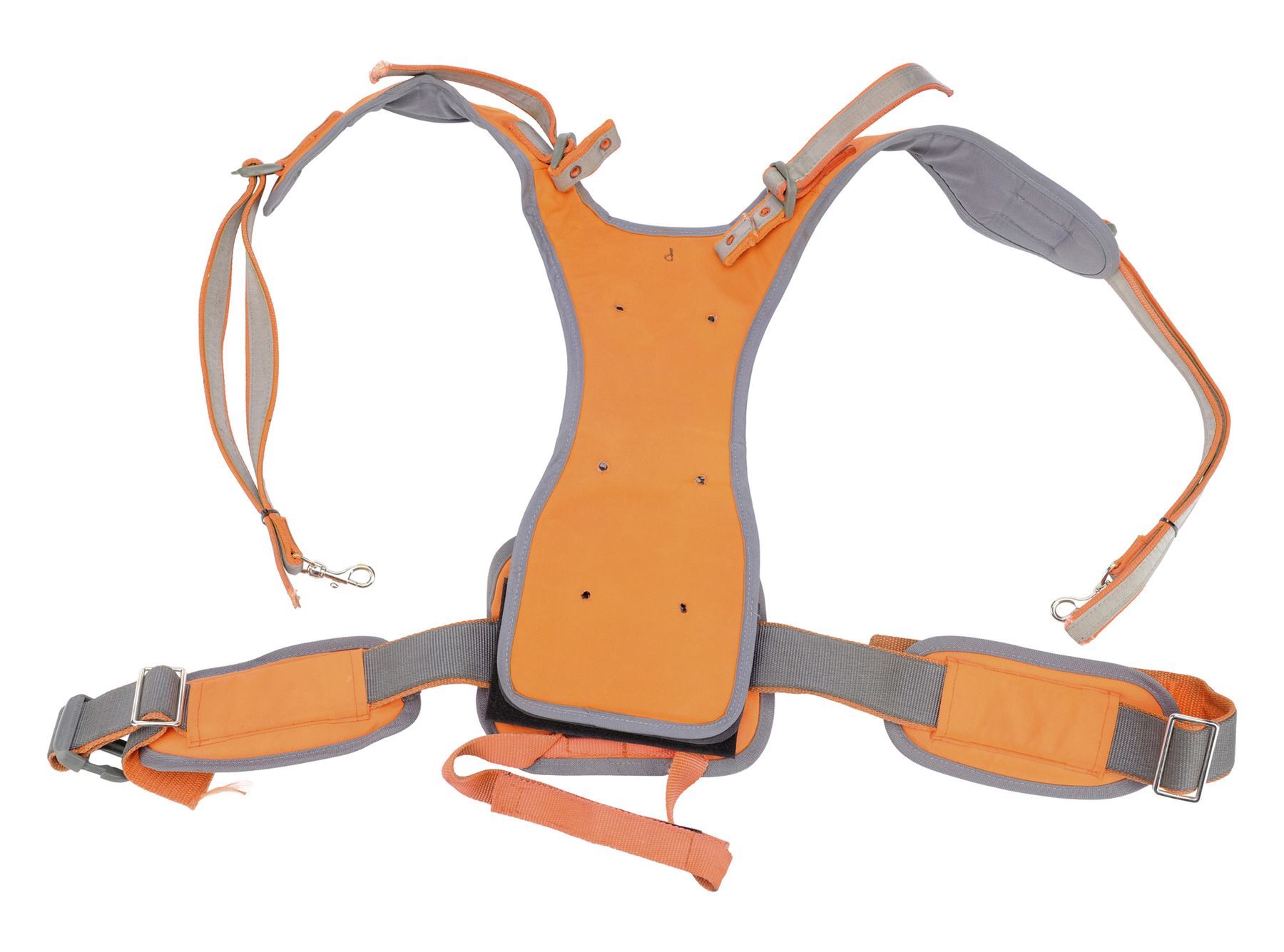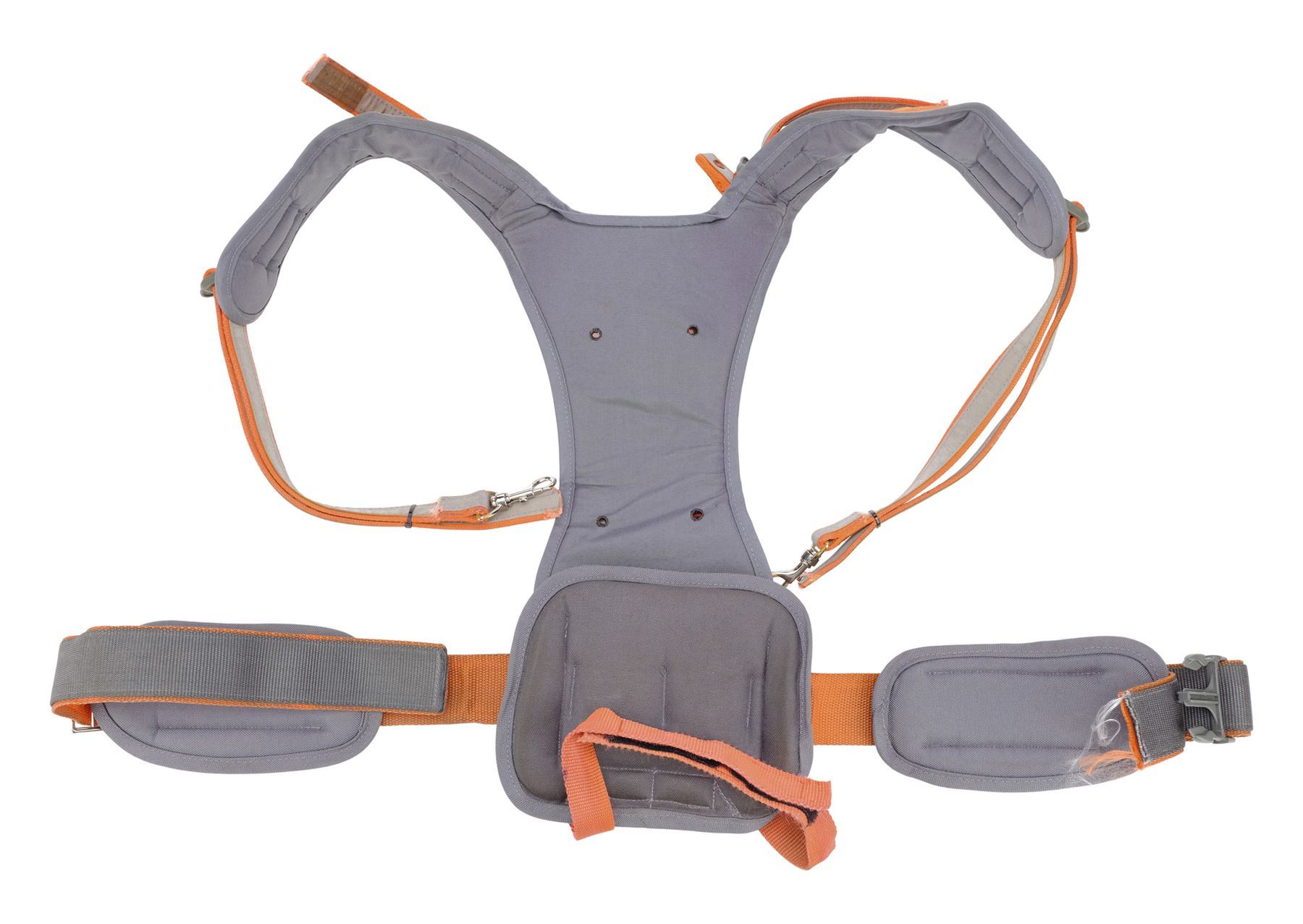 This lot consists of a silver-color metal proton wand with a gray-color resin casing and metal handles; a gray and orange canvas padded harness; and a metal, acrylic, and urethane proton pack with various metal cables and wires. This lot exhibits minor scuffs from production. Dimensions: 22" x 14" x 8.5" (56 cm x 35.75 cm x 21.75 cm)