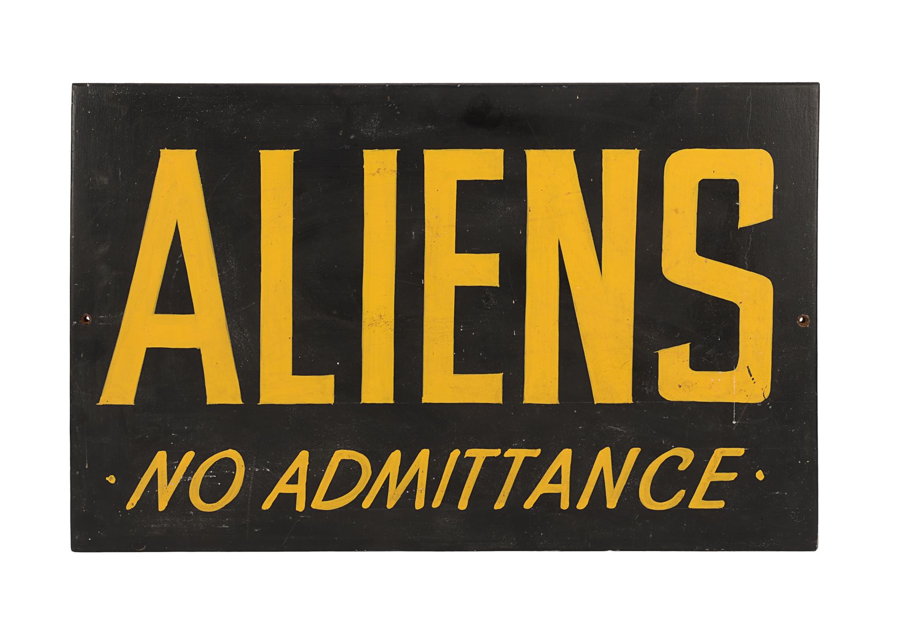 A sign from the model workshop on the production of James Cameron's sci-fi action sequel Aliens. This wood sign is painted black with "Aliens - No Admittance" painted in large yellow lettering. It was fixed to a wall at the model workshop during production and has a screw hole at each end. It has some minor scuffing and staining from age and storage. Dimensions: 61 cm x 38 cm x 1.5 cm (24" x 15" x 1/2")