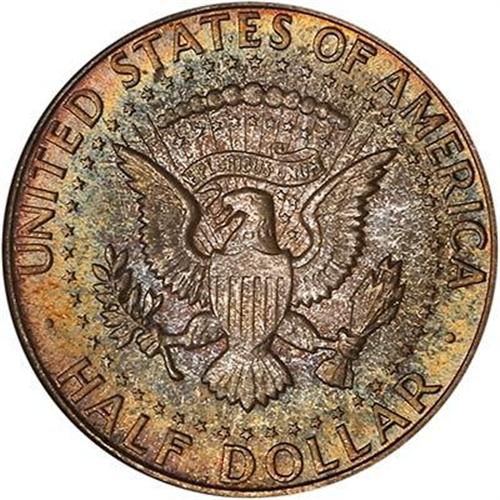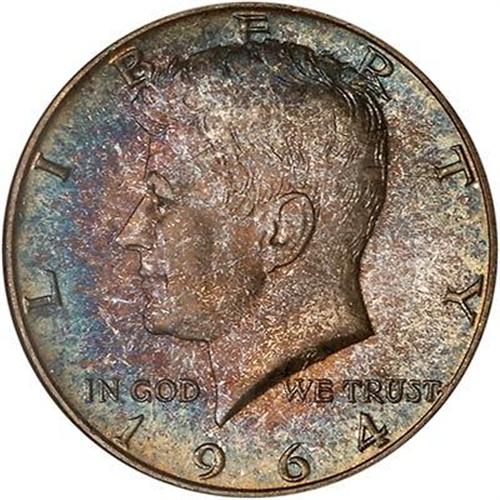 1964 Kennedy Half Dollar. Fabulous toning on this handsome Kennedy half dollar, the first and only 90% issue (later dates from 1965 to 1970 were struck on 40% clad composition). (#6706)