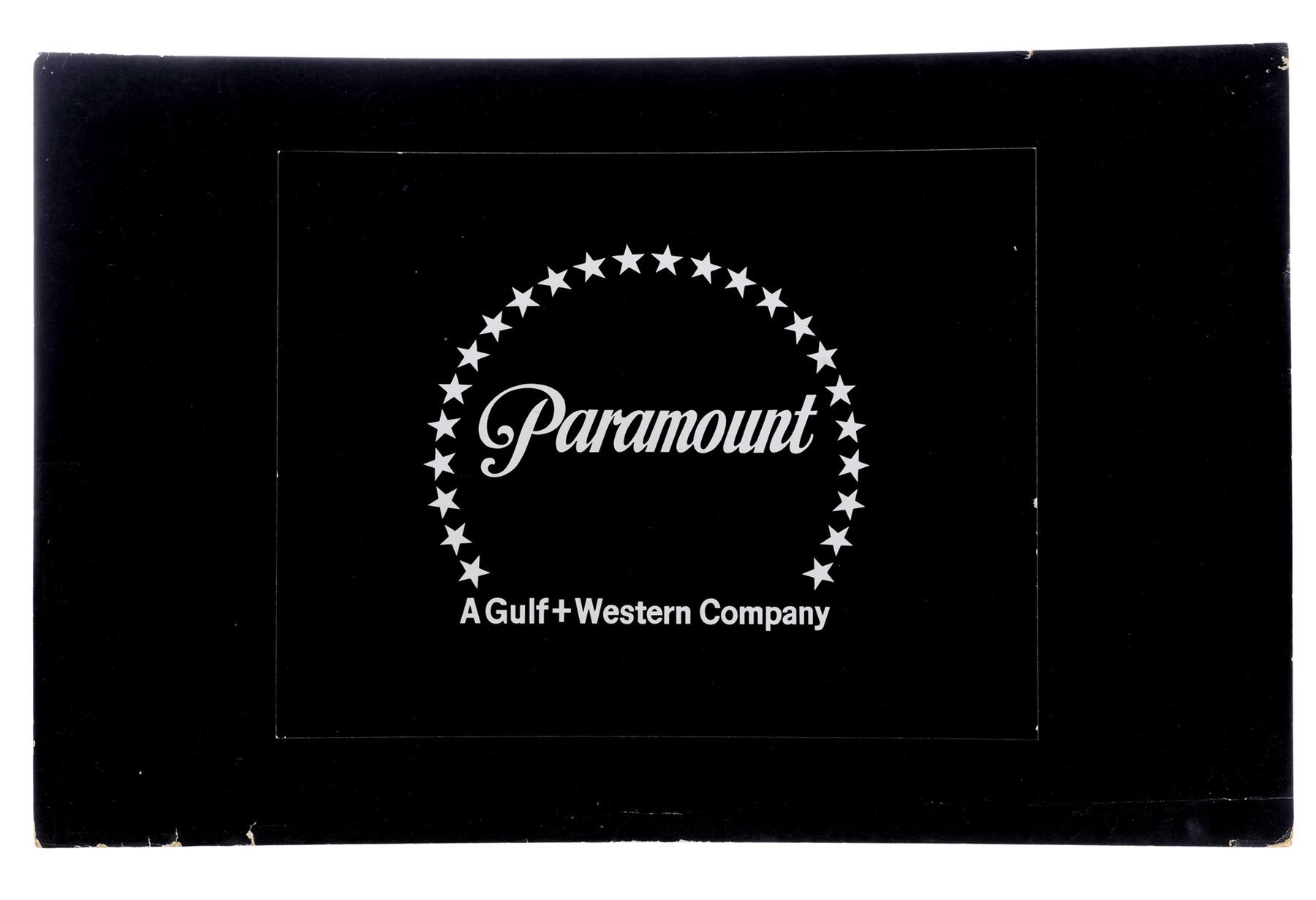 This lot features two production-used coated cardstock paper cards used in The Godfather's final cut. The Paramount card features the printed logo and thicker typeface where curlicues are pronounced, and is mounted on a black cardstock. The Godfather card features an off-white printed logo on a black background. The lot exhibits tears, scuffing, edge wear, creasing, and residual tape residue. Dimensions: 22" x 14" x 0.25" (56 cm x 35.5 cm x 0.75 cm)