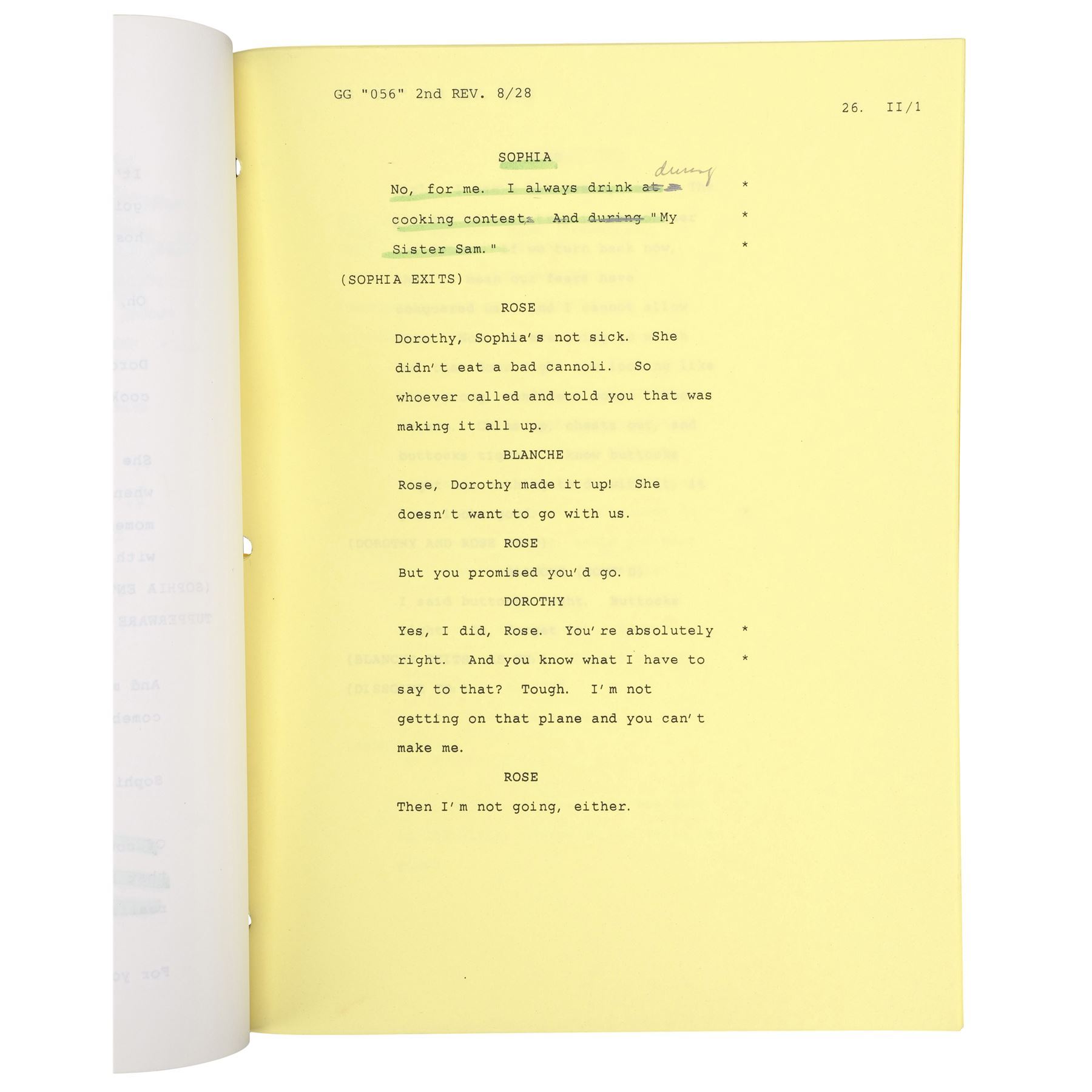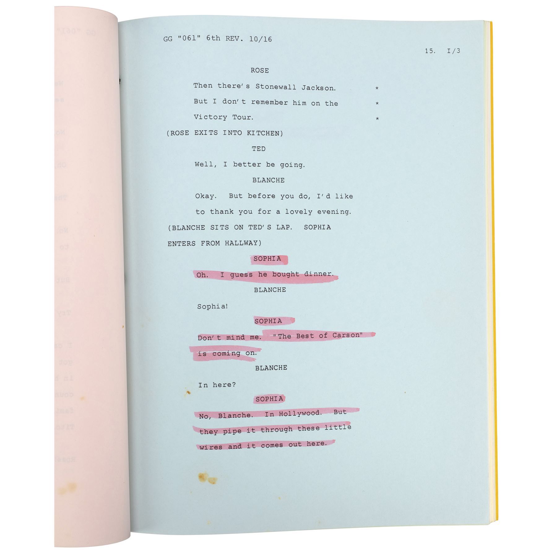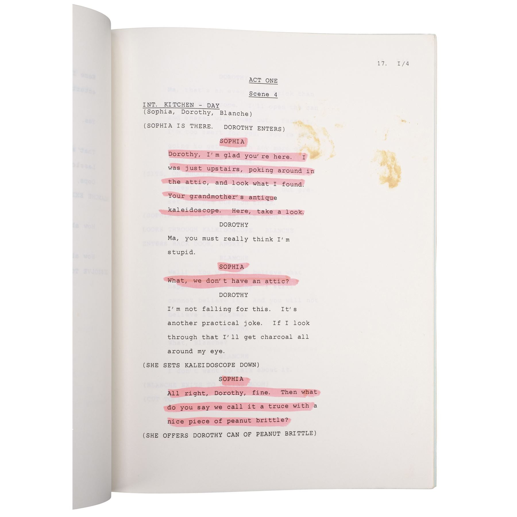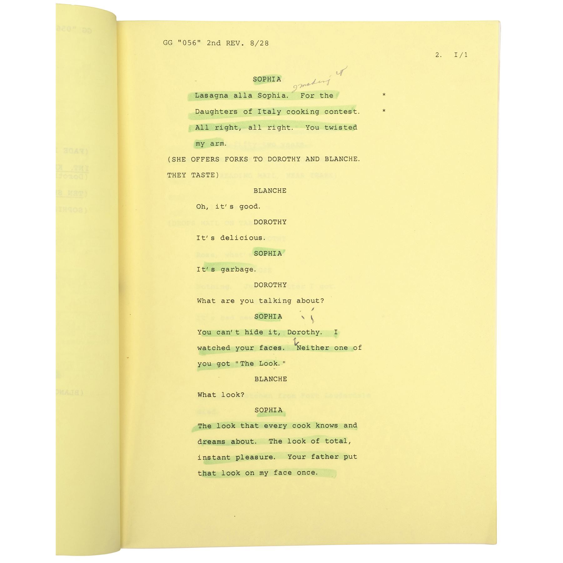 This lot comes from the collection of Estelle Getty's personal assistant and friend, Rich Weaver. It consists of one 35-page final draft script from the Season 6 episode "Never Yell Fire in a Crowded Retirement Home: Part 2" autographed "Love and Laughter Estelle Getty" in ink; and seven final draft scripts featuring highlighter annotations and "Estelle Getty" on the covers. This lot exhibits minor stains. Dimensions: 8.5" x 11" x 0.25" (21.75 cm x 28 cm x 0.75 cm)