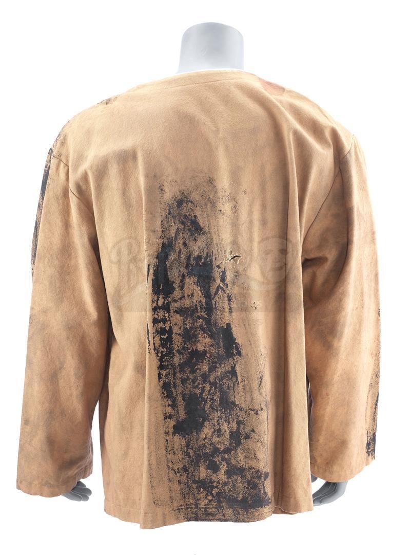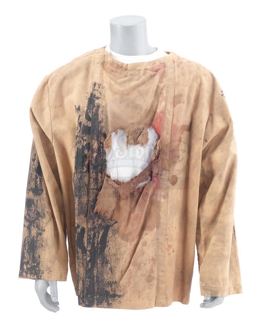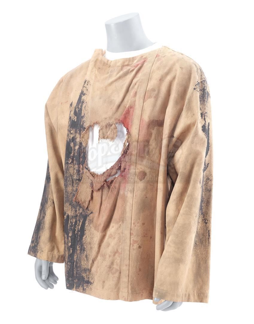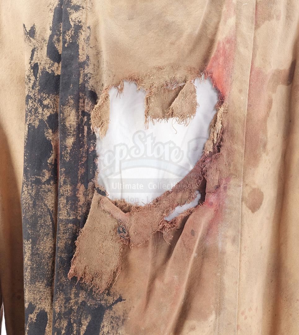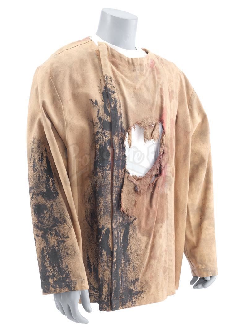 This lot will be auctioned on Wednesday, June 30th. The auction will begin at 9:00am PDT and lots are sold sequentially via live auctioneer; tune in to the live streaming broadcast on auction day to follow the pace. Note other lots in the auction may close on June 29th or July 1st. Old Joe's (Bruce Willis) shotgun-blasted jacket with shirt from Rian Johnson's sci-fi crime action film Looper. Assassin Joe wore the jacket as he was sent to the past to be shot by his younger self (Joseph Gordon Levitt). This lot consists of a white cotton shirt and a tan canvas jacket with a full-length zipper. The jacket displays paint and dirt smears and faux blood on the front shoulder. A large buckshot hole is torn from the front center, and "3" and "B" are written on the inside collar. This item exhibits signs of wear from production use and intentional distressing, and remains in excellent overall condition. Estimate: $1,200 - 1,800