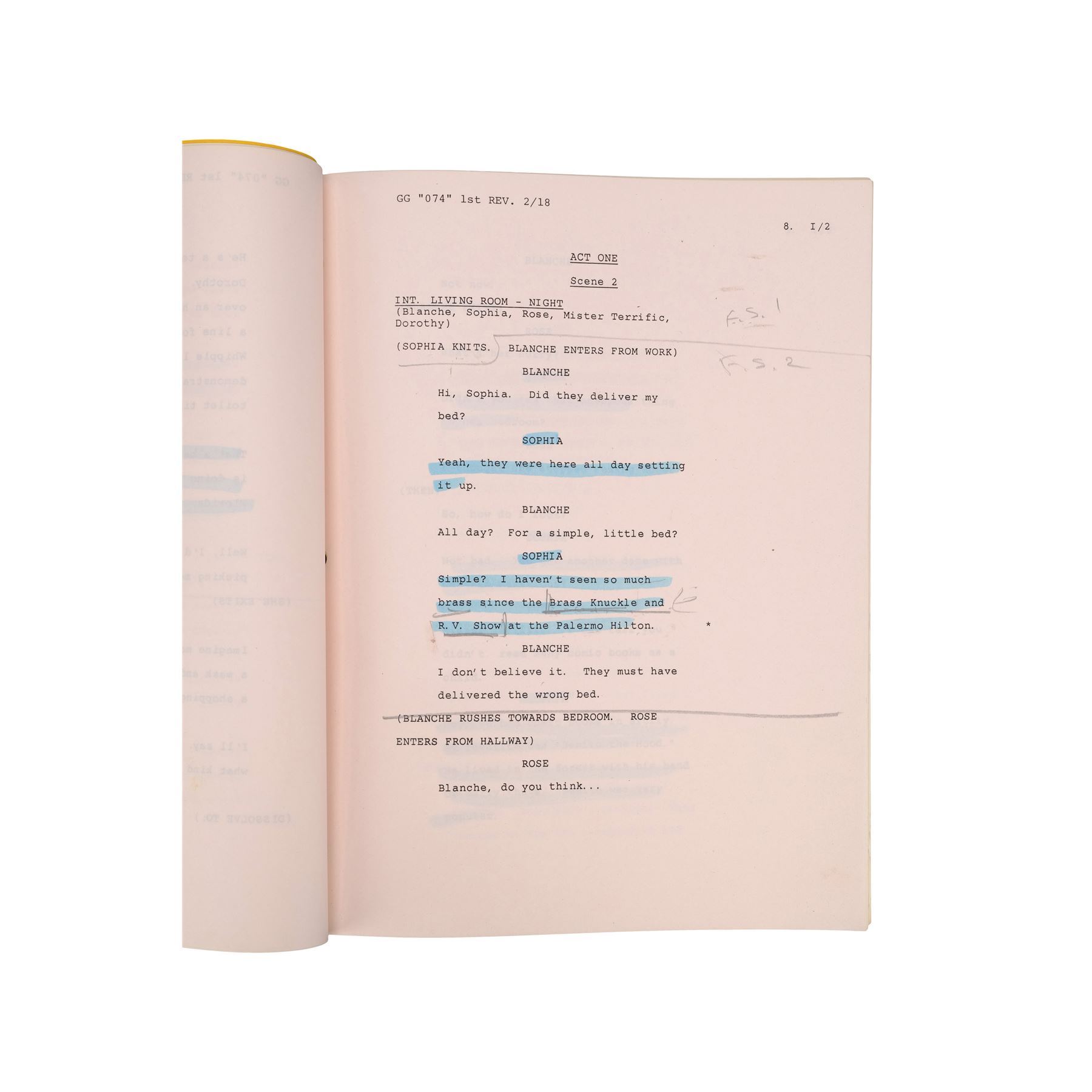 This lot comes from the collection of Estelle Getty's personal assistant and friend, Rich Weaver. It consists of one 54-page final draft script from the Season 2 episode "Dorothy's Prized Pupil" autographed "Estelle" in black ink; and seven final draft scripts from Season 3, including a 54-page script from "Blanche's Little Girl" with paperclipped pages and a 45-page script from "Rose's Big Adventure" with handwritten notes. These scripts feature highlighter annotations and are labeled "Estelle Getty." This lot exhibits minor fold creases. Dimensions: 8.5" x 11" x 0.25" (21.75 cm x 28 cm x 0.75 cm)