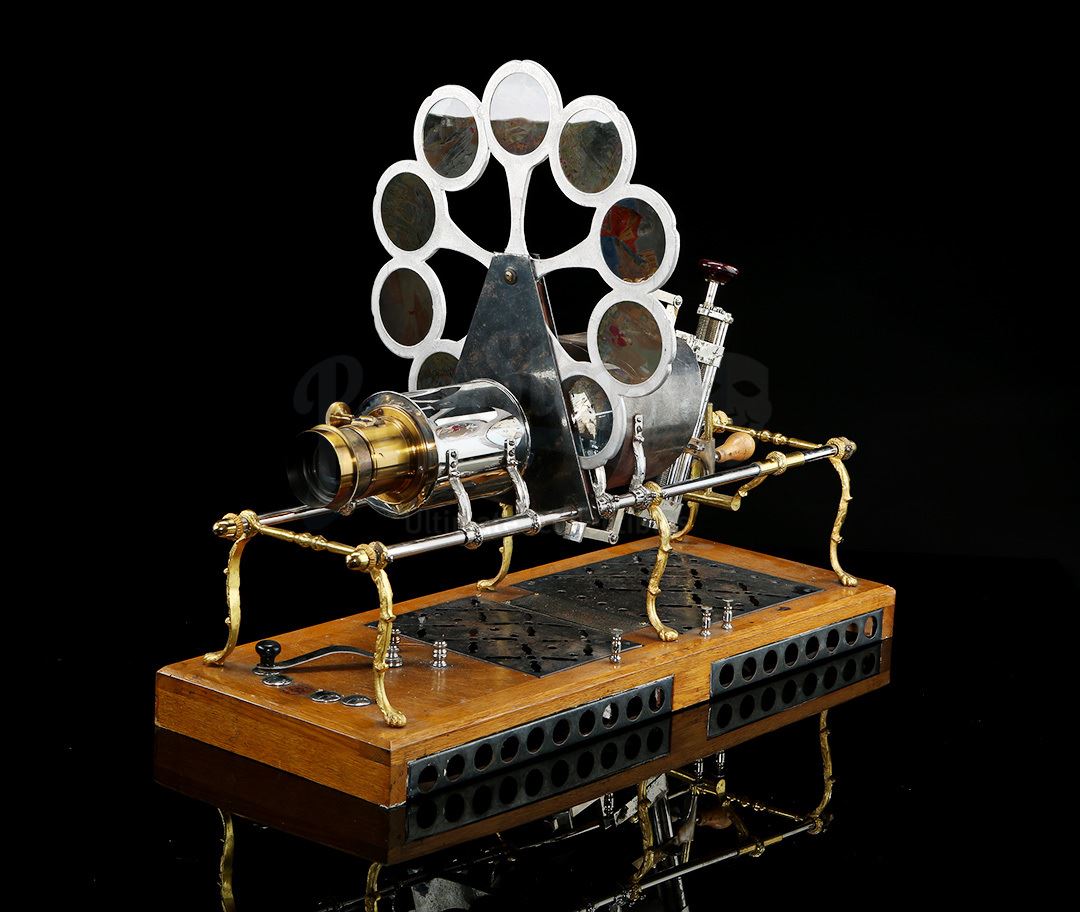 A Sciopticon magic lantern with revolving discs and transport chest from the Pettibone Manufacturing Company. The Sciopticon was patented in 1888 and used to project images painted on glass through lenses that capable of focusing candle light and, later, electrical light. This lantern comes from the collection of Star Wars: Return of the Jedi producer Howard Kazanjian.