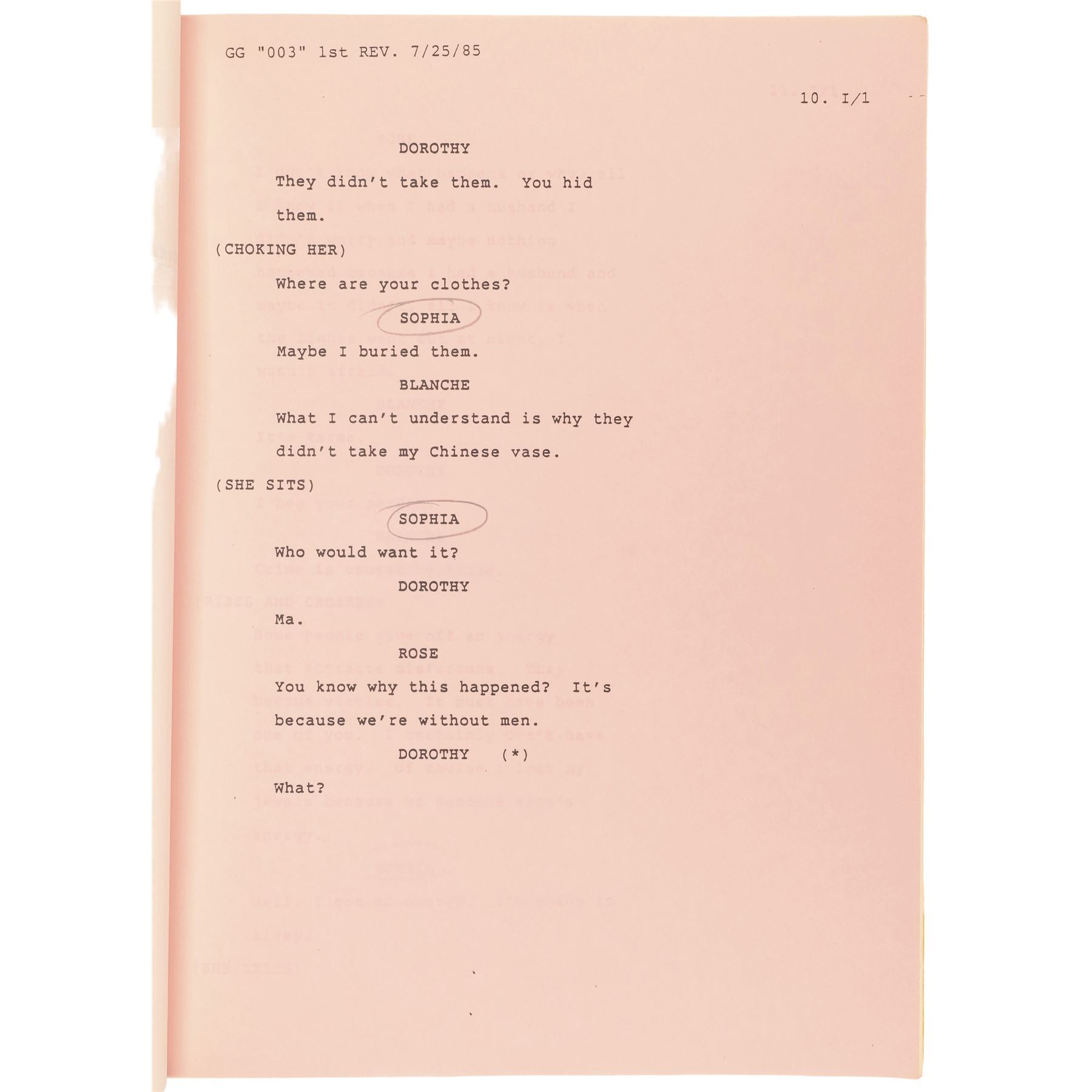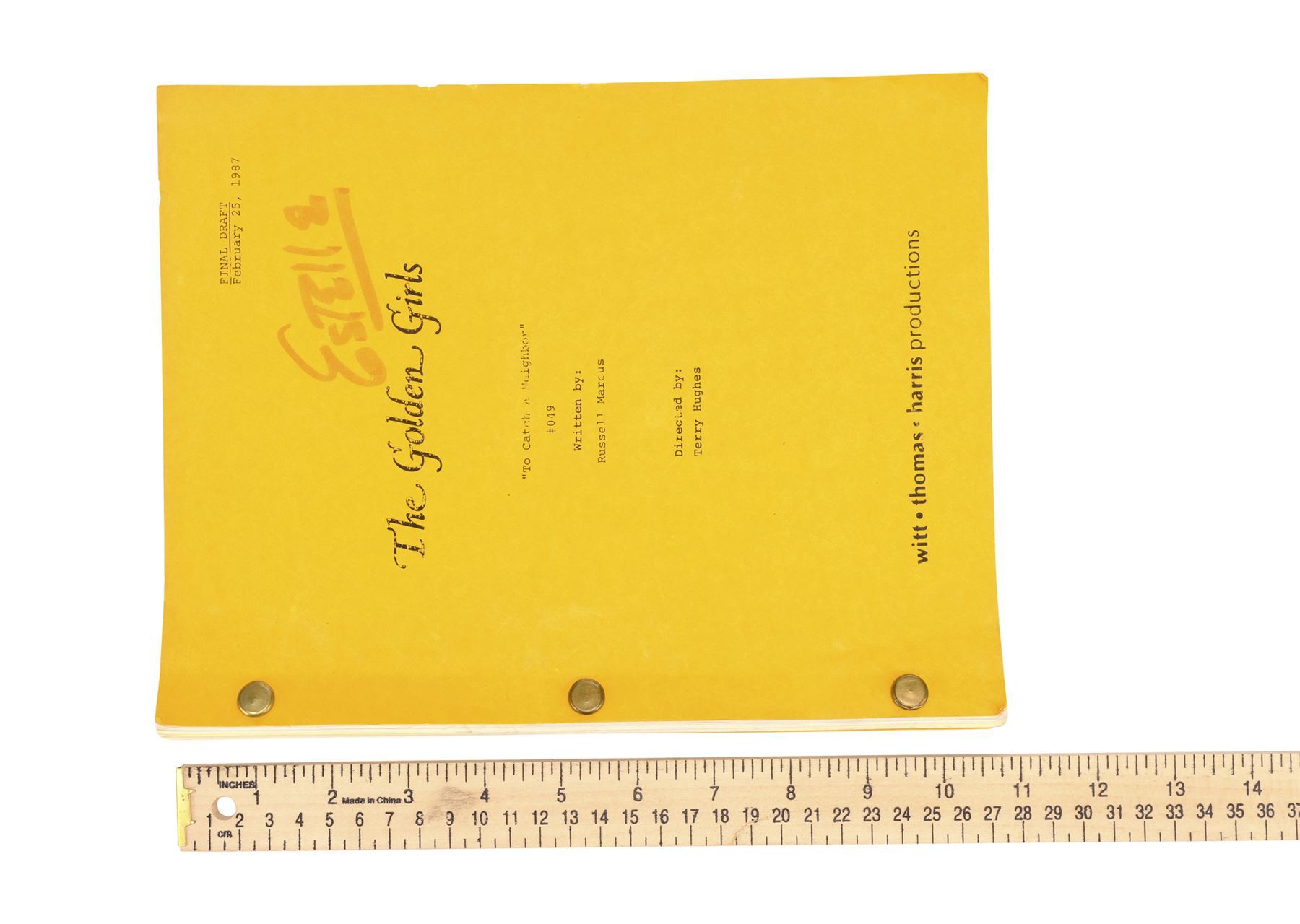 This lot comes from the collection of Estelle Getty's personal assistant and friend, Rich Weaver. It consists of one final draft script for the Season 2 episode "To Catch A Neighbor" signed "Estelle"; and seven final draft scripts from "Home Again Rose, Part I," "Home Again Rose, Part II," "Rose: Portrait of a Woman," and "Guess Who's Coming to the Wedding?" The scripts are labeled and marked for Getty with highlighting. This lot exhibits minor creases from handling and stains. Dimensions: (each) 8.5" x 11" x 0.25" (21.75 cm x 28 cm x 0.75 cm)