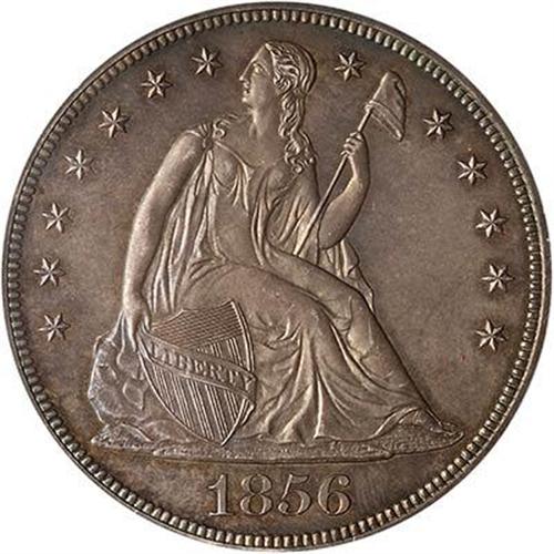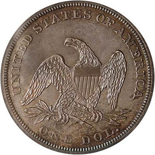 1856 Liberty Seated Dollar. Lovely deep antique toned iridescence adorns both sides with a remarkable absence of heavy hairlines. Mirrored fields shine forth powerfully at all angles, and they form a splendid backdrop to more razor-sharp and frosted devices. Nicely cameoed in finish under the toning, and sharply struck over all features including the key area at the top of the eagle's left (facing) wing. Indeed, for the grade, this is a distraction-free example.